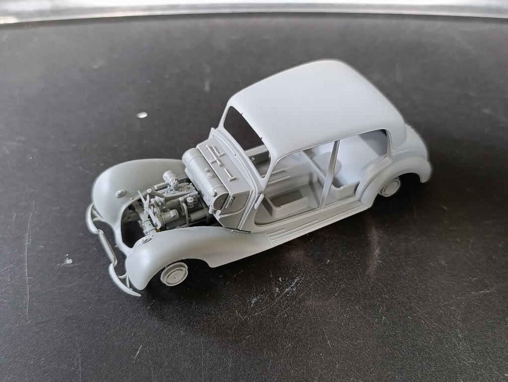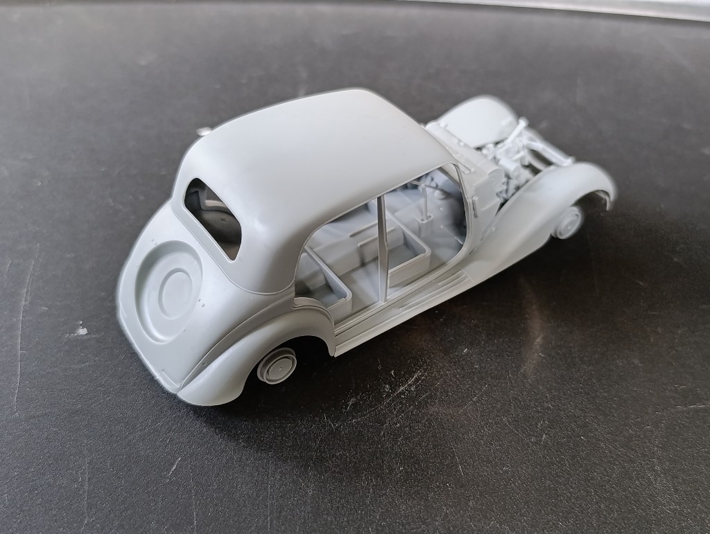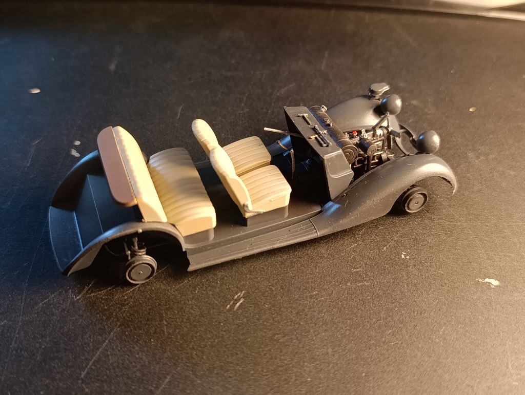 Das schöne an Miniart-Bausätzen ist, man kann erstmal lange darauf los bauen, bis überhaupt erstmal Farbe benötigt wird. Der Mercedes erschien in dieser Form bereits 2016, die Erstauflage stammte von 2012, mittlerweile gibt es von dem 170V17 Auflagen in Zivil und Militär und mit Cabrio, Limousine, Pritsche und Koffer oder Kastenaufbau.