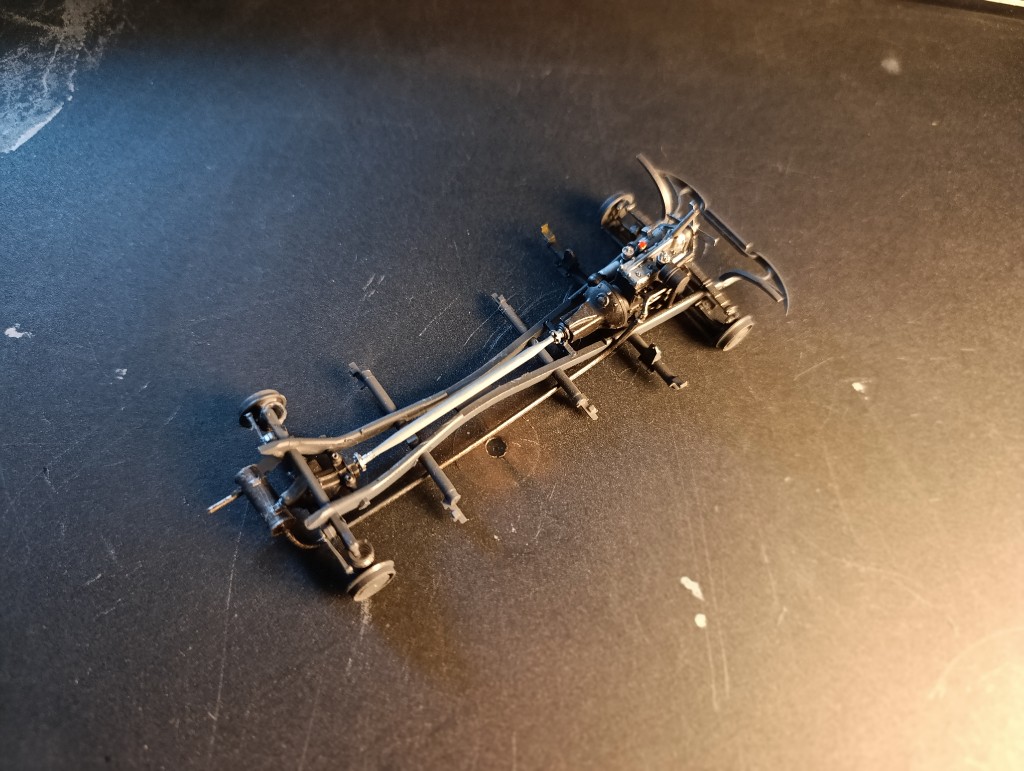 Ich habe dann auch schon den Fahrzeug Rahmen begonnen zu bauen. Da wird dann erstmal klar, dass trotz großem Karton, ein ziemlich kleines Auto daraus wird