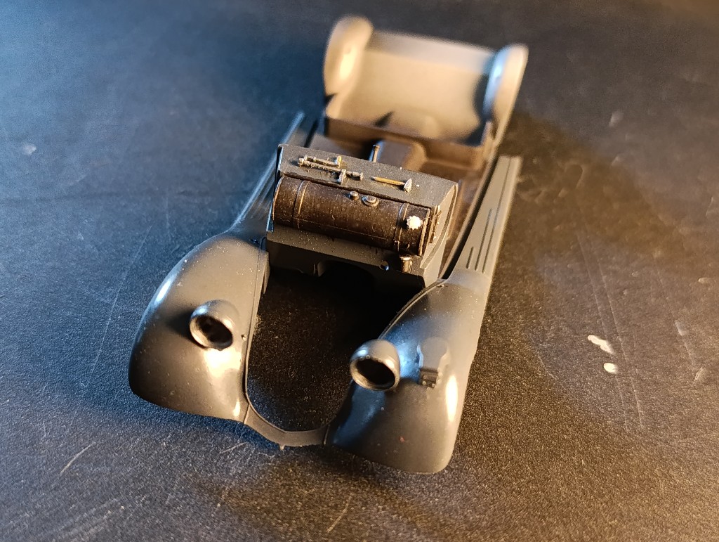 Außerdem habe ich schon Mal die Motorrückwand gebaut. Hier sitzt auch der Tank und ein bisschen Werkzeug. Immerhin konnte der Autohalter damals noch selbst Hand anlegen, ohne erst an einem Computer die Fehler auszulesen.