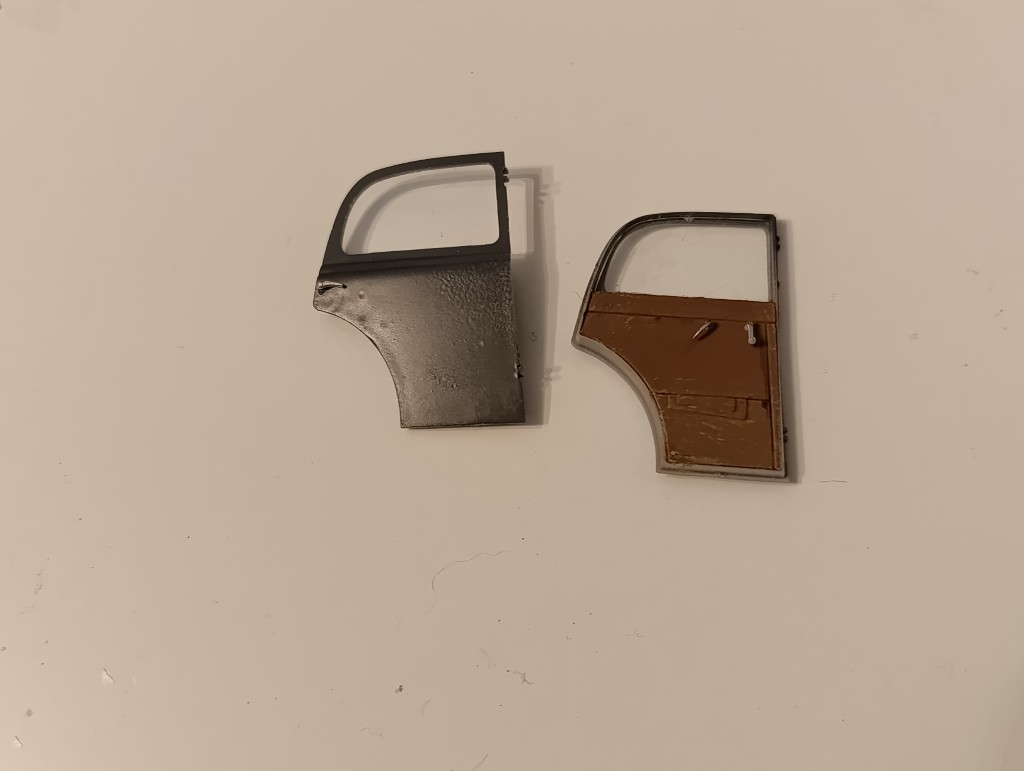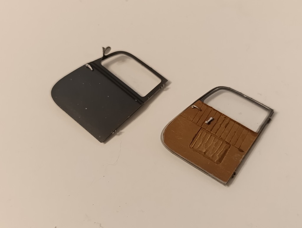 Wie ihr seht fehlen noch die Türen, hier mussten die Scheiben eingesetzt werden, ebenso Türgriffe und Fensterkurbel. Außerdem vorne der Seitenspiegel