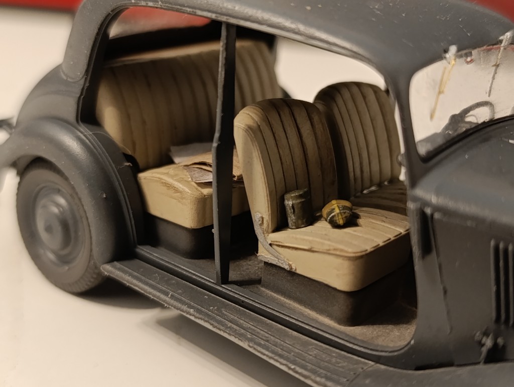 Und auf den Sitzbanken habe ich ein paar Karten und Berichte hinten verteilt (nicht im Bild eine P08 Luger) und vorne Geschirr und Feldflasche