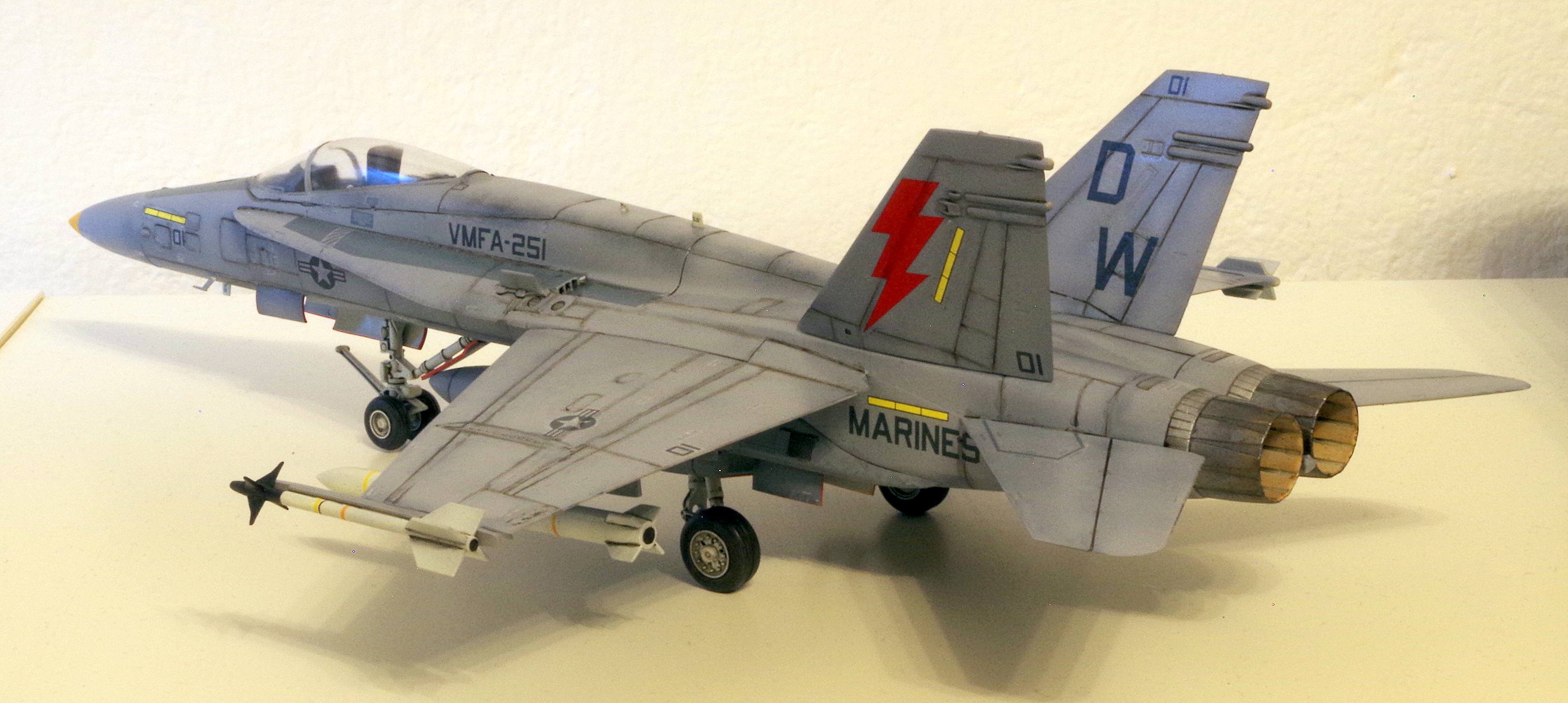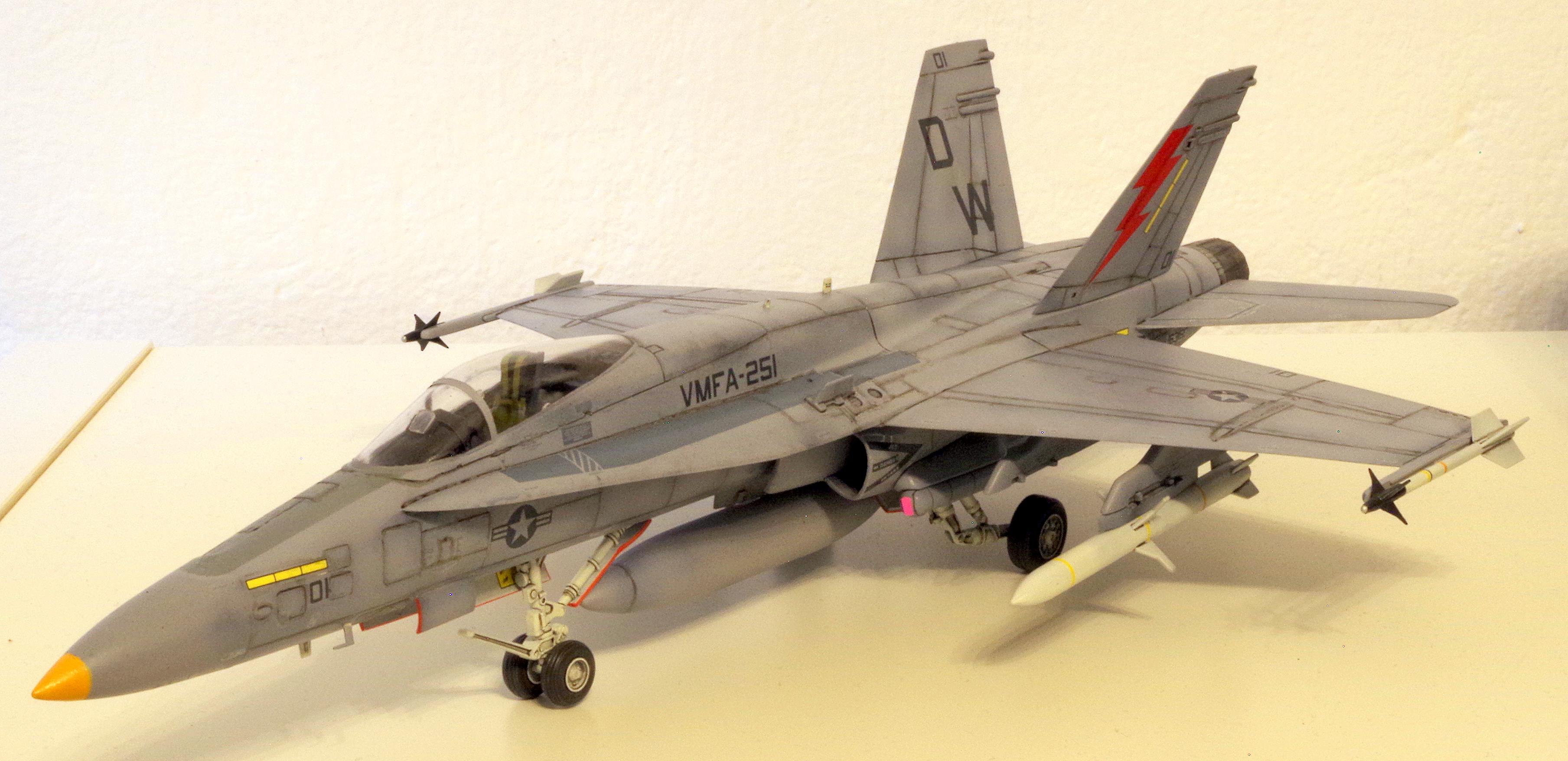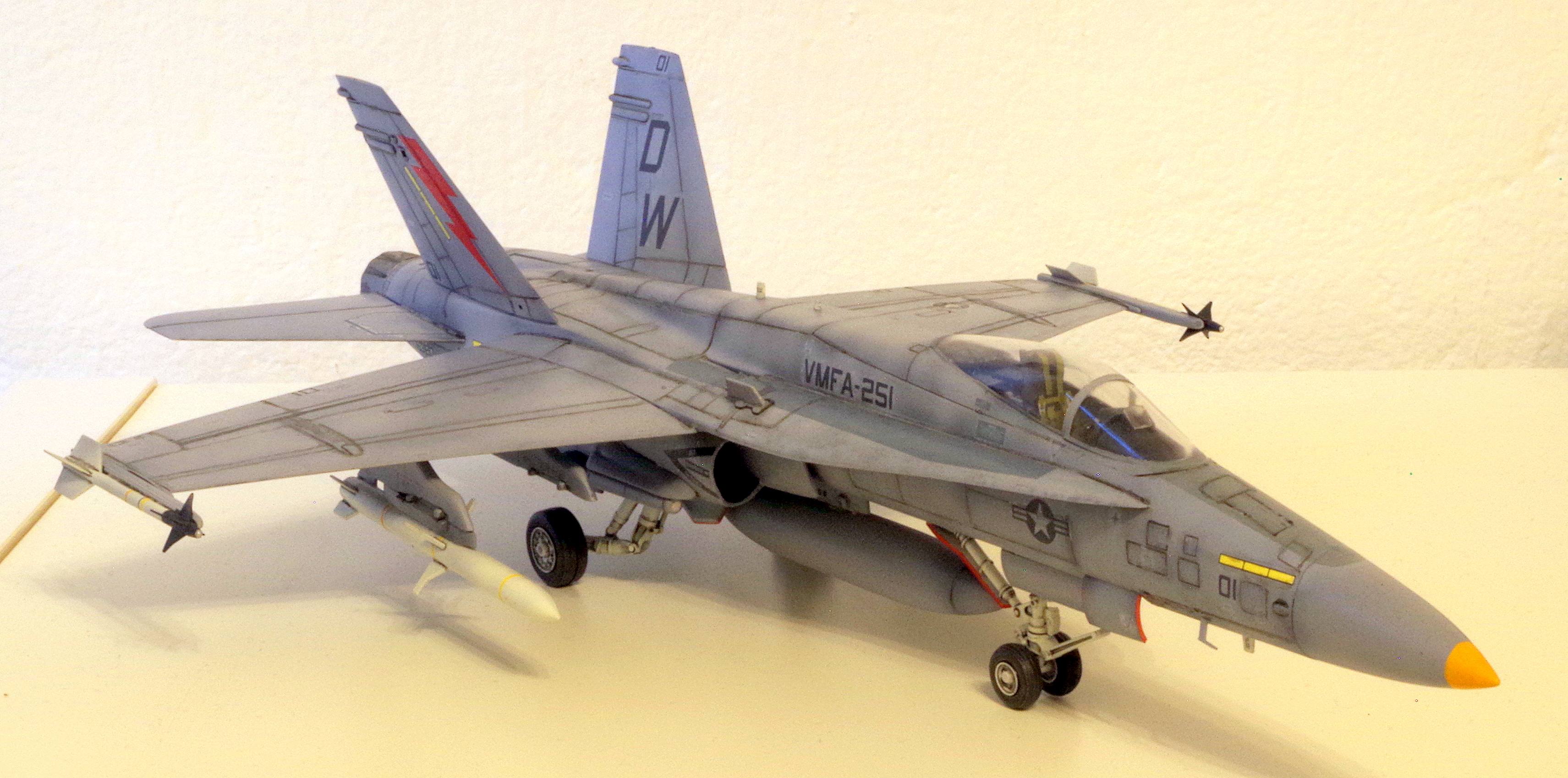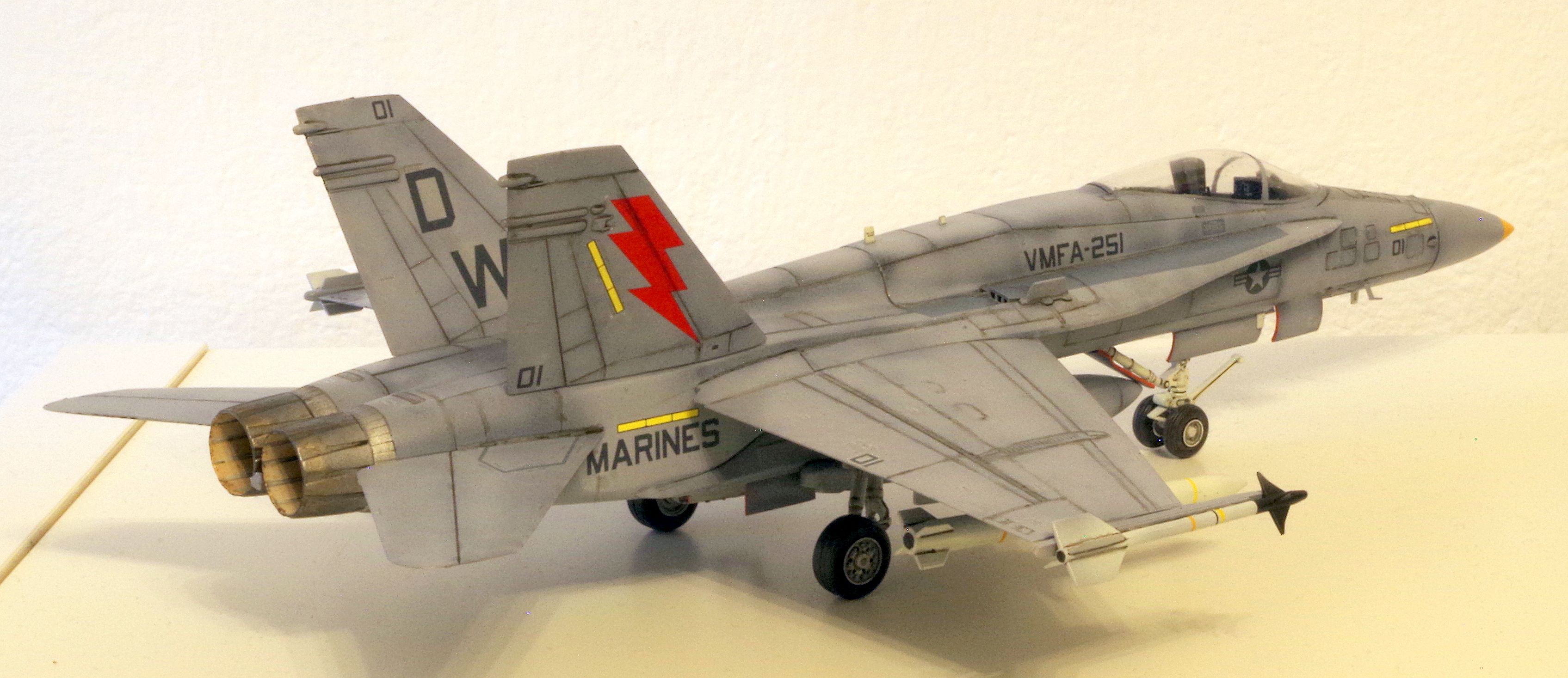 Leider waren die Decals schon ziemlich vergilbt und es wurden auch nur die allernötigsten mitgeliefert. Glücklicherweise konnte ich auf dem Aftermarket ein paar schöne Decals der Firma Hi Decal Line finden. Neben den „Haupt“-Decals (VMFA 251 „Thunderbolts“) gab es noch einen passenden und sehr umfangreichen Satz Stencils. Die Decals ließen sich wunderbar verarbeiten! (Dass der Schnäppchenpreis dadurch wieder relativiert wurde, konnte ich an der Stelle verschmerzen.)