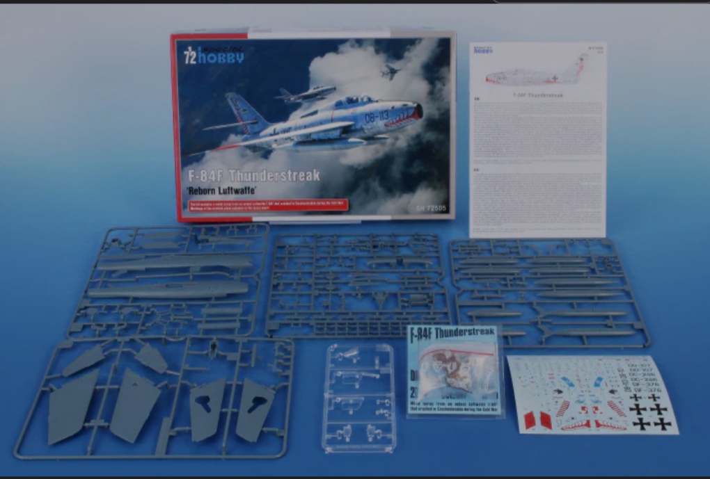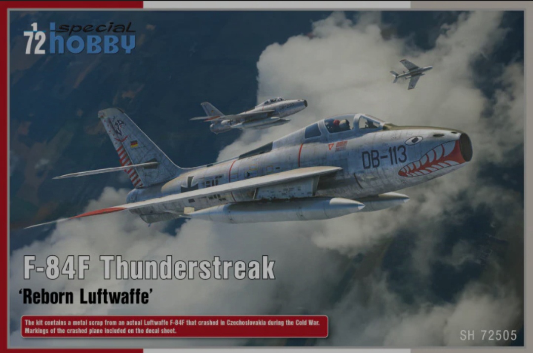 Die Ursprüngliche Bausatzform ist noch relativ frisch und erschien im Oktober 2023 mit US-Vorbildern , dicht gefolgt von der zweiten Auflage mit Französischen und Israelischen Flugzeugen während der Operation Musketier und dieses Jahr im April kam dann auch die dritte Auflage mit vier Flugzeugen der Bundesdeutschen Luftwaffe. Der Bausatz ist wohl mit Abstand der beste Bausatz einer F-84F den es aktuell auf dem Markt. Hier hat Special Hobby auch den Ruf des Kleinserienherstellers zurecht endgültig abgelegt (man muss hier sowieso bedenken daß der Hersteller schon seit Jahren für mehrere Firmen Bausätze entwickelt und auch Coperationen wie mit Revell oder ICM eingeht). Die Passung ist genial und die Details reichhaltig. Als kleines Gimmig erhalten wir sogar ein Trümmerteil einer in der Tschechoslowakei abgestürzten F-84F die man mit dem Markierungsbogen auch bauen kann.