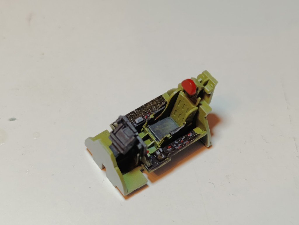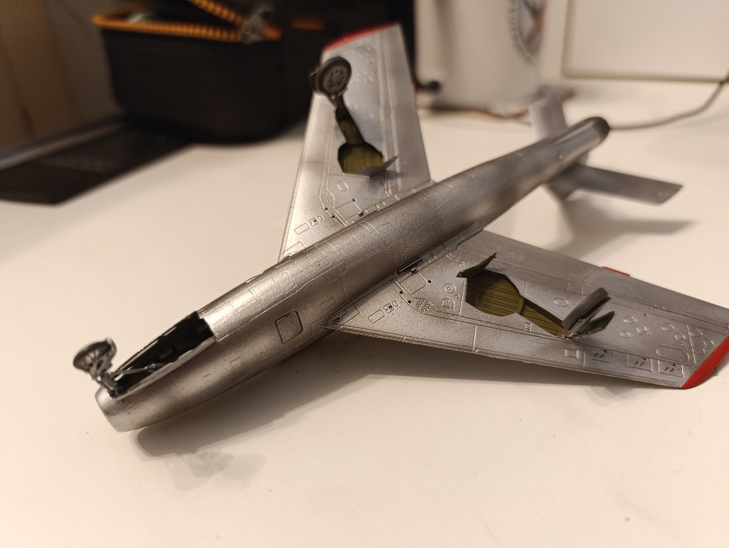 Mittlerweile ist dann auch das Fahrwerk verbaut, wobei das Bugrad Schwierigkeiten gemacht hat und nur wiederwillig passte. Aber dafür sind nun alle Details soweit bemalt und ein erster Glanzlack an ort und Stelle.