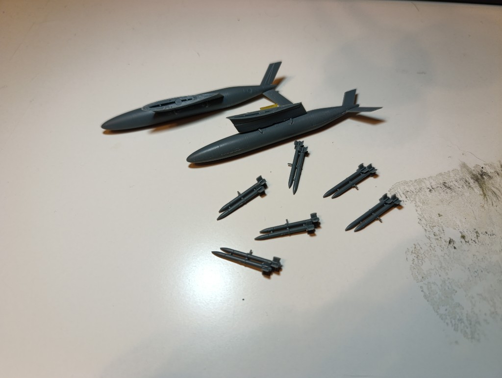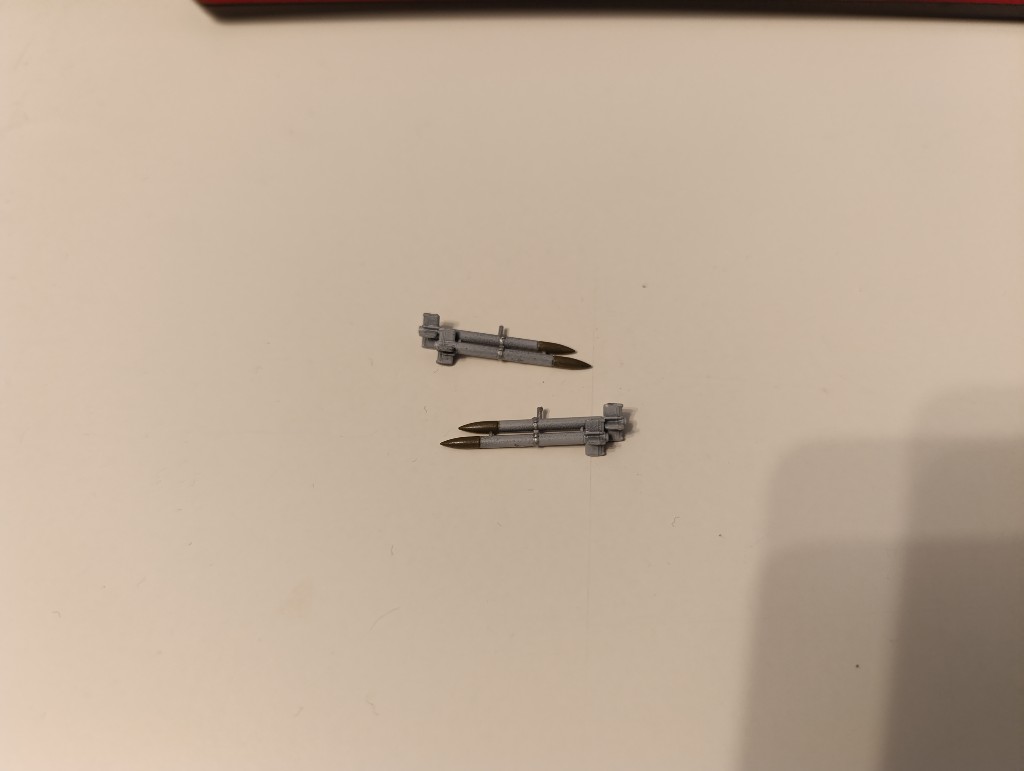 Anhängelast ist auch soweit bereit, konkret die beiden schon gezeigten Zusatztanks, aber auch die HVAR Luft-Boden-Raketen sind ausgeschnitten und zusammengesetzt.