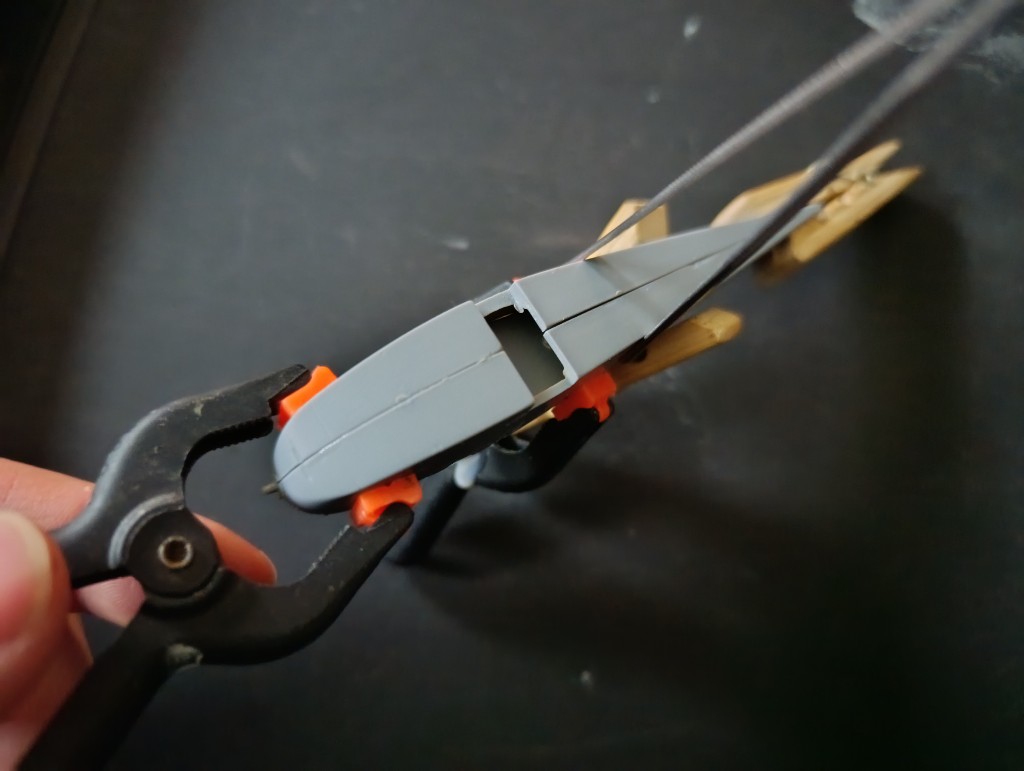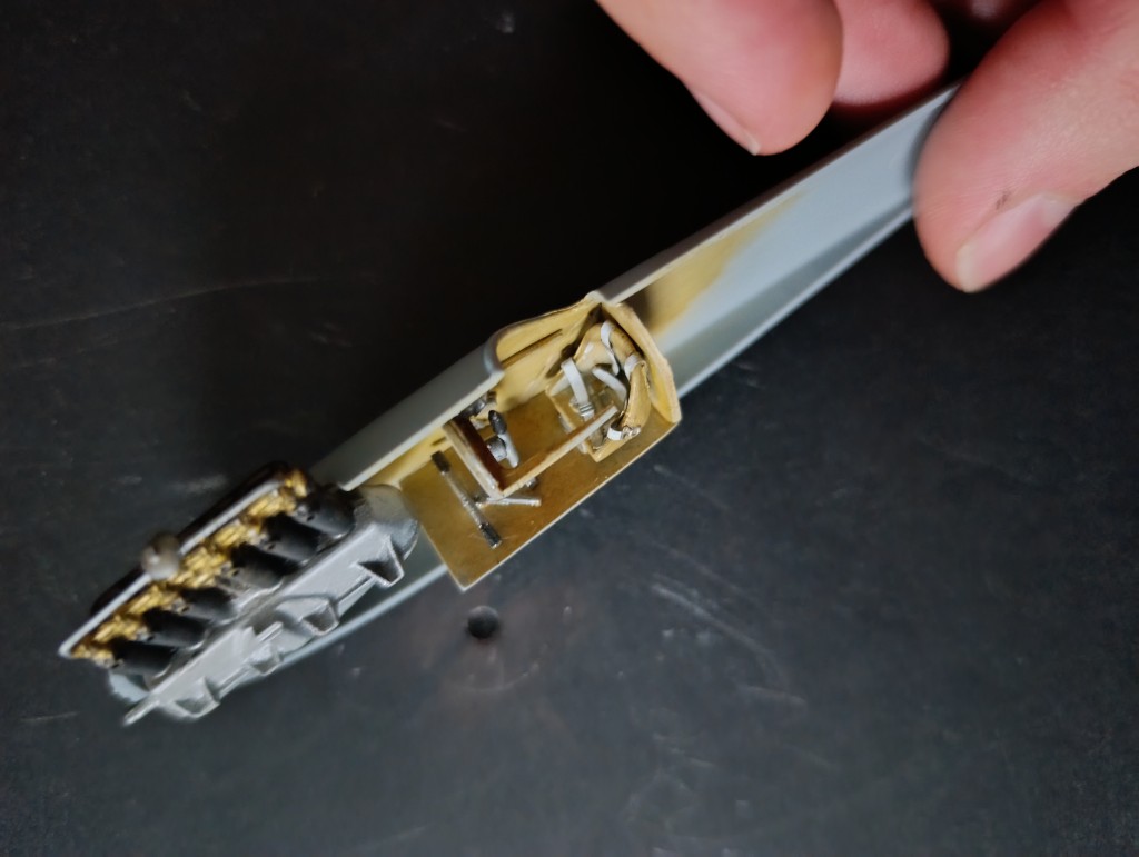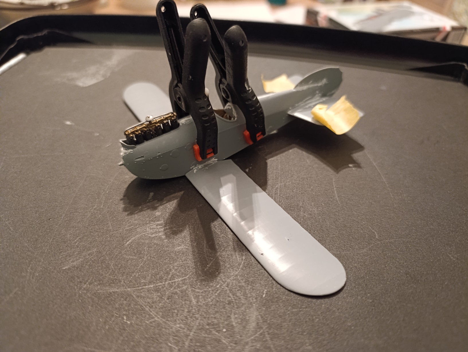 Wie zu sehen ist konnte ich einiges hier machen, so sind Flügel angebracht. Dummerweise ist die Trennstelle zwischen dem Rumpf an einigen Stellen aufgebrochen, das heißt nochmals spachteln, an dem Übergang ja so wieso.