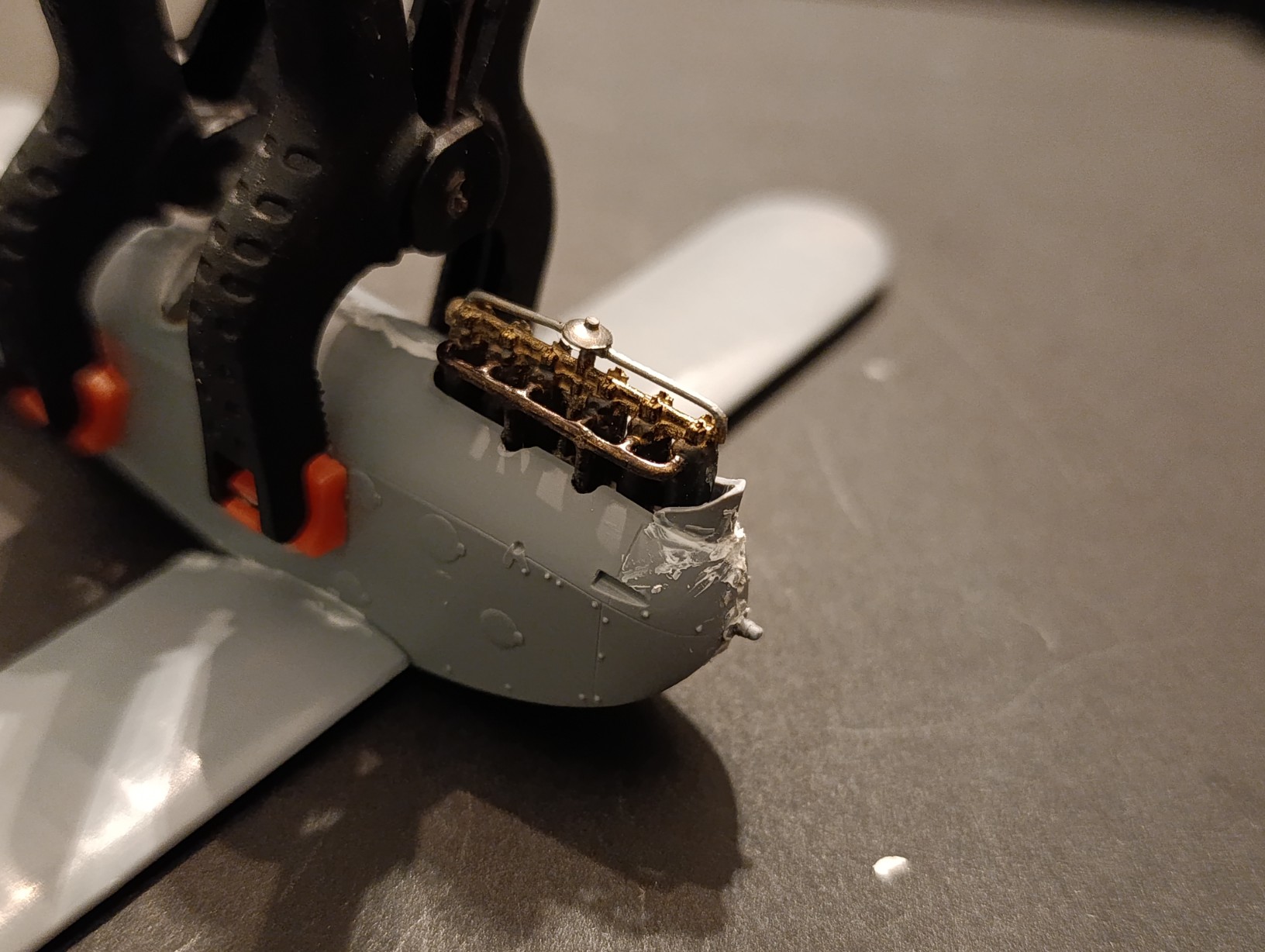 Damit der Motor überhaupt in den Rumpf passt, musste ich Löscher in den Rumpf schnitzen, dort wo später die Abgasrohre sitzen. Der Motor sitzt nun ganz gut und hoffentlich einigermaßen gerade.