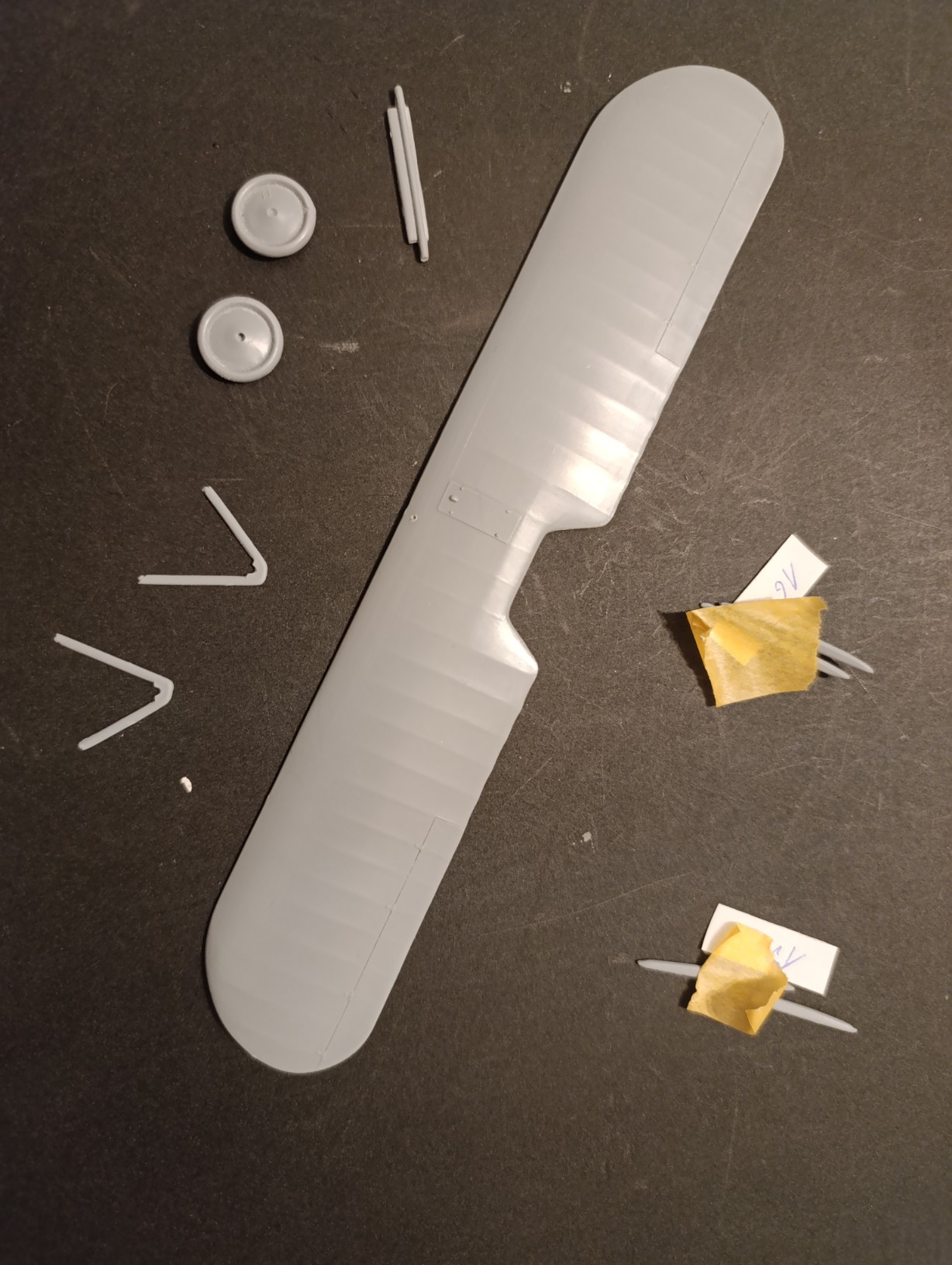 Da ich auch so langsam an das Lackieren denke, habe ich gleich alle Anbauteile, die sowieso erst nachdem Lackiert angebracht werden können, ausgetrennt. Da die Streben vorne und hinten sehr gleich aussehen, habe ich diese mit Tape fixiert und die Teile Nummer aufgeschrieben