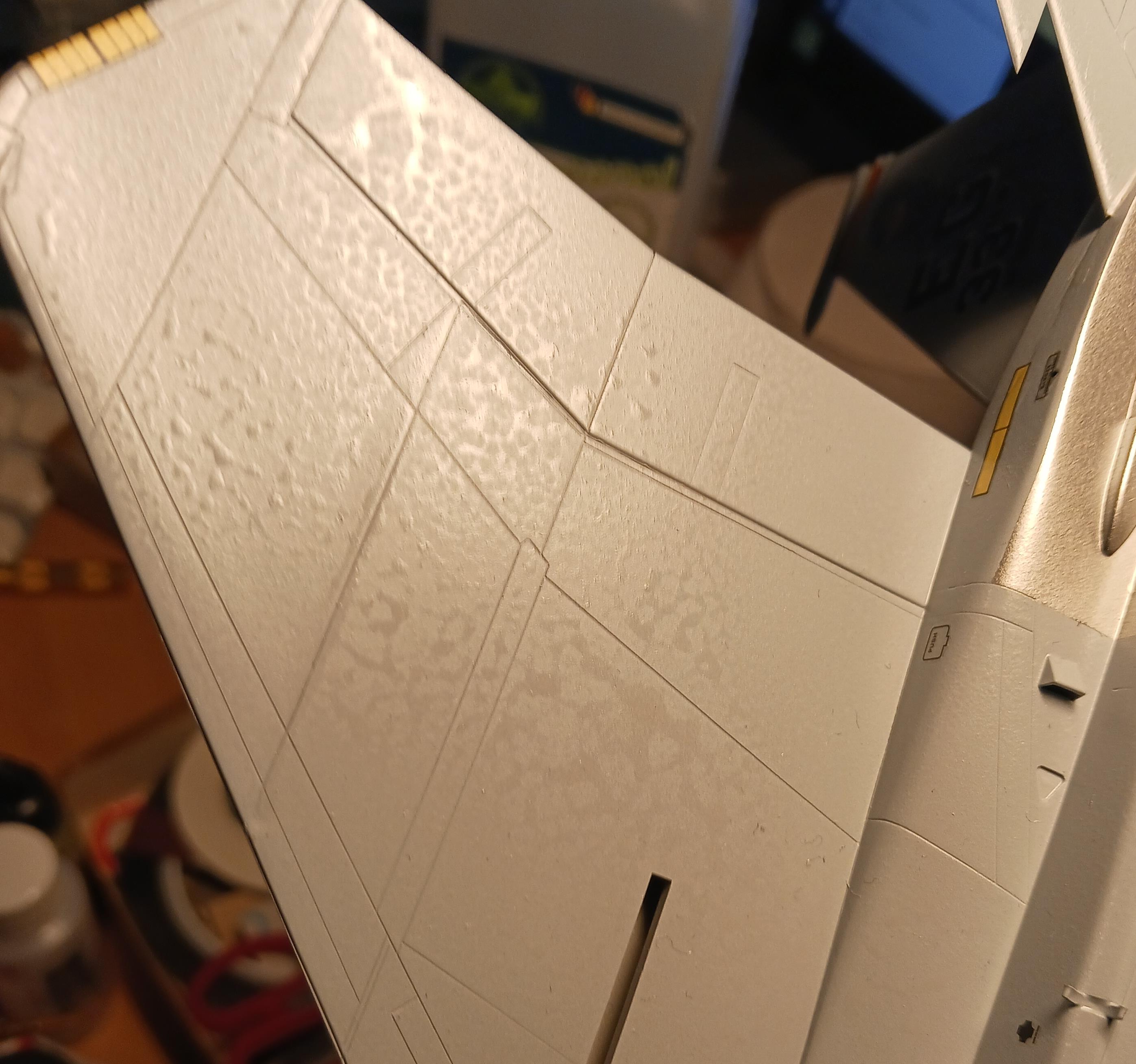 Nach der farblichen Lackierung lackiere ich das ganze Modell mit "Humbrol Clear Gloss Varnish" als Versiegelung der farblichen Lackierung und als glatte Grundlage für die Decals. Vorteile: Der Klarlack ist wasserbasiert, stinkt also nicht besonders; er ist flüssig genug um unverdünnt mit meiner Airbrush (0,4 mm Düse) gesprüht zu werden. Nachteil: hin und wieder ist der Auftrag nicht gleichmäßig, es bilden sich "Pfützen". Es hat den anschein, als ob der Klarlack nicht überall gleichmäßig haftet und sich dann zu kleine "Pfützen" zusammenzieht; die "Pfützen" glänzen dann mehr, als der Rest. Das Bild dürfte den Effekt verdeutlichen (auch wenn das Bild etwas unscharf ist): Warum das manchmal so ist, konnte ich bisher nicht herausfinden (vielleicht sprühe ich den Klarlack zu dick?). Regelmäßig tritt der Effekt auf, wenn ich Bereiche zuvor mit Masking-Tape abgeklebt hatte; ich gege davon aus, dass die Klebereste vom Masking Tape und Klarlack nicht so gut harmonieren. Fazit: Es funktioniert, sieht aber erstmal gruselig aus.