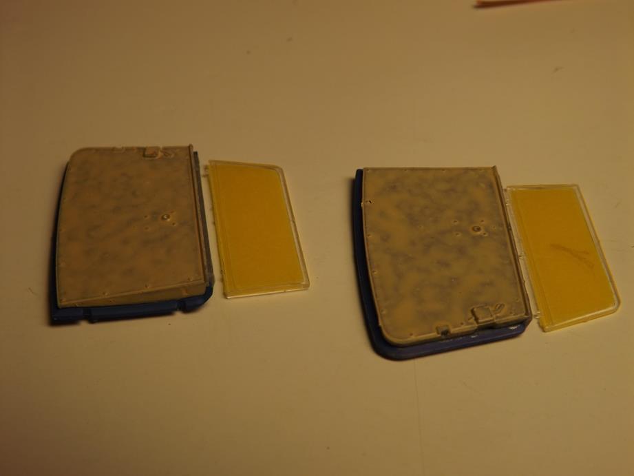 Mit einem Wattestäbchen, das ich leicht mit Alkohol befeuchtet hatte, bearbeitete ich jetzt die noch nicht durchgetrockente Farbe, so dass die Oberfarbe stellenweise ganz entfernt war, teils nur durchscheinte und teils fleckig wirkte. Auch fügte ich stellenweise leichte Kratzer hinzu. Das Ganze versieglete ich mit glänzendem Klarlack, brachte die Decals auf und überlackierte diese wieder mit Klarlack.
