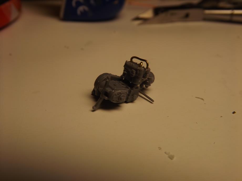 Da war dann noch ein Mini-Motörchen zusammenzukleben. Den Bügel über den Zylindern fertigte ich aus einem Messingdraht.