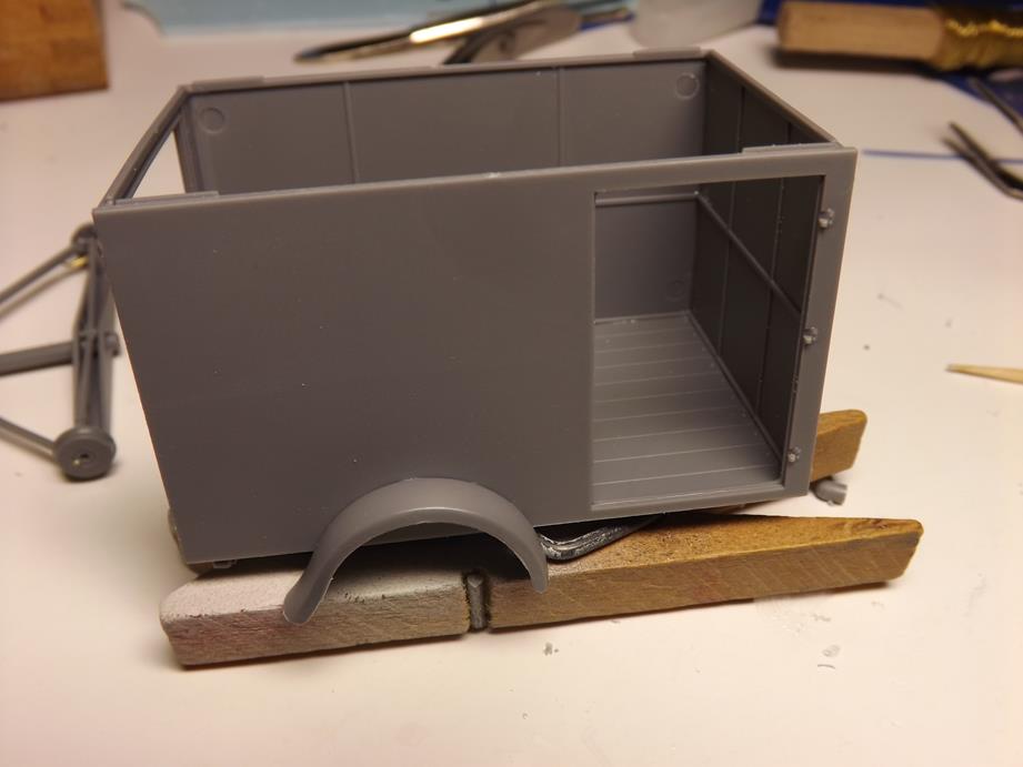 Jetzt folgte die Konstruktion des Kofferaufbaus. Das waren wenige sauber gegossene Platten, die sich wunderbar zusammenfügten. Wegen der Passgenauigkeit war dabei nur sehr wenig Kleber erforderlich. Das führte natürlich auch dazu, dass keine unschönen Kleberänder entstanden. Das einteilige Dach blieb zunächst weg, um den Koffer besser bemalen zu können.