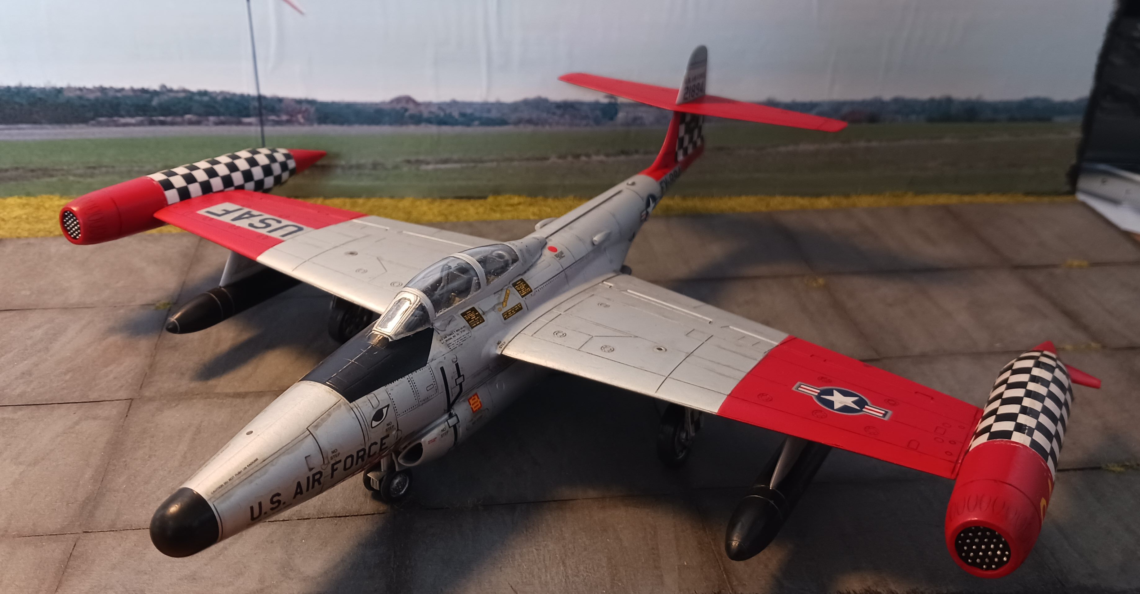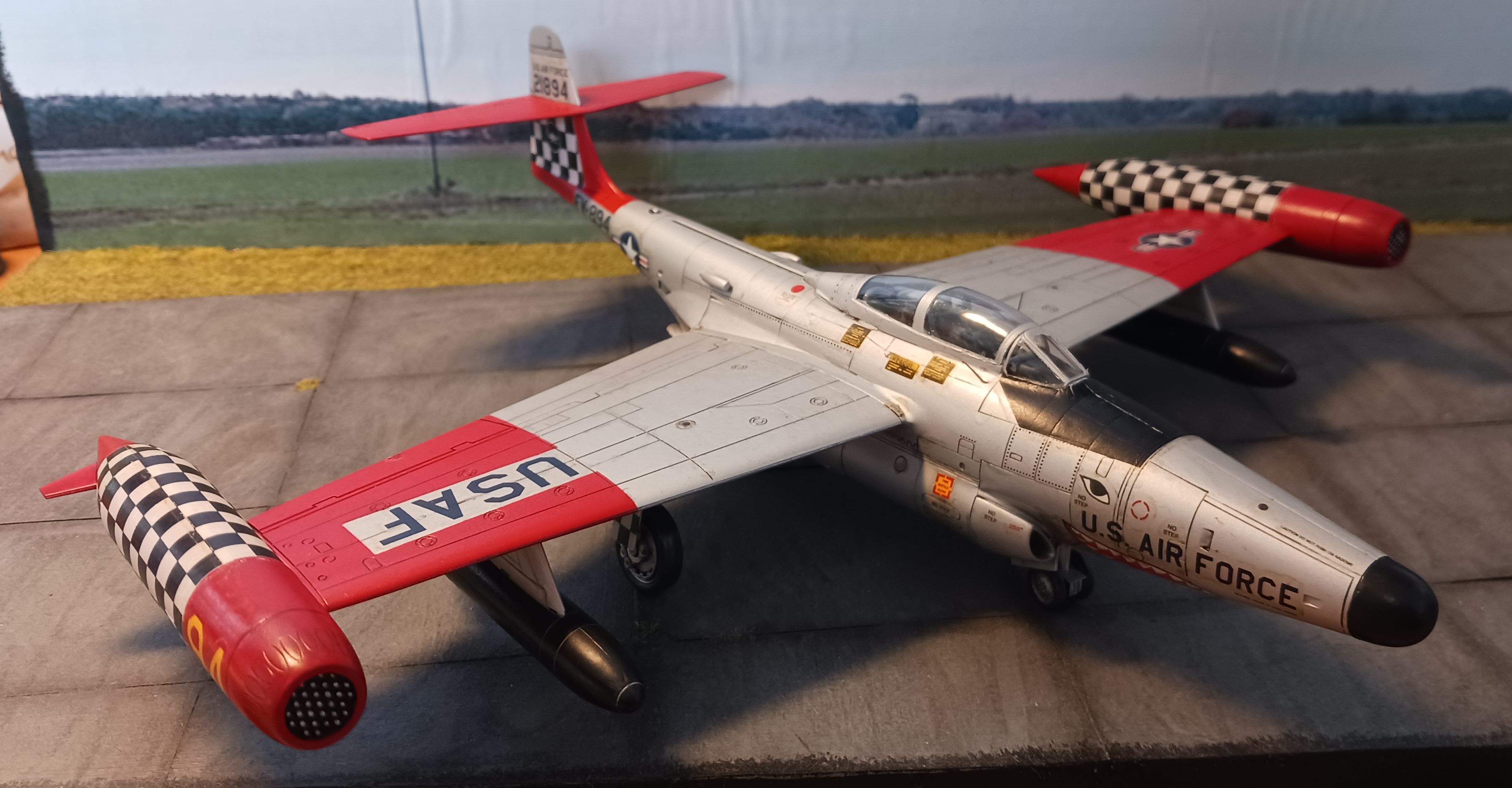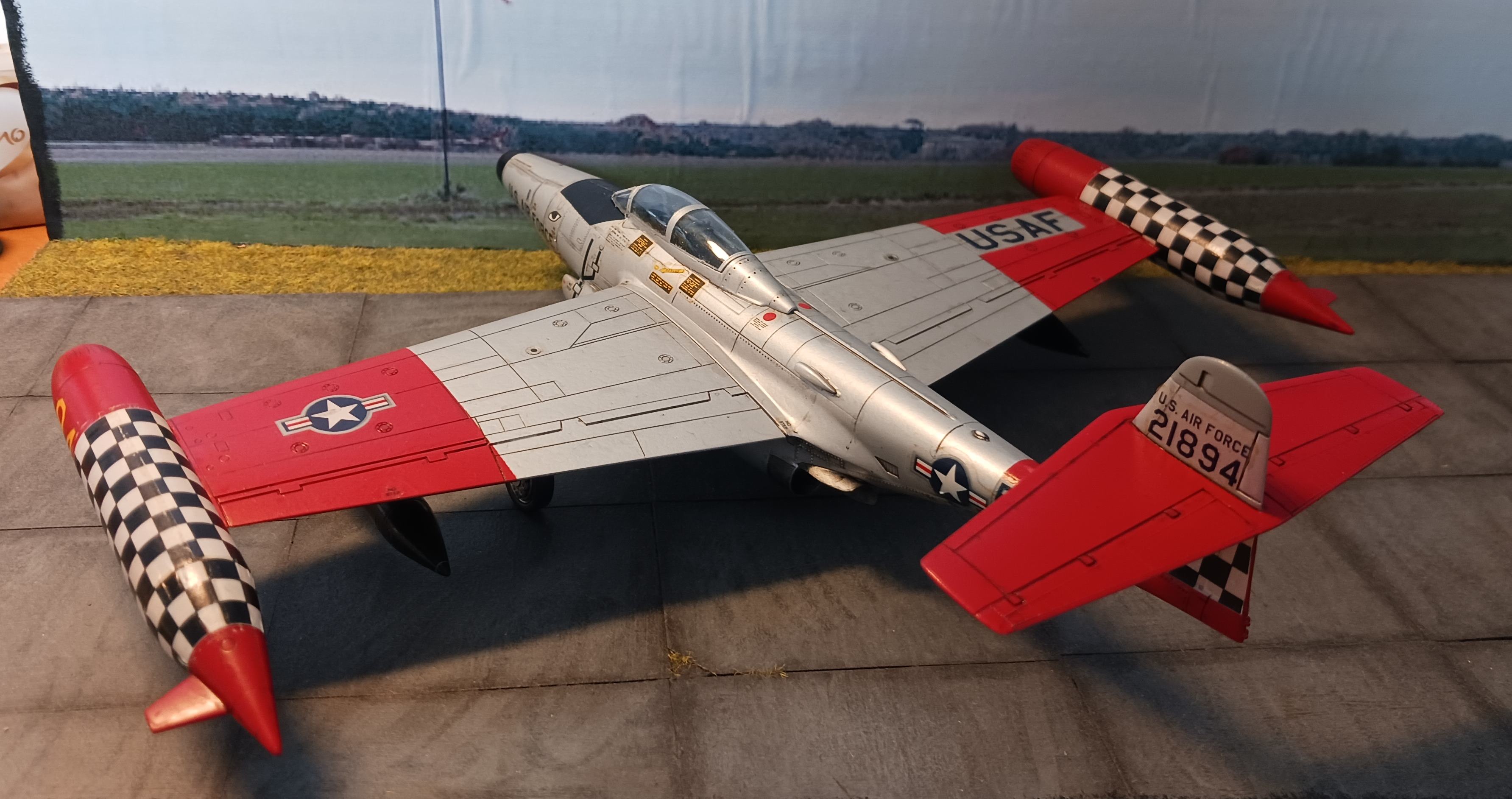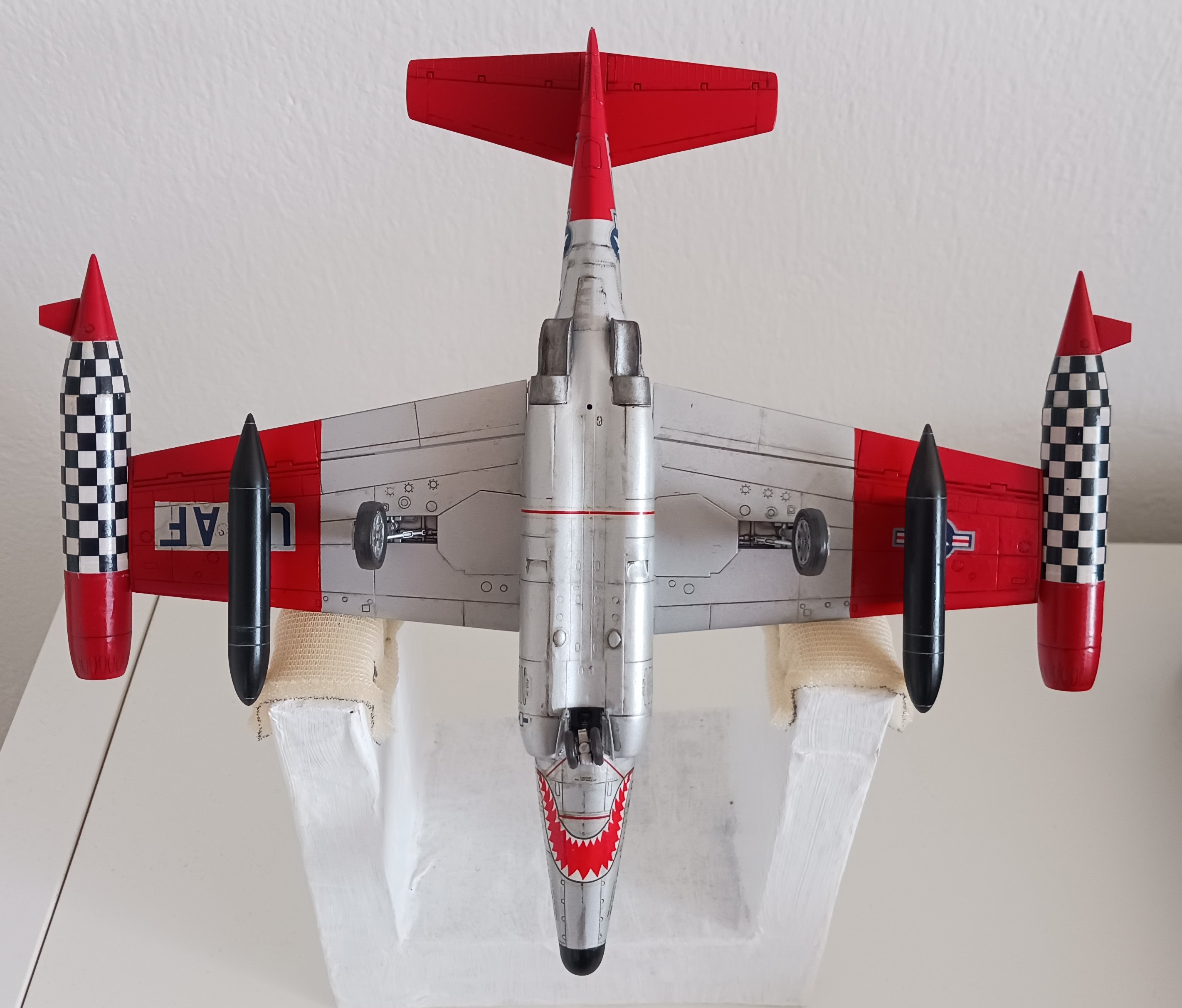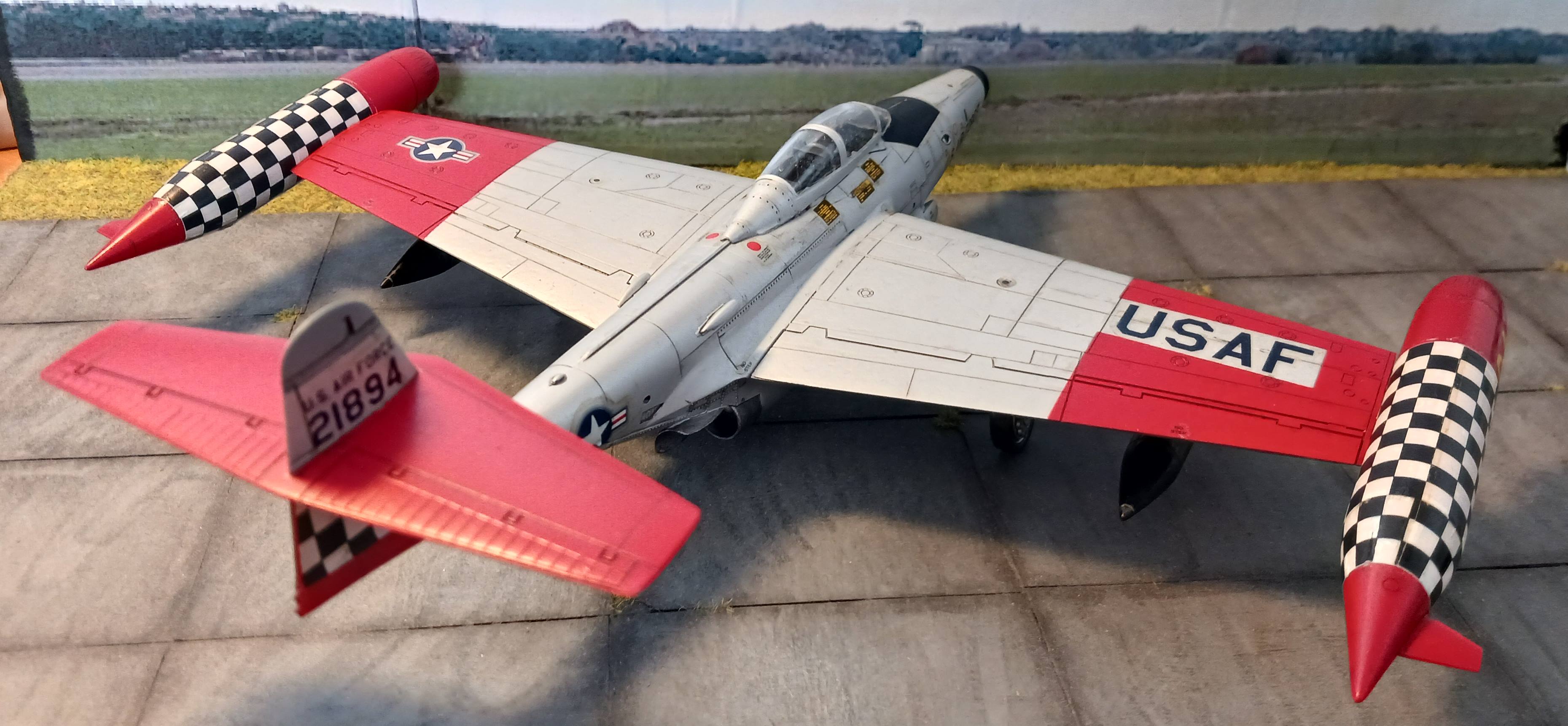 heute zeige ich euch meine Northtrop F-89 D Scorpion von Revell in 1/72. Der Bausatz stammt aus dem Jahr 1991 und wurde danach noch mehrfach aufgelegt. Mir gefiel besonders die bunte Lackierung mit viel Rot und dem Schachbrett-Muster. Interessant ist auch, dass das Original in der D-Version ohne klassische Feuerwaffen, aber mit 104 (2 x 52) ungelenkten Raketen in den Behältern an den Flügelenden ausgestattet war.