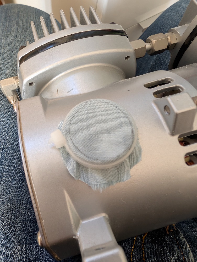 und mit einem Stück Stoff und einem Kabelbinder als Filterersatz eingebaut: