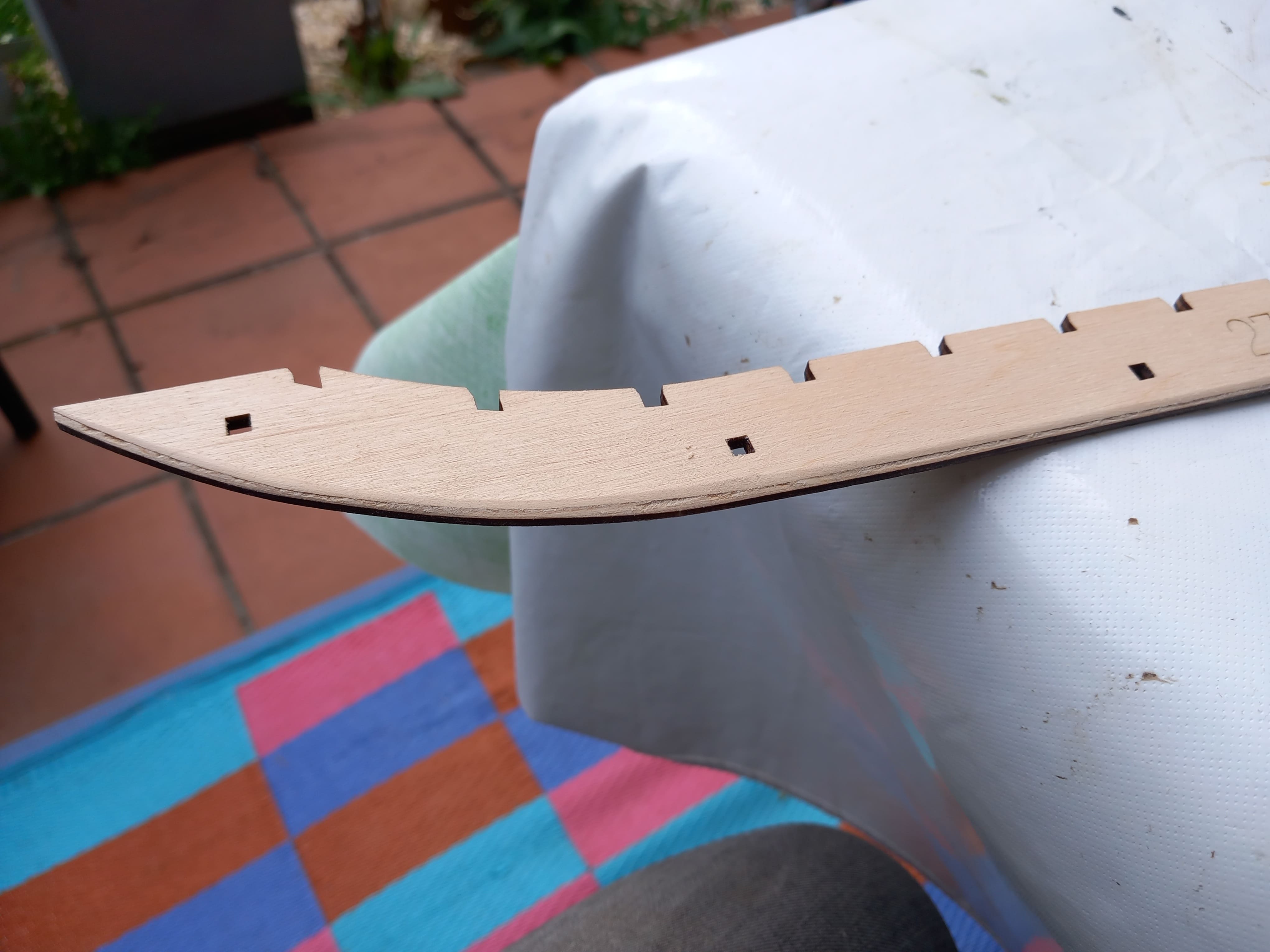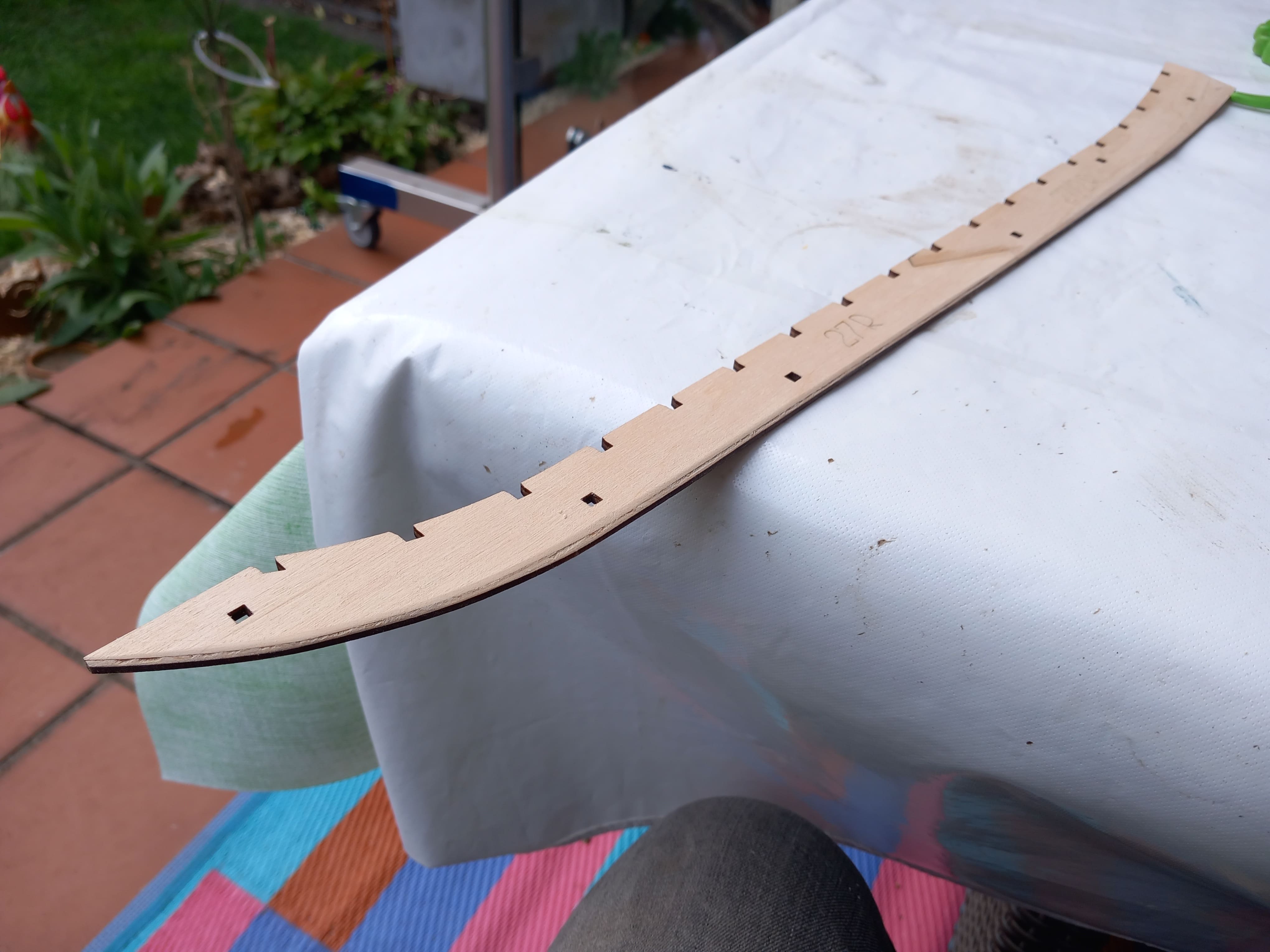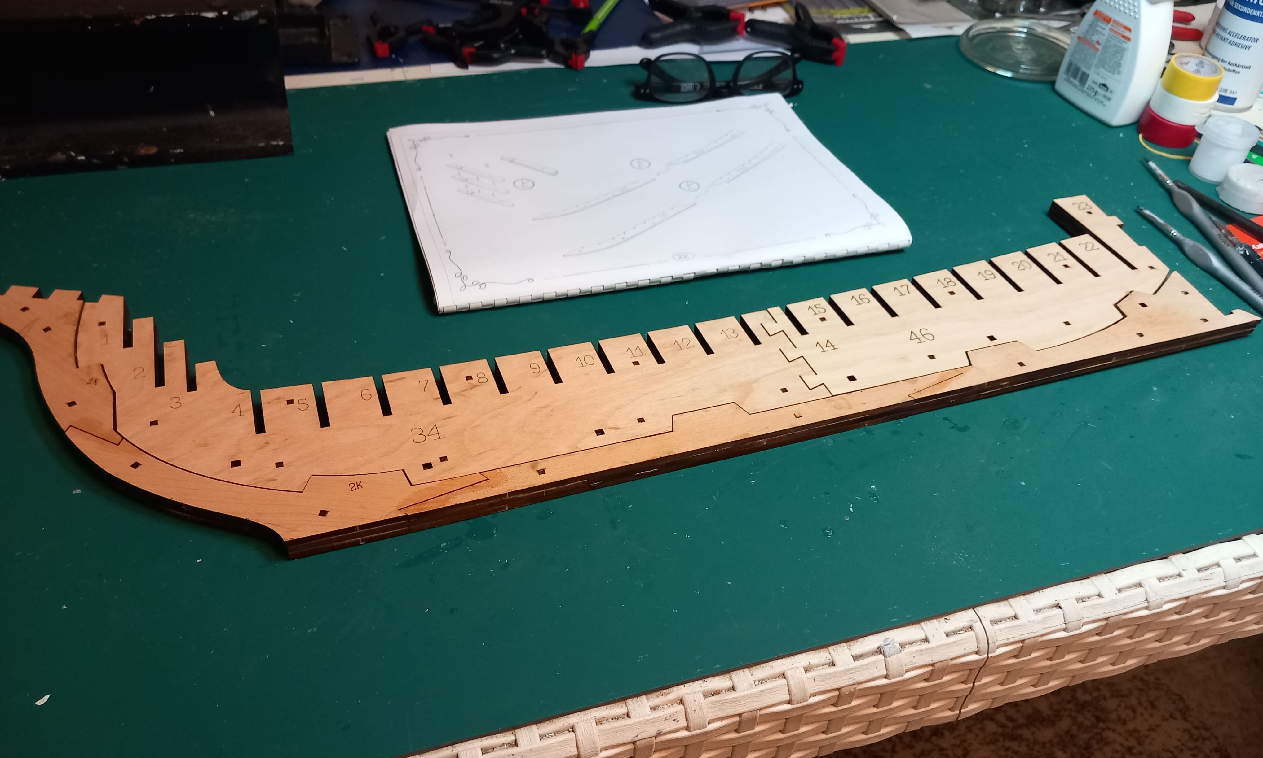Es geht langsam voran. Der Kiel ist jetzt komplett zusammengesetzt. Wieder mit 3 Lagen Holz. Auch die untere Begrenzung vom Rumpf mit den ausgeschnittenen Kerben für die Spanten ist fertig geschliffen. Hier musste viel weggenommen und abgeschleift werden. Ein Problem sind die Videos auf Youtube. Die Übersetzung vom Ukrainischen ins Deutsche ergibt oft keinen Sinn. Somit muß ich mir die Videos immer wieder ansehen um zu erkennen was gerade gemacht wird und wie es gemeint ist. Das kostet Zeit. Gruß Ingo