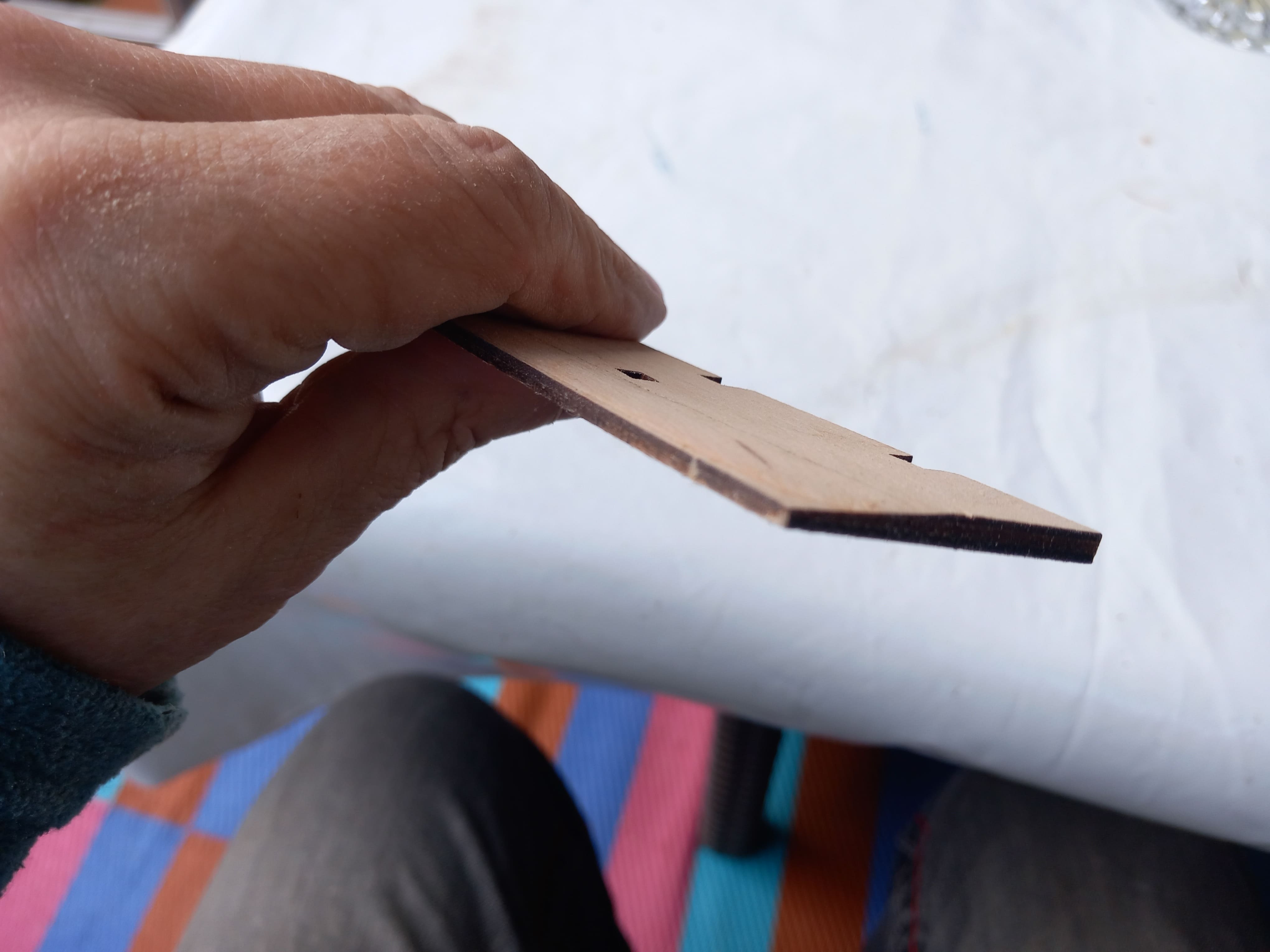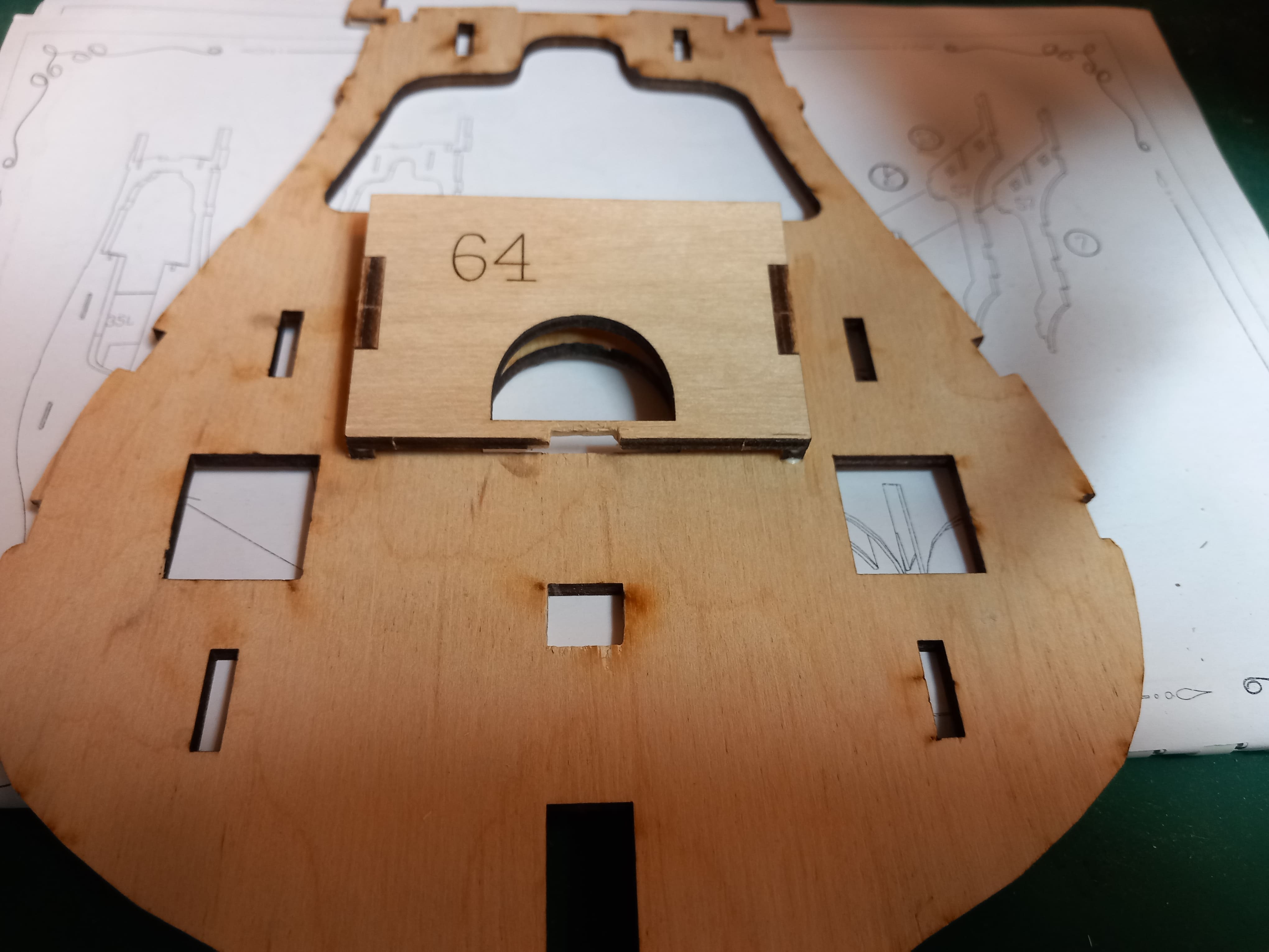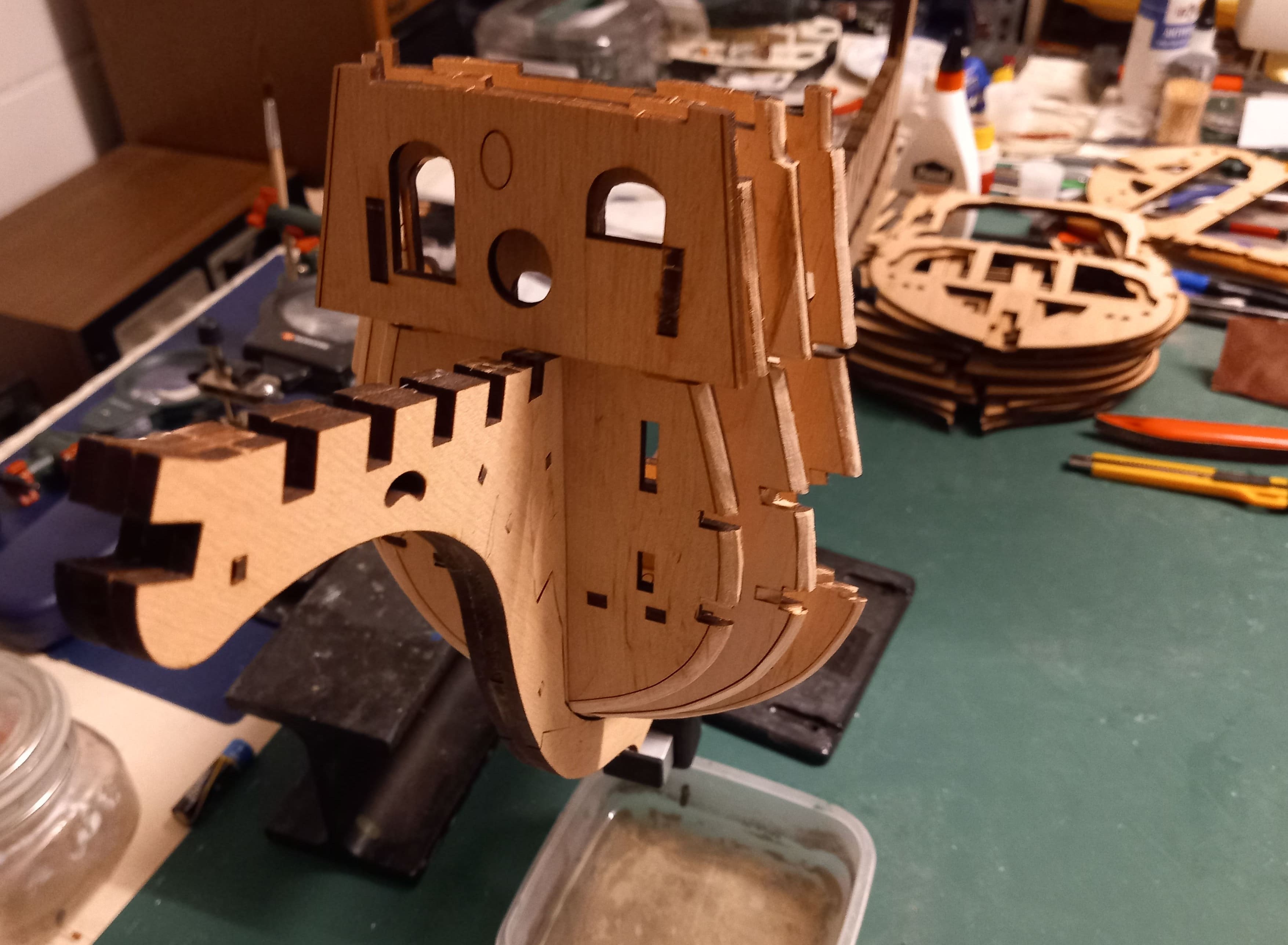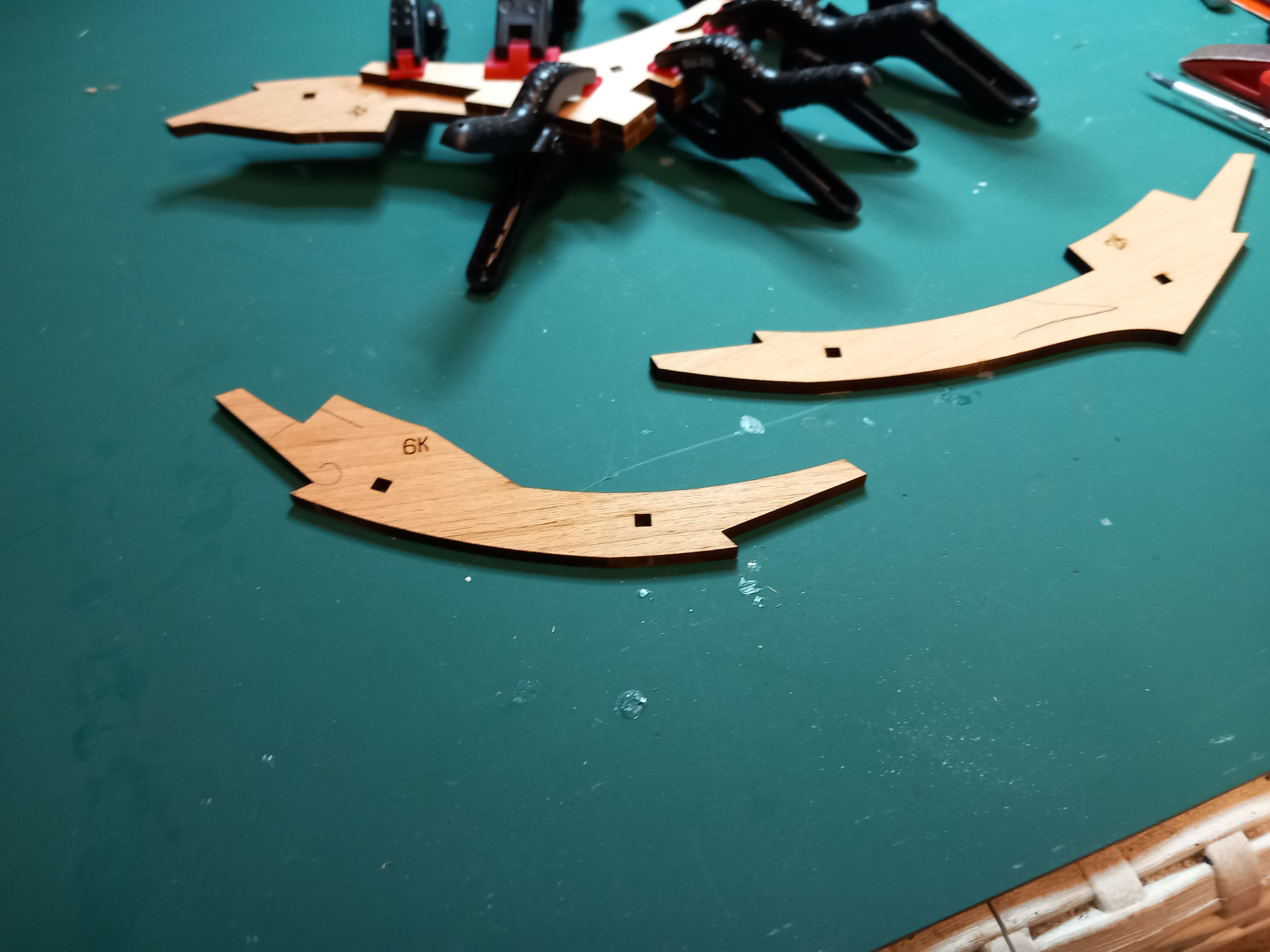 Die vorderen Spanten sind fertig zusammengefügt. Es ist eine Einheit aus drei Spanten. Diese mussten an den Aussenseiten sehr stark nach innen abgeschliffen werden. Auf dem Holz sind gelaserte dunkle Linien sichtbar bis zu denen soll abgeschliffen werden. Auch muß diese Einheit genau in die vorderen Führungen am Bug eingepasst werden. Die Öffnung ganz vorne an der ersten Spante ist stark versetzt zur zweiten Spante. Ob da der Bugspriet reinpasst, wage ich zu bezweifeln. Aber zur Not kann ich das hintere Loch ja noch ausfräsen. Das zeigt sich später. Ob die Spanten genug abgeschliffen wurden????? Auch das kann ich erst später sagen und eventuell noch korrigieren. Gruß Ingo