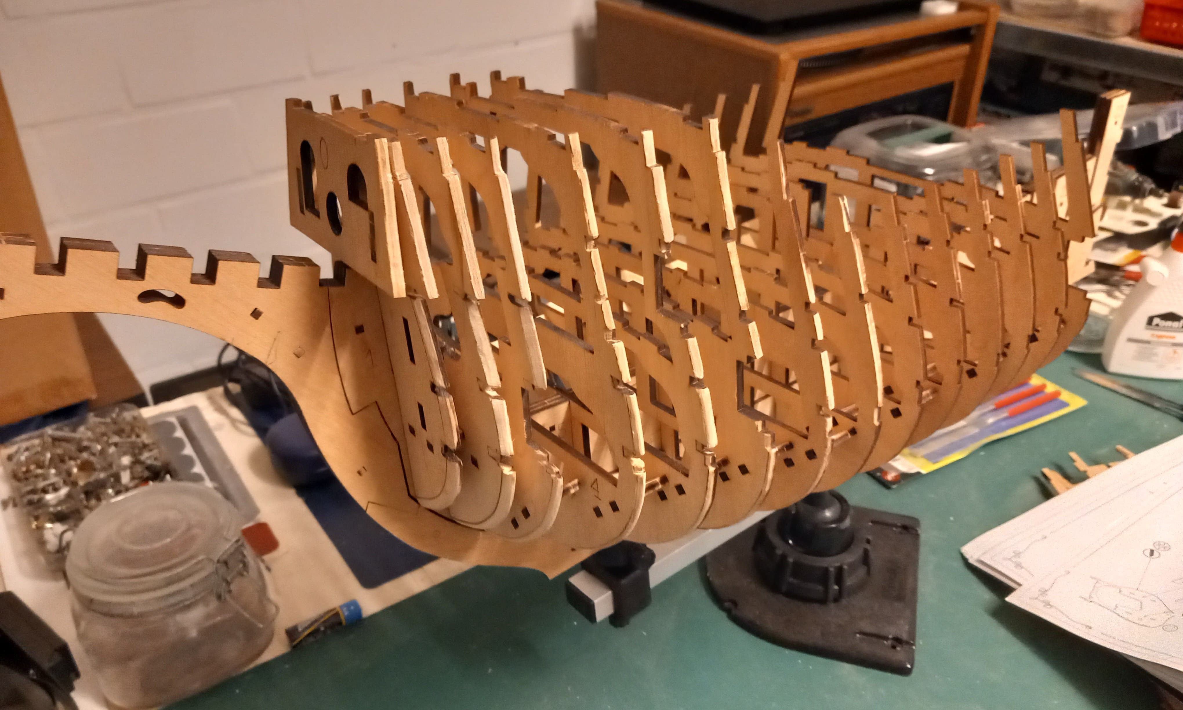 Wenn ich hier noch ergänzen darf: Was du in #1 gebaut hast sind die Konstruktionsmallen, eine Hilfskonstruktion rein für den Modellbau. Unten drunter kommt dann der "echte" Kiel, der quasi das Rückrat der internen Konstruktion im richtgen Leben ist. Wie in deinem Modell auch aus mehreren Stücken zusammengesetzt. Die darauf sitzenden Spanten sind dann im echten Schiff quasi die Rippen für die Haut der Planken, diese sind aber viel-viel mehr und sitzen dadurch viel dichter als die Mallen, die in den Modellen eingesetzt werden.