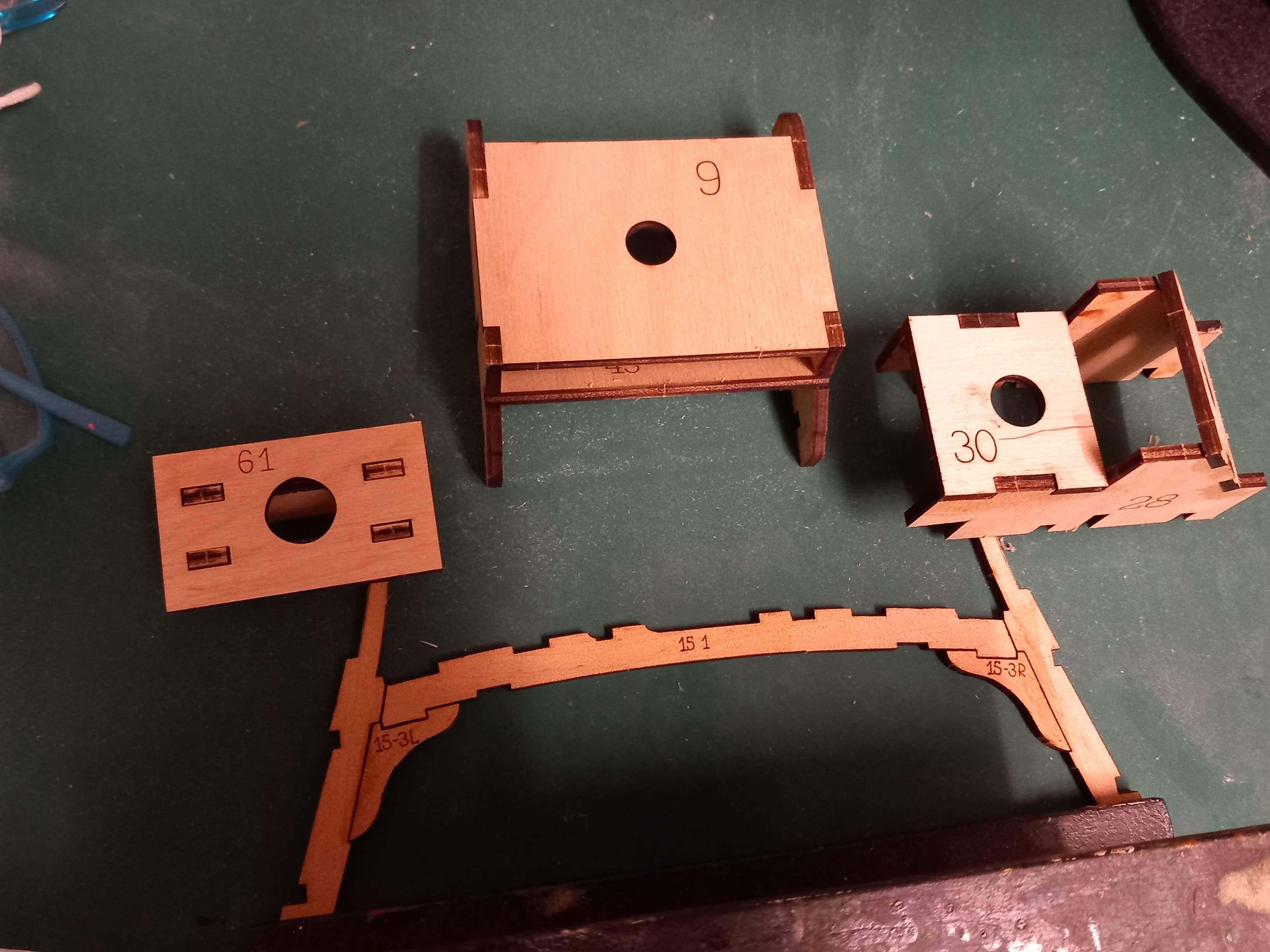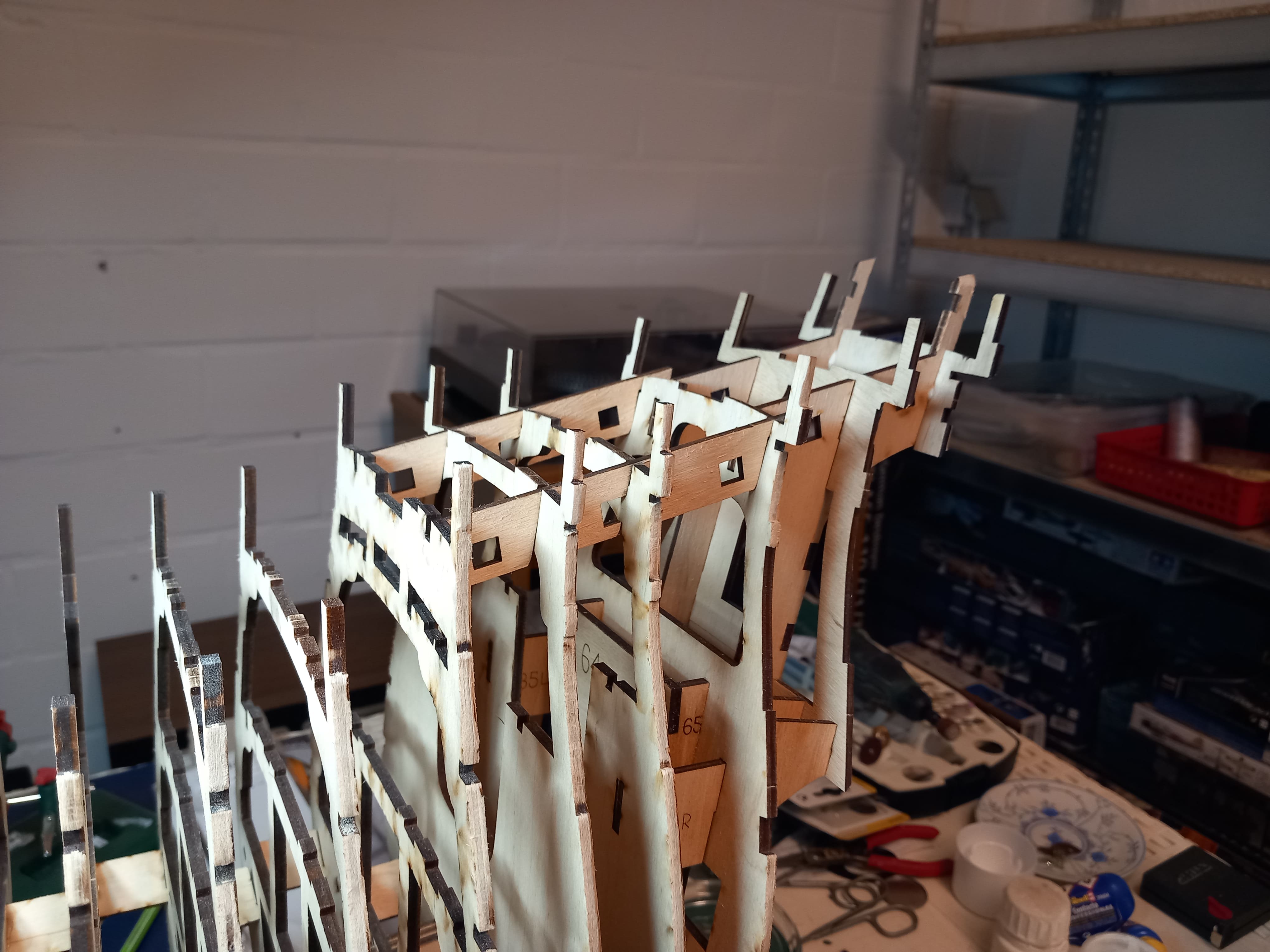 Moin. Weitere Spanten sind vorbereitet. Zur Mitte des Schiffes hin sind weniger Schleifarbeiten nötig als zum Bug oder Heck. Die Spanten sind erstmal nur in Trockenmontage eingesetzt um etwaige Ungleichheiten auszugleichen. Danach werden sie dann miteinander verbunden und eingeklebt. Zwischenzeitlich habe ich außerdem ein paar Teile zusammengesetzt, die später im Inneren des Rumpfes verbaut werden und die Masten halten. Gruß Ingo