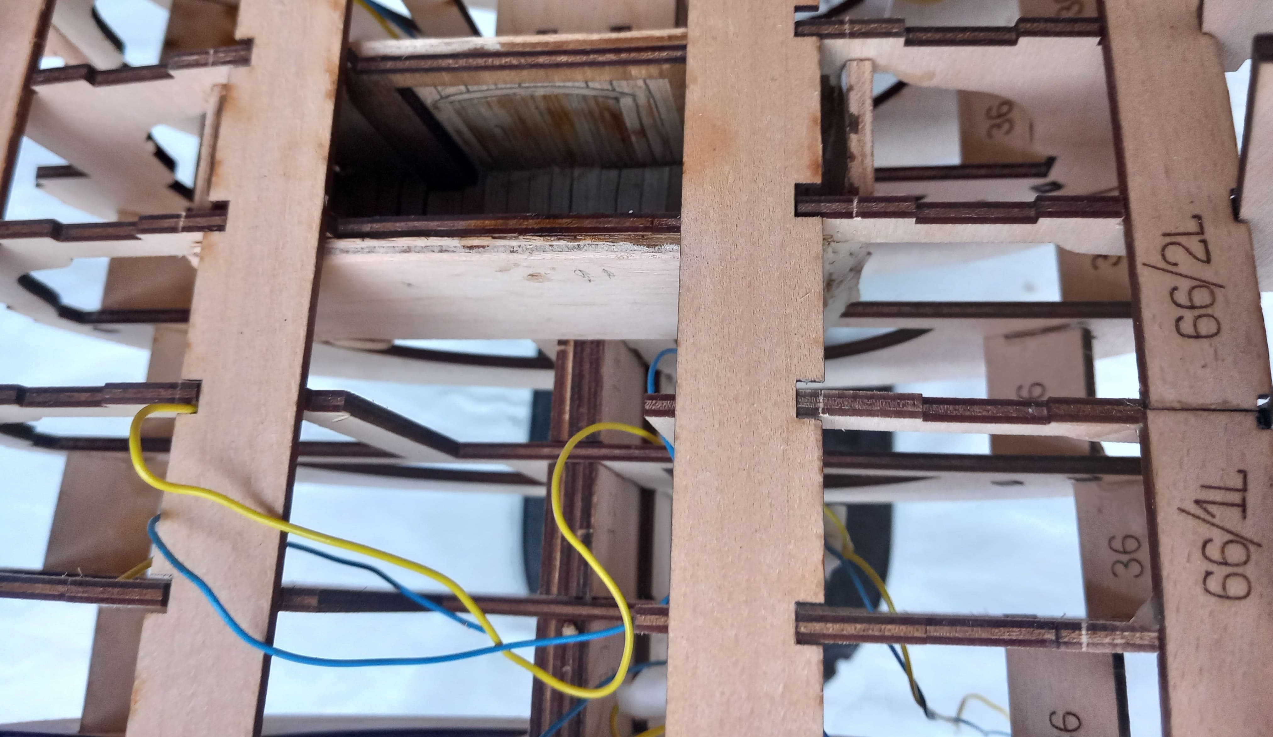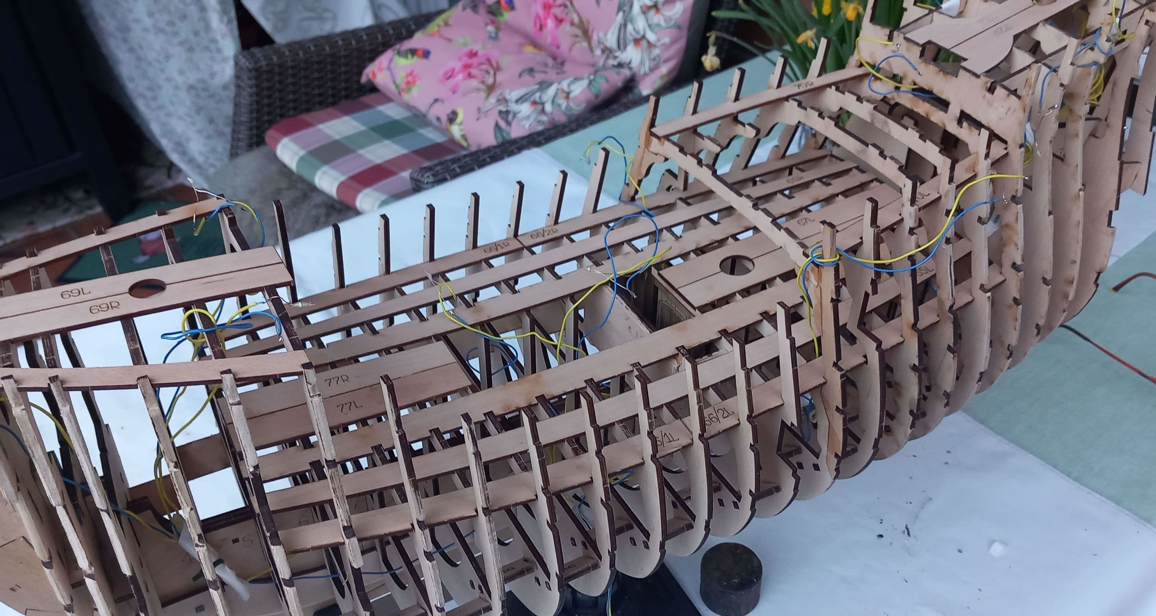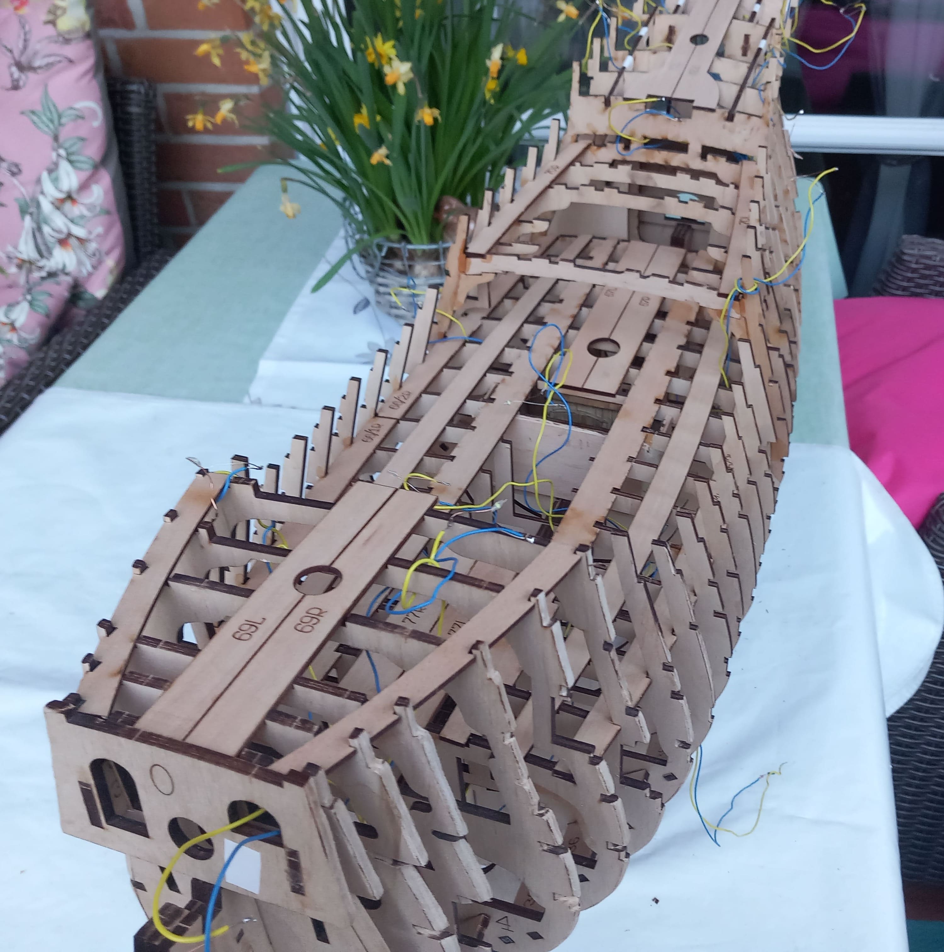 Danke schön. Es geht langsam voran. Zuerst wurden Längsrahmen auf den Decks oberhalb der Spanten angebracht. In den nächsten Videos wird das Verkabeln und das Anschließen der LED`s gezeigt. Dieser Punkt und auch der nachfolgende erscheint nicht in der Bedienungsanleitung. Aber zuerst zu der Verkabelung. Erst werden 17 Leitungen verlegt, im nächsten Schritt wieder herausgezogen, um Potentiometer (Regler) in 3 Kreise einzubauen. Diese Regler sollen fest im Rumpf installiert werden