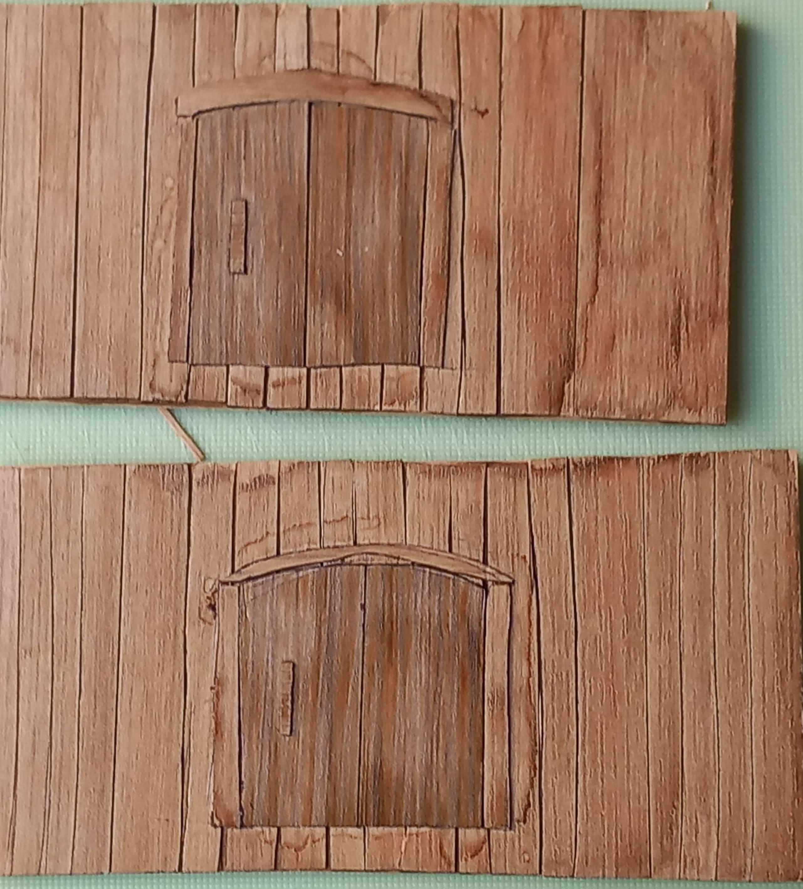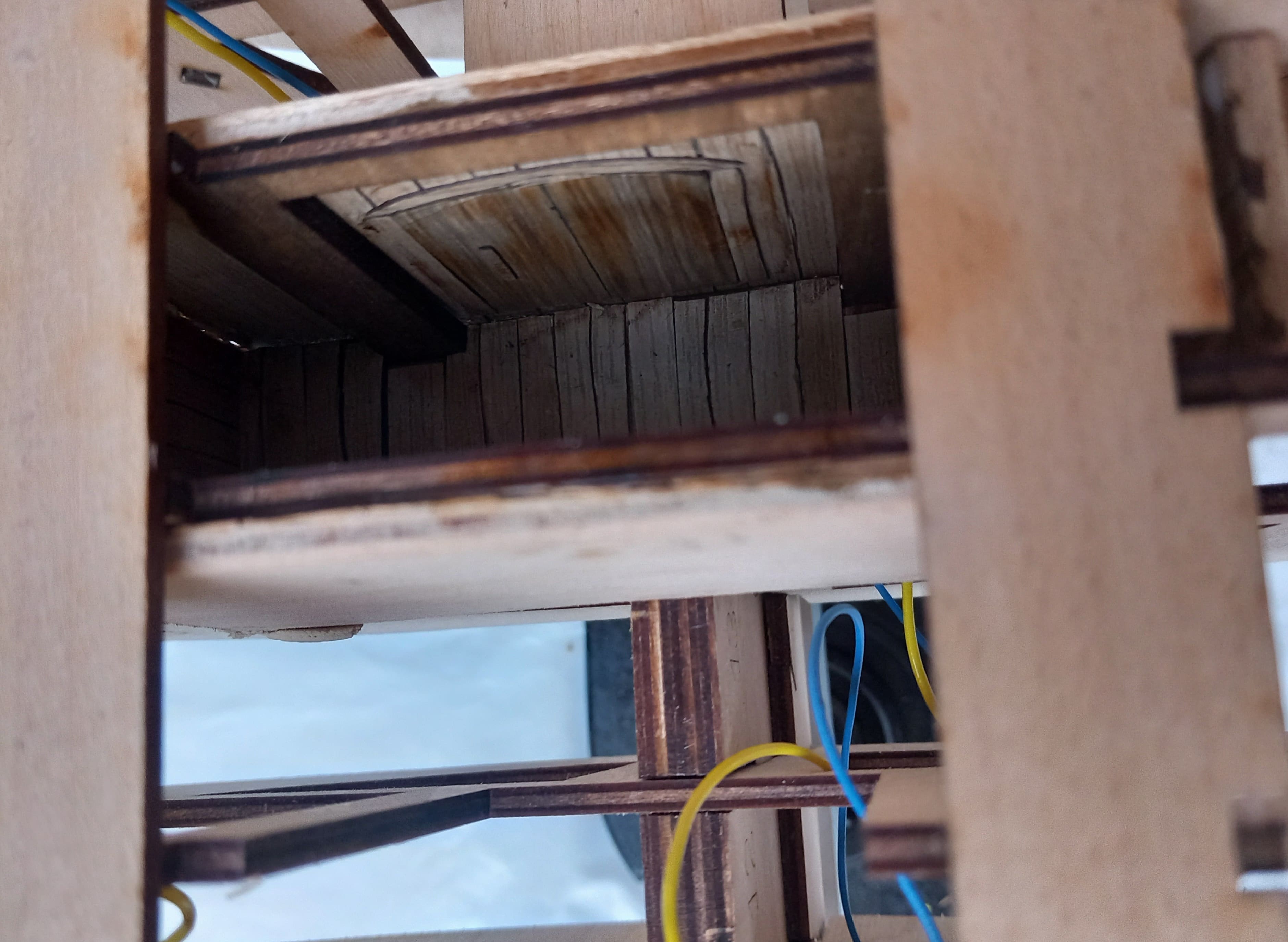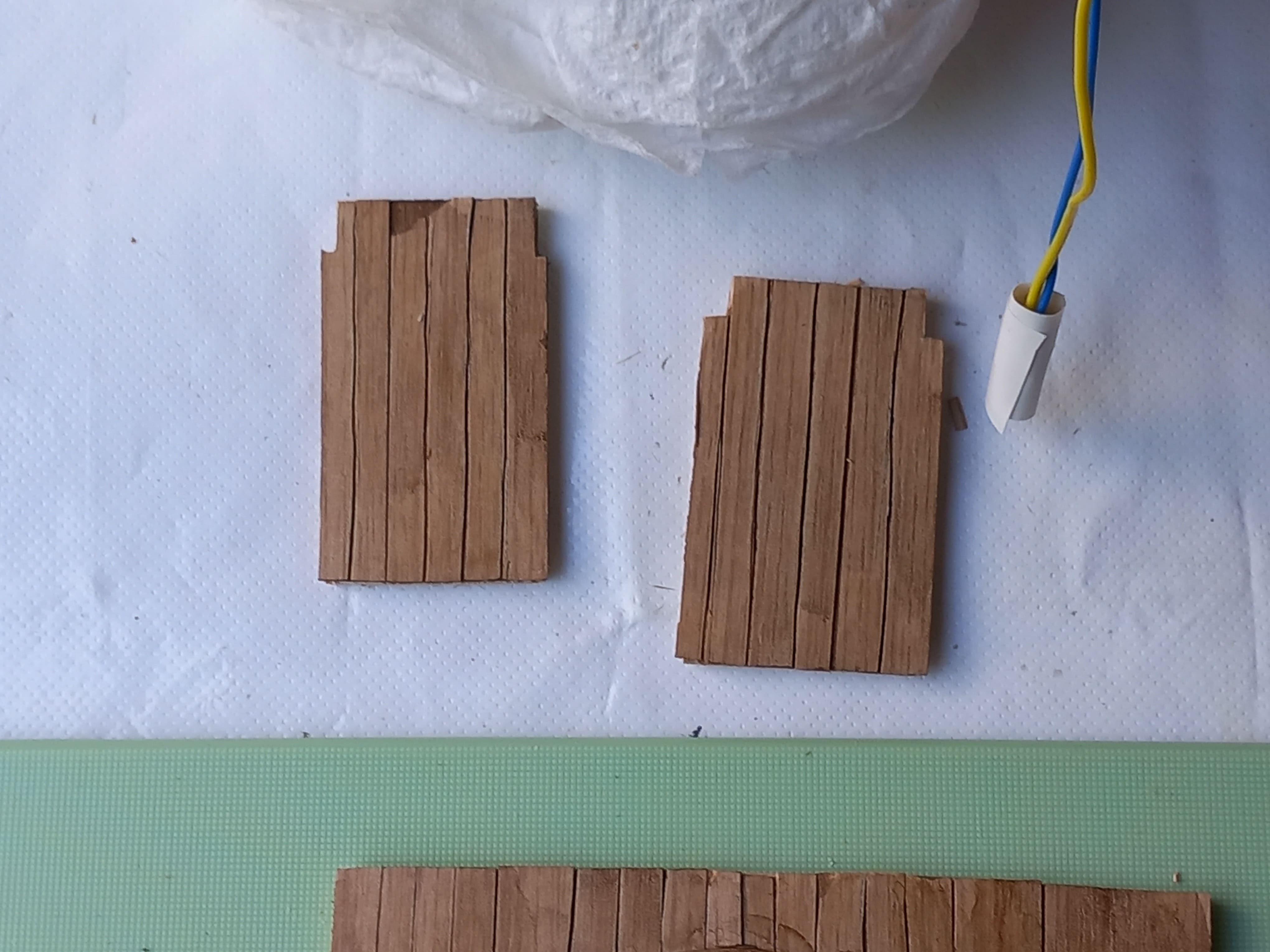 Danach folgt wieder ein Punkt der weder in der Anleitung zu finden ist, noch wozu Teile vorhanden sind. Die Fertigstellung des Unterdecks. Zwei Wände mit Türen, zwei kleine Seitenwände und Holzbalken sollen dazu eingebaut werden. Da genug Sperrholzreste inzwischen vorhanden sind, ist das kein großes Problem. Die Türen habe ich mit Kantenumleimer in Eiche aus dem Baumarkt zusammengesetzt.. Nach dem Zusammenbau das Ganze dann noch mit dunkler Farbe übermalt und naja....nicht so gut wie im Video....aber ich bin damit ganz zufrieden. Optional könnte man diesen Punkt auch weglassen. Viel wird man davon am Ende nicht sehen.