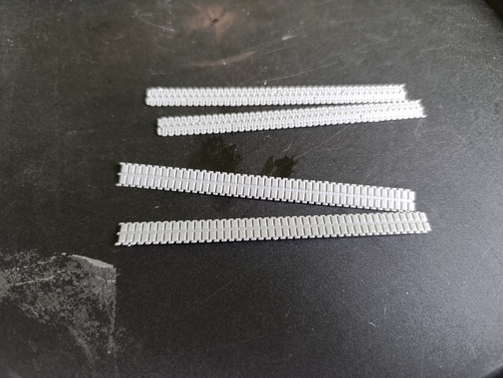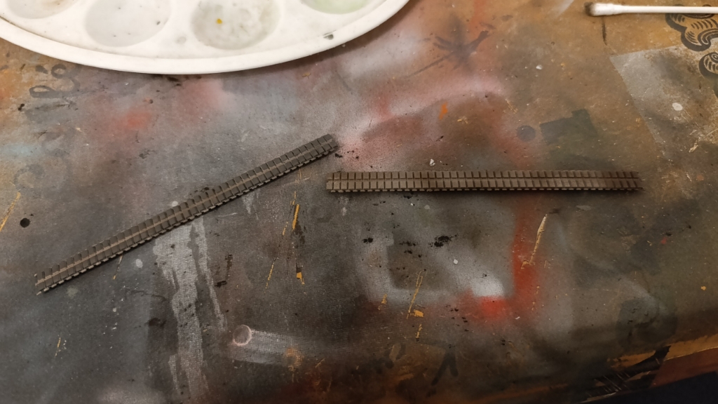 Die Ketten wurden mit Grau grundiert, dann leicht mit Dark Traks besprüht und zu Letzt die Kettenpolster bemalt