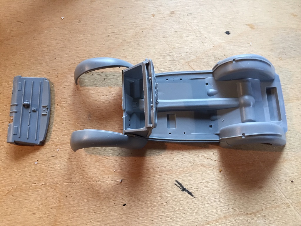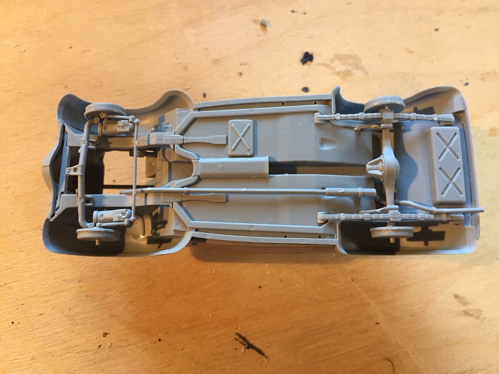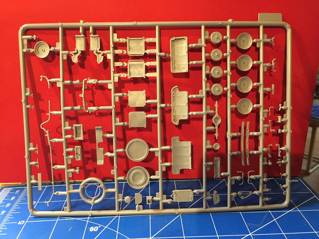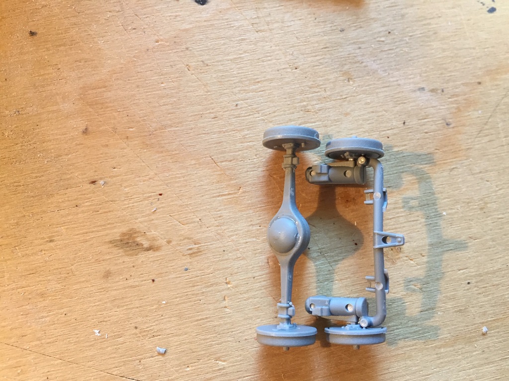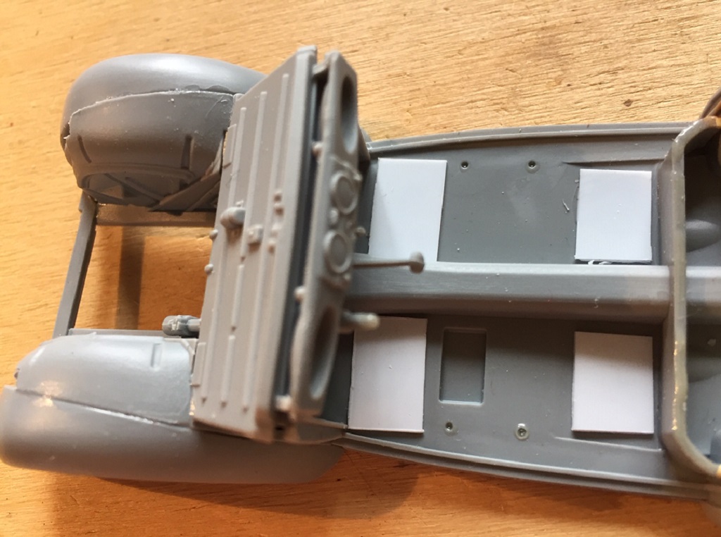 Hier nun verlasse ich die Reihenfolge des Bauplanes. Um die Vorderachse mit dem Motor exakt zusammen zu bekommen, baue ich jetzt erst die Bodengruppe zusammen. Hier beginne ich mit dem Armaturenblech und der Motorwand. . .