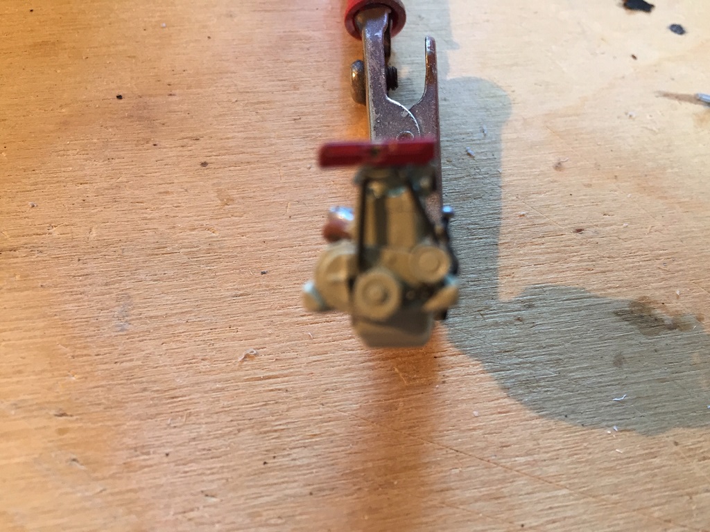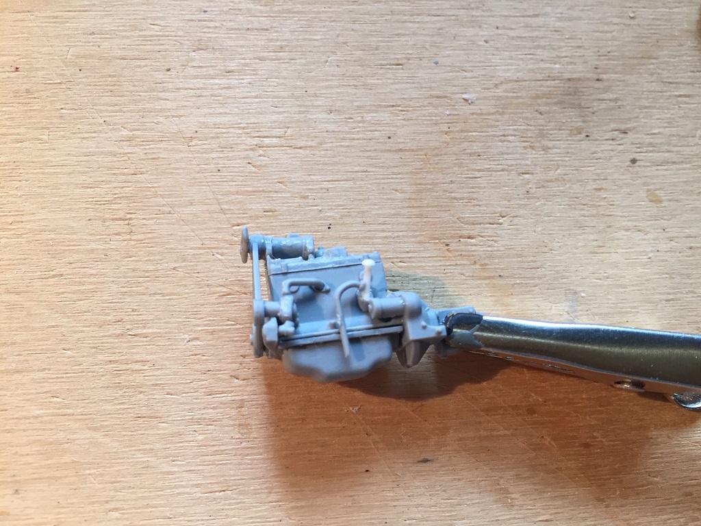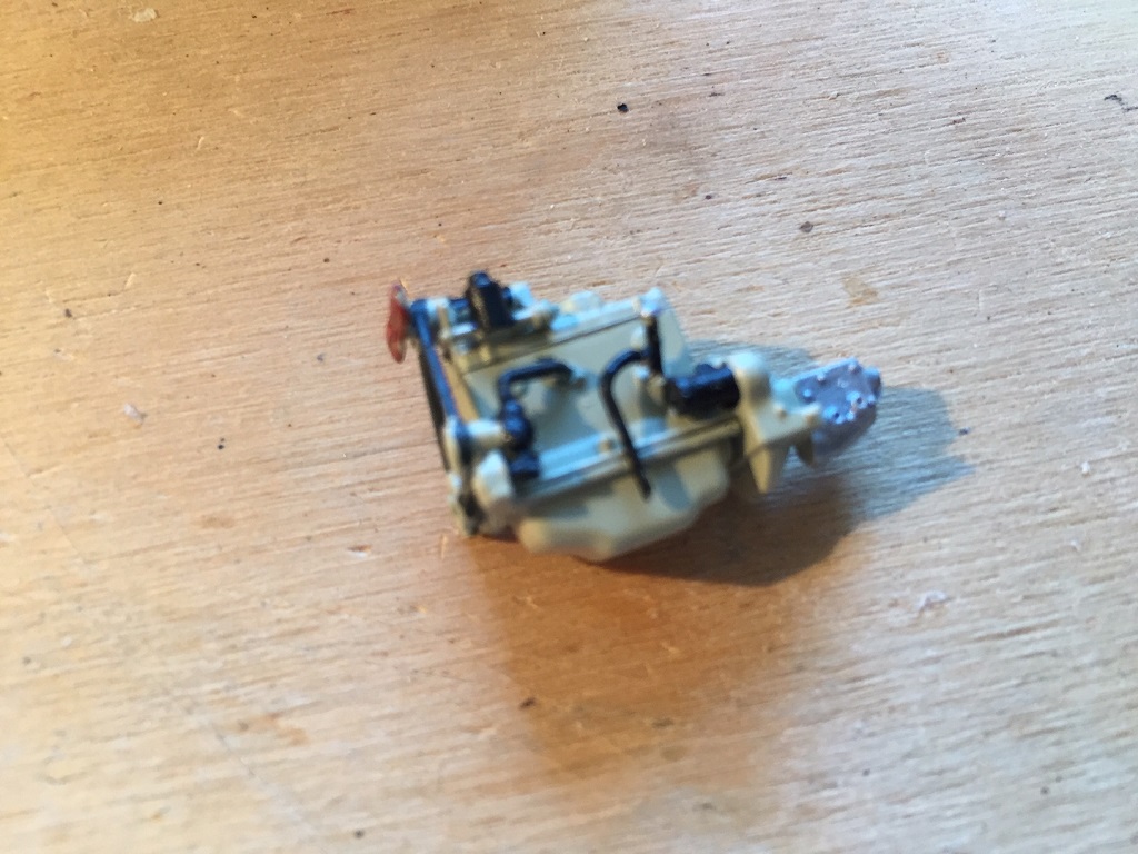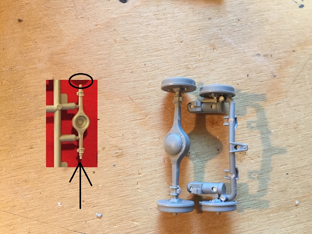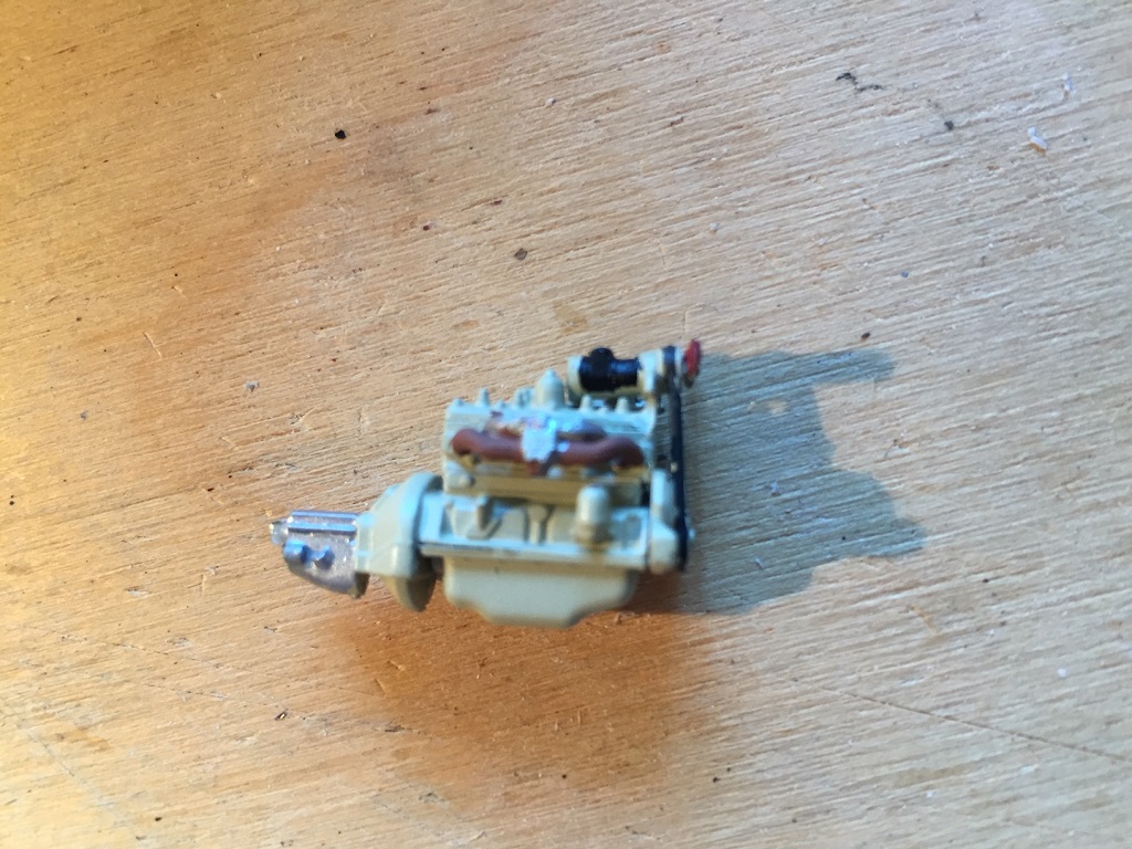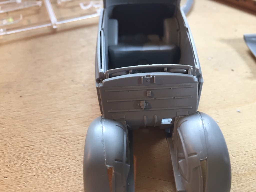 Hier nun verlasse ich die Reihenfolge des Bauplanes. Um die Vorderachse mit dem Motor exakt zusammen zu bekommen, baue ich jetzt erst die Bodengruppe zusammen. Hier beginne ich mit dem Armaturenblech und der Motorwand. . .
