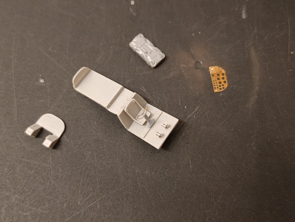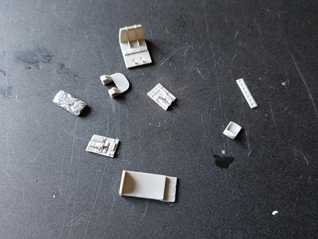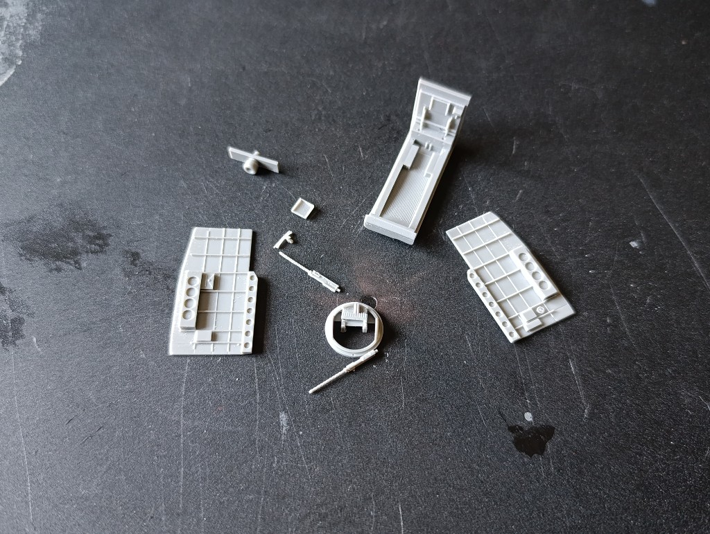 Zunächst musste ich hier alle Bauteile von den Angüssen befreien und habe mit einer Resinsäge die Teile abgetrennt. Zunächst das Cockpitset mit mehreren Teilen.