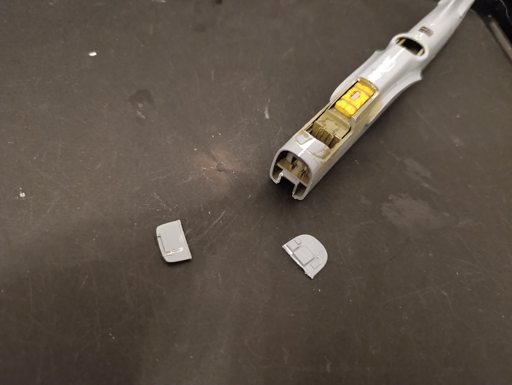 Da der Cockpitabschluss oder Rückwand für den Burgschützen (wie man es auch nennen will) nicht gepasst hat, habe ich dieses Teil aufgetrennt, dass zumindest das Burgfahrwerk einen sauberen Abschluss bekommt