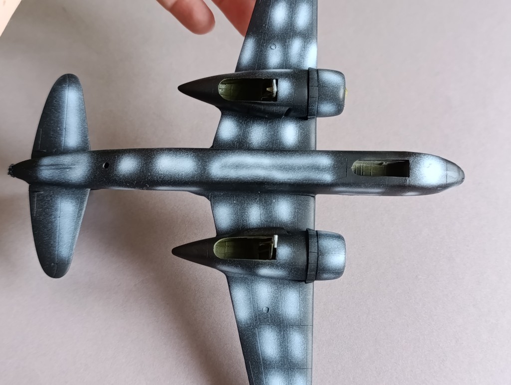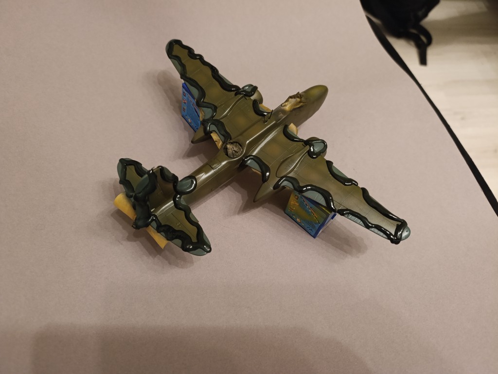 Mit mittelgrün wurden die Tarnflecken aufgetragen. Das wirkte zunächst etwas gewöhnungsbedürftig, weil die Flecken alle entlang des Randes verteilt sind