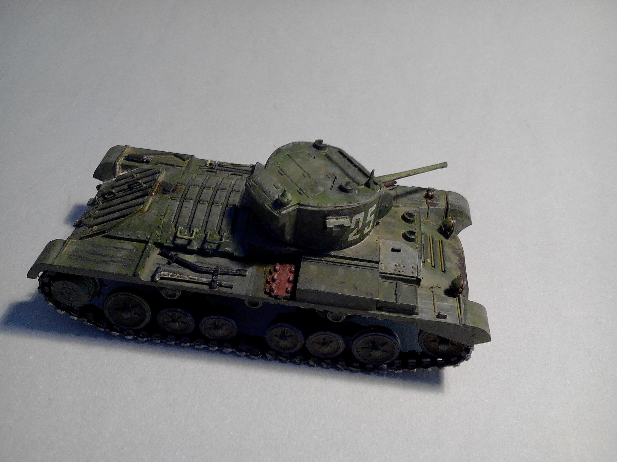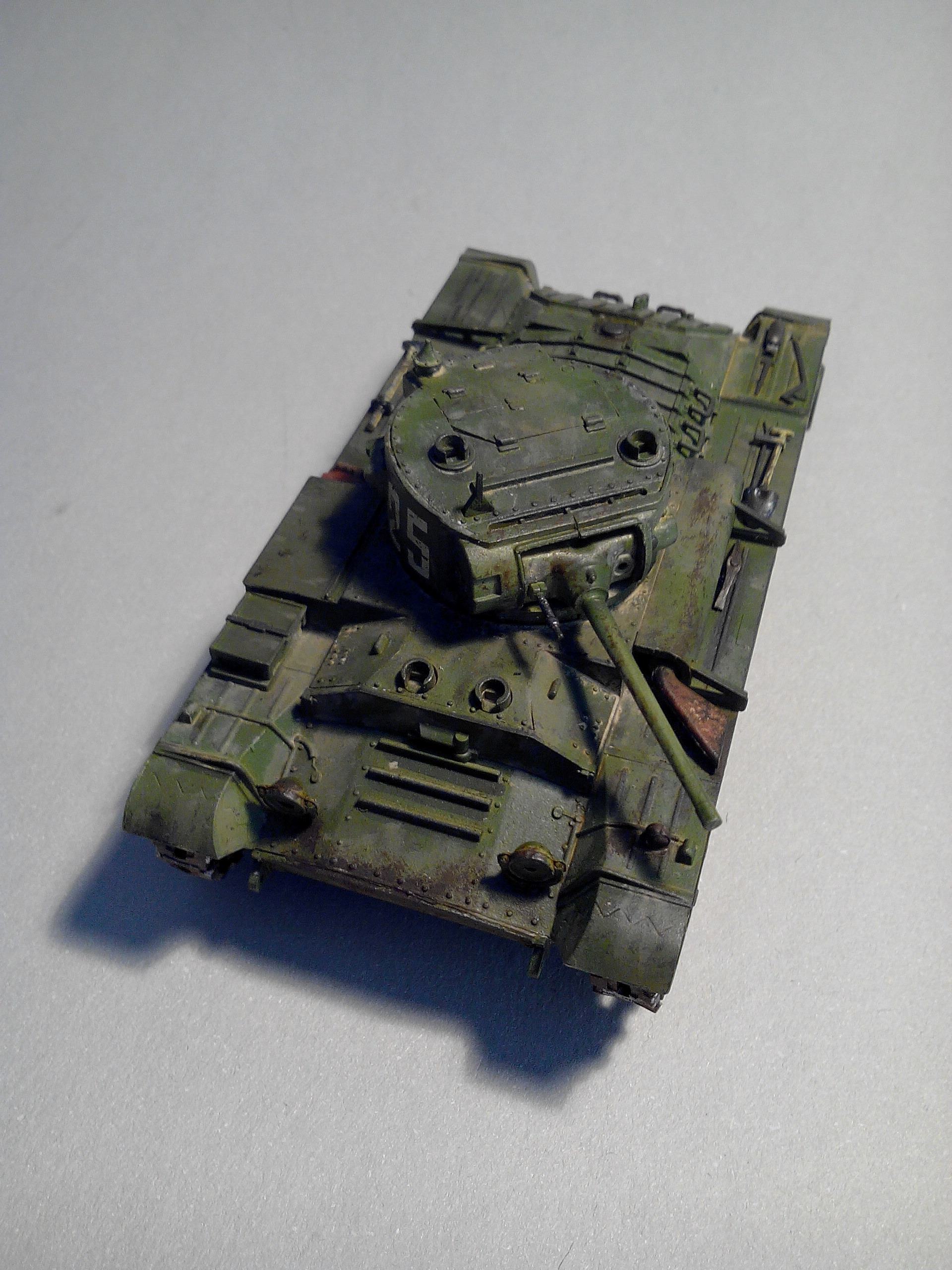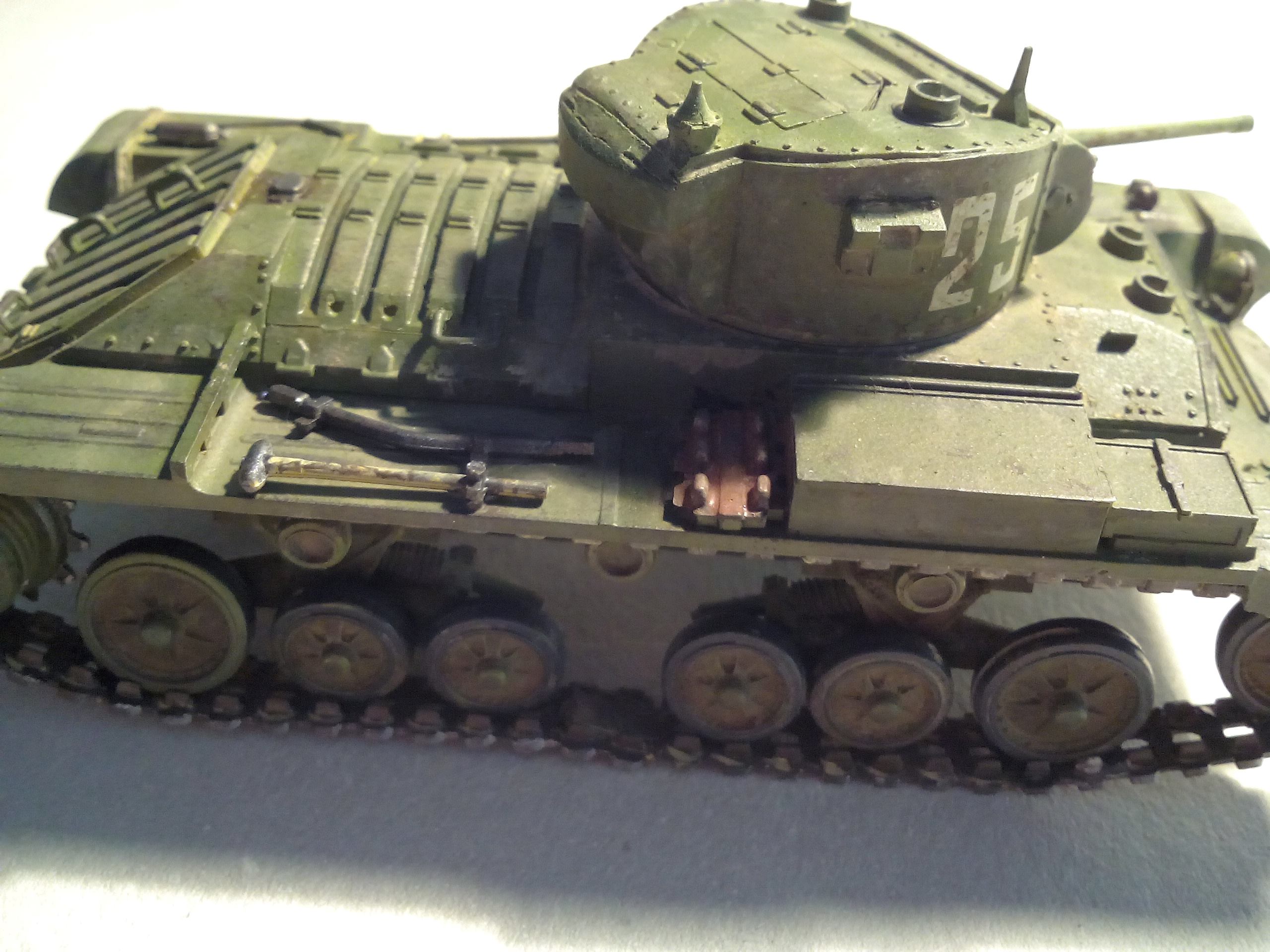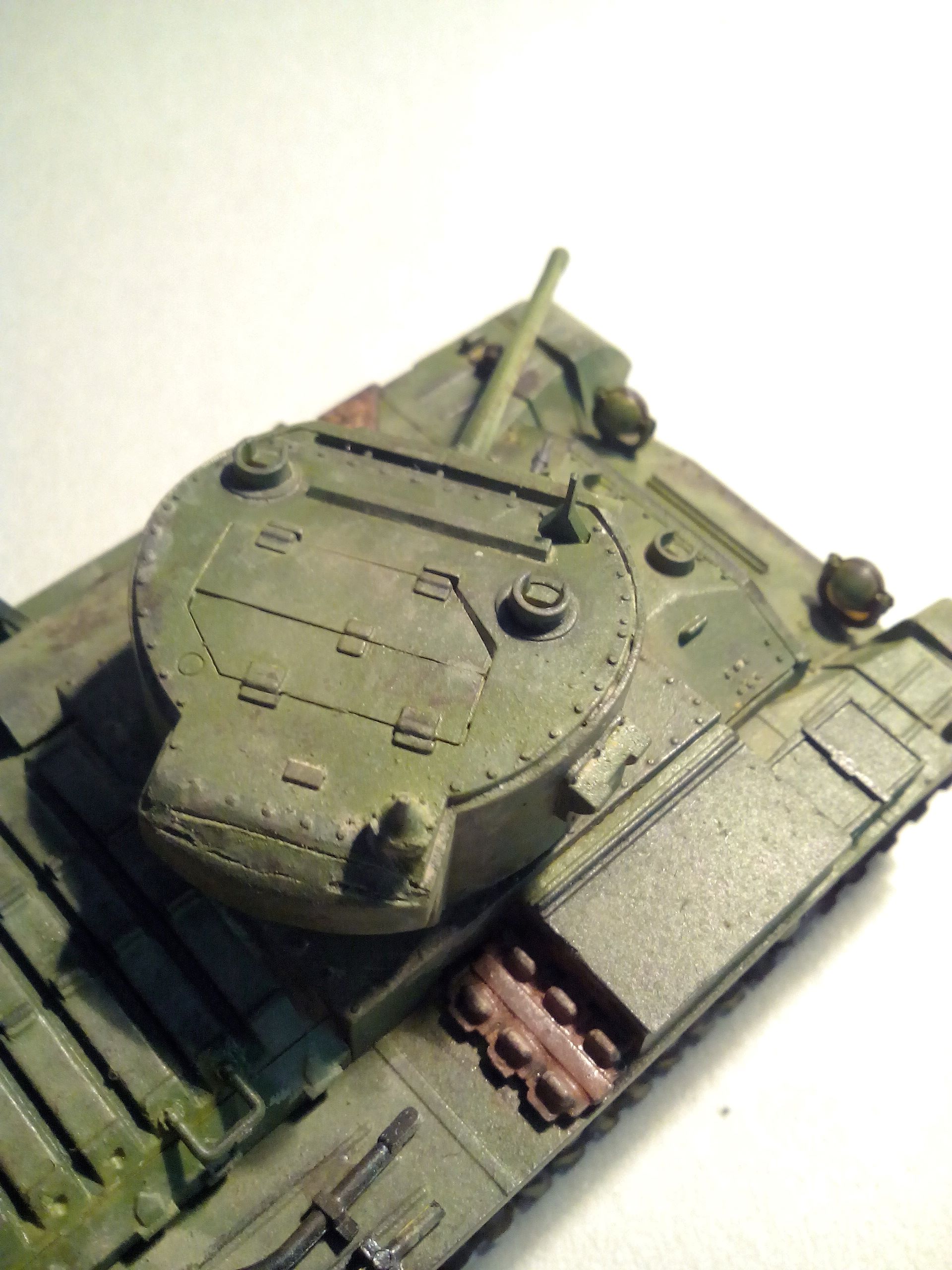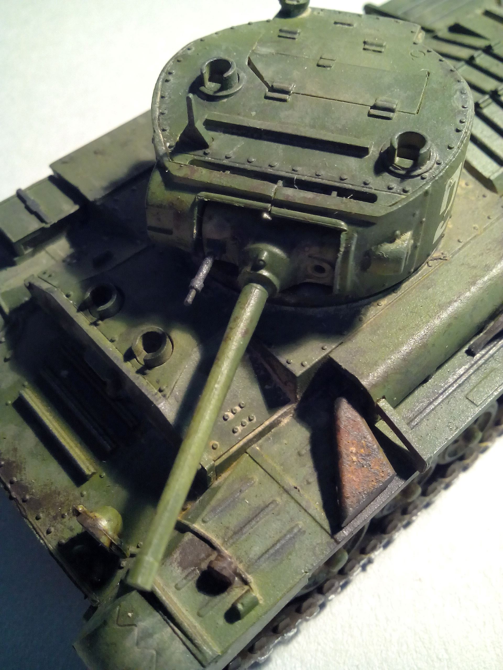 Es handelt sich um einen British Infantry Tank Mk III "Valentine" in 1/48 von Bandai, mit dem Bau wurde schon begonnen. Primer aus der Dose von AK, Farbe von MRP Light Green, mit Filter, Wash und Pigmenten von AK, Mig gealtert