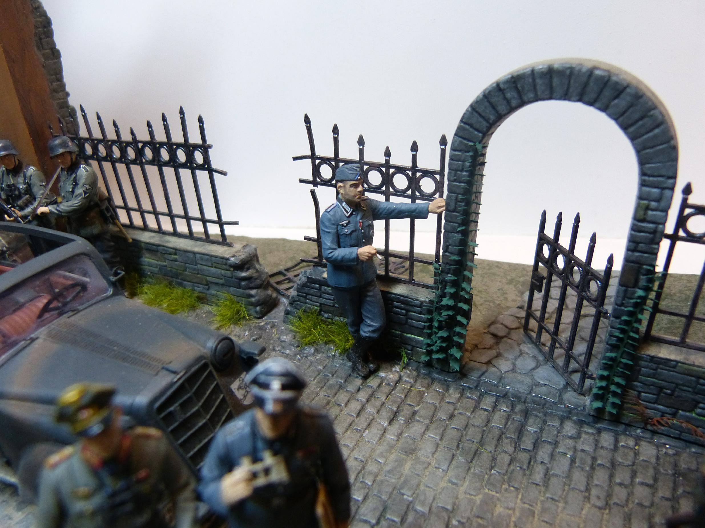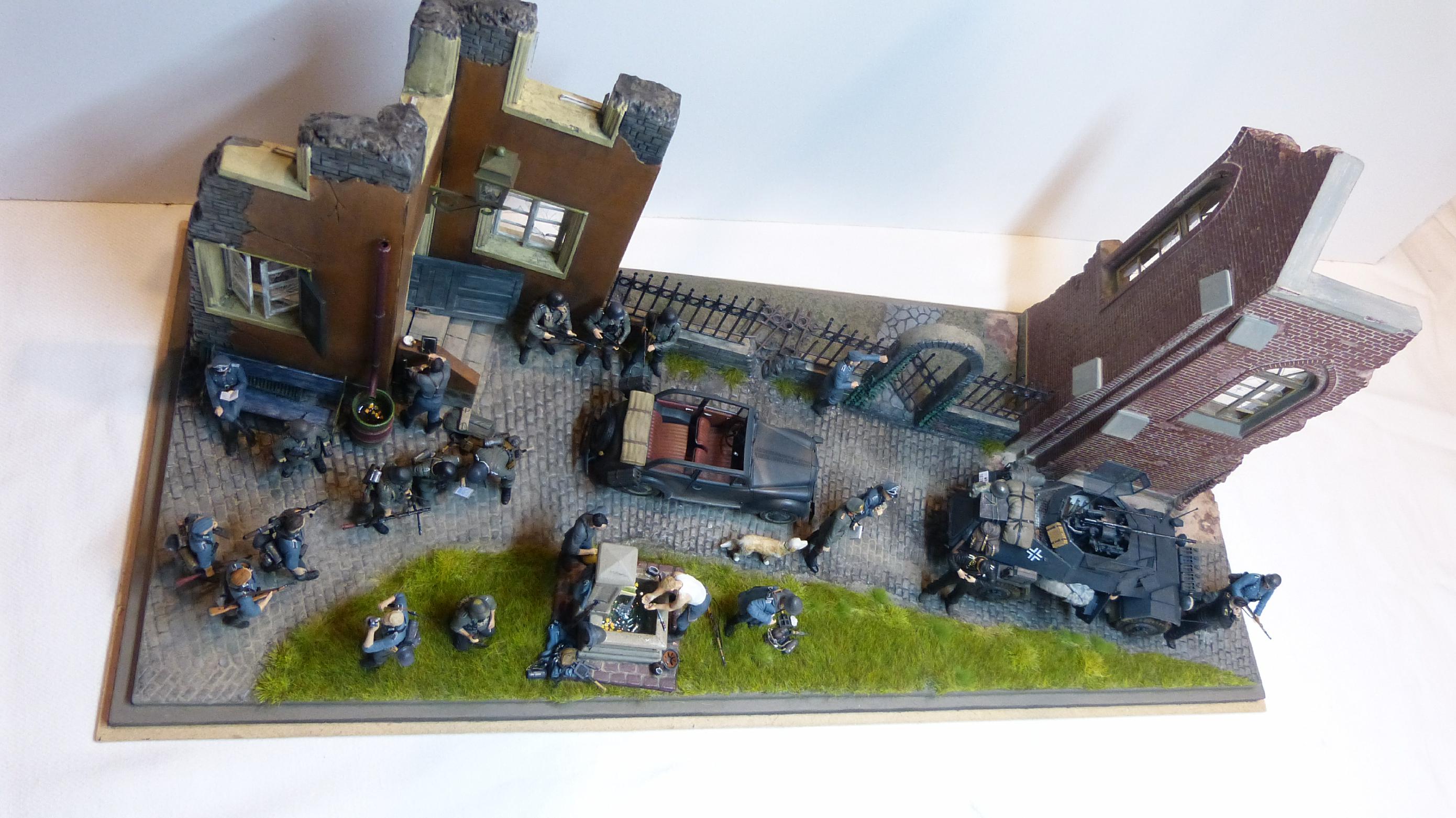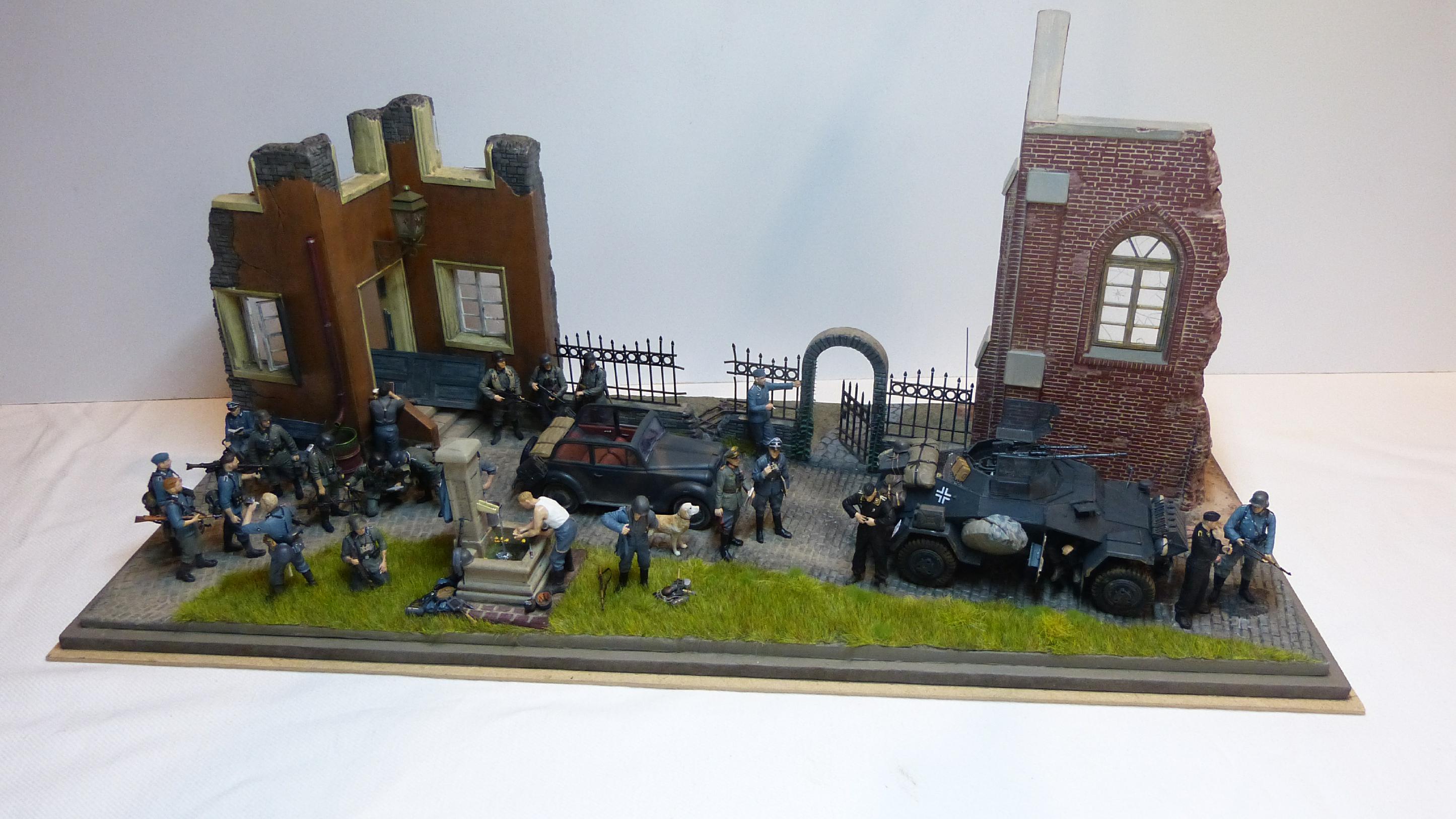 Am 18.05.40 wurde die Standarte 1 „Deutschland“ von der 225. Infanteriedivision bei Walcheren (Niederlande) im Rahmen des Westfeldzugs („Fall Gelb“) abgelöst. Die fiktive Szene zeigt die beiden Befehlshaber der beiden Kampfverbände, Generalleutnant Ernst Schaumburg (1880-1947) und Standartenführer Felix Steiner (1896-1966) im Gespräch, während sich Angehörige beider Einheiten auffrischen. Schaumburgs Dienstwagen (Opel Olympia) und ein Fahrzeug des Aufklärungszuges (Sd.Kfz 222) sind ebenfalls zu sehen. Während die Männer der Deutschland-Standarte schon mit neueren Feldblusen ausgestattet sind, tragen die Soldaten der Wehrmacht noch das alte Modell M36.