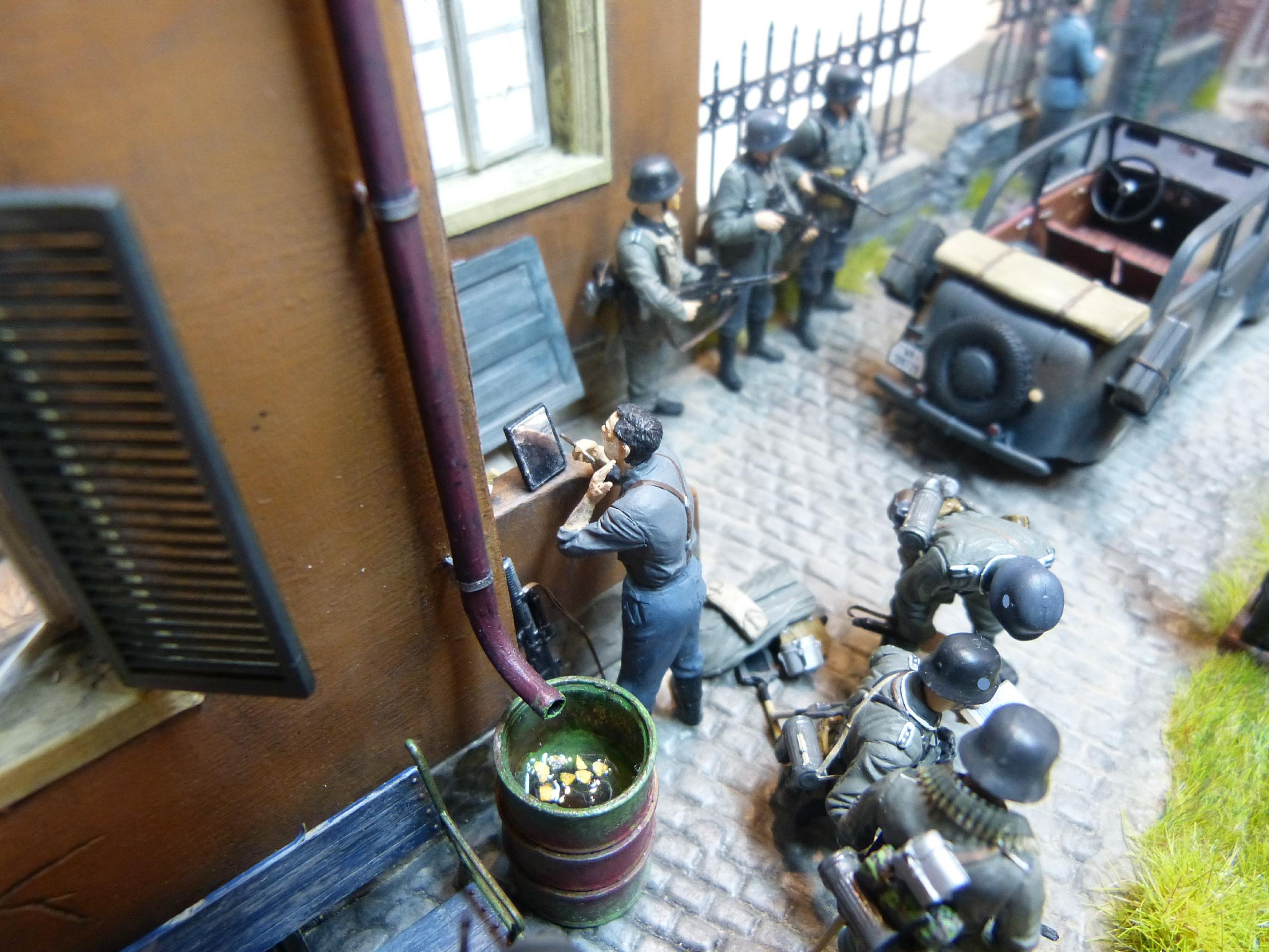 Es ist mit 24 Figuren und 2 Fahrzeugen zugegebenermaßen schon fast ein „Wimmelbild“ geworden. Aber ich mag Dioramen, auf denen viel los ist.