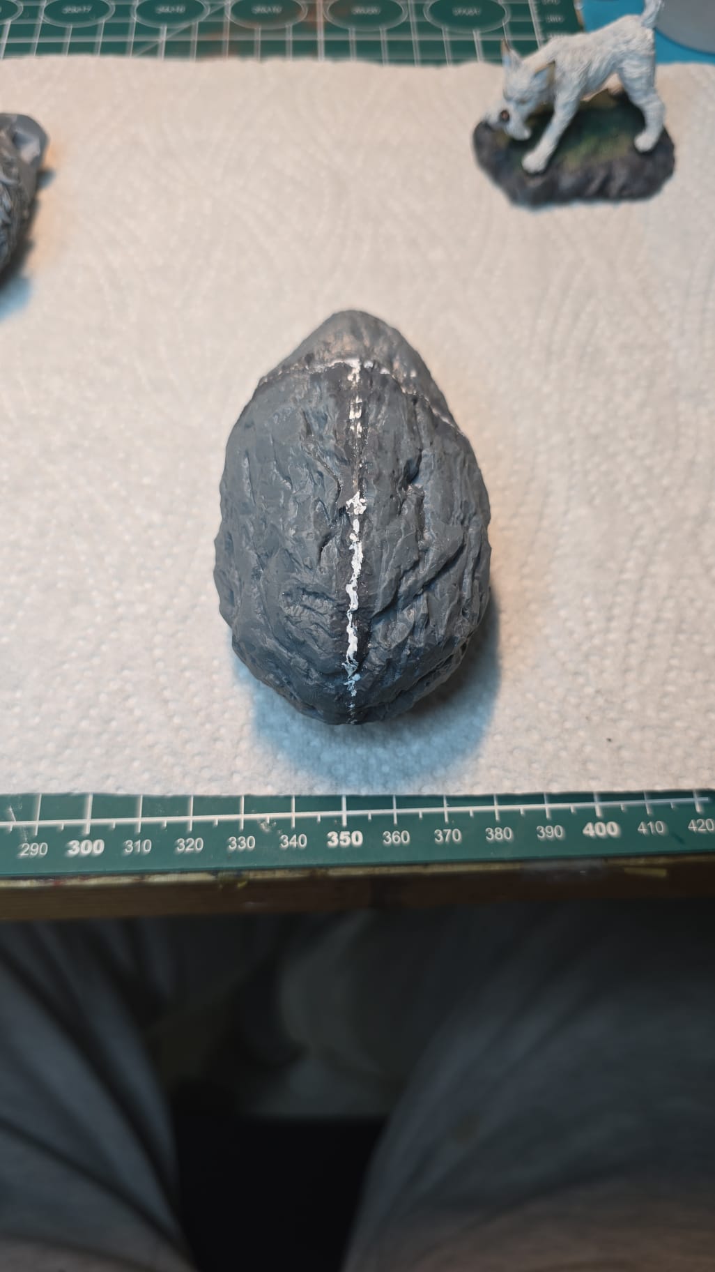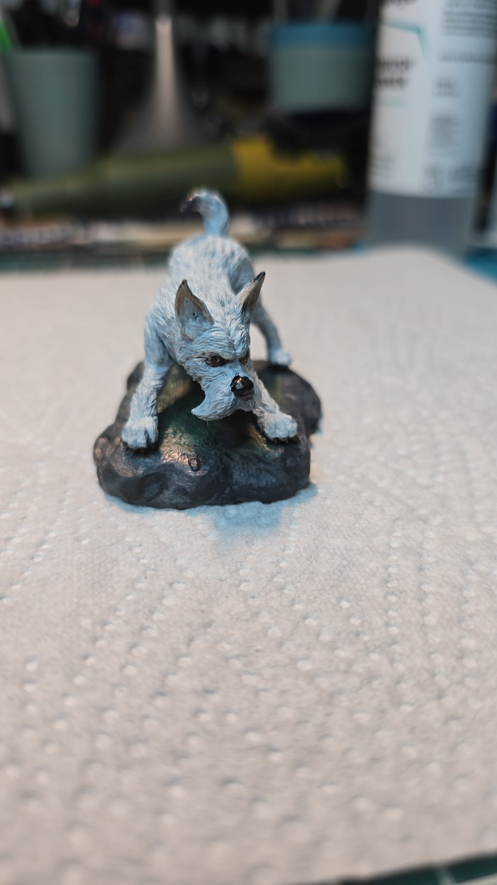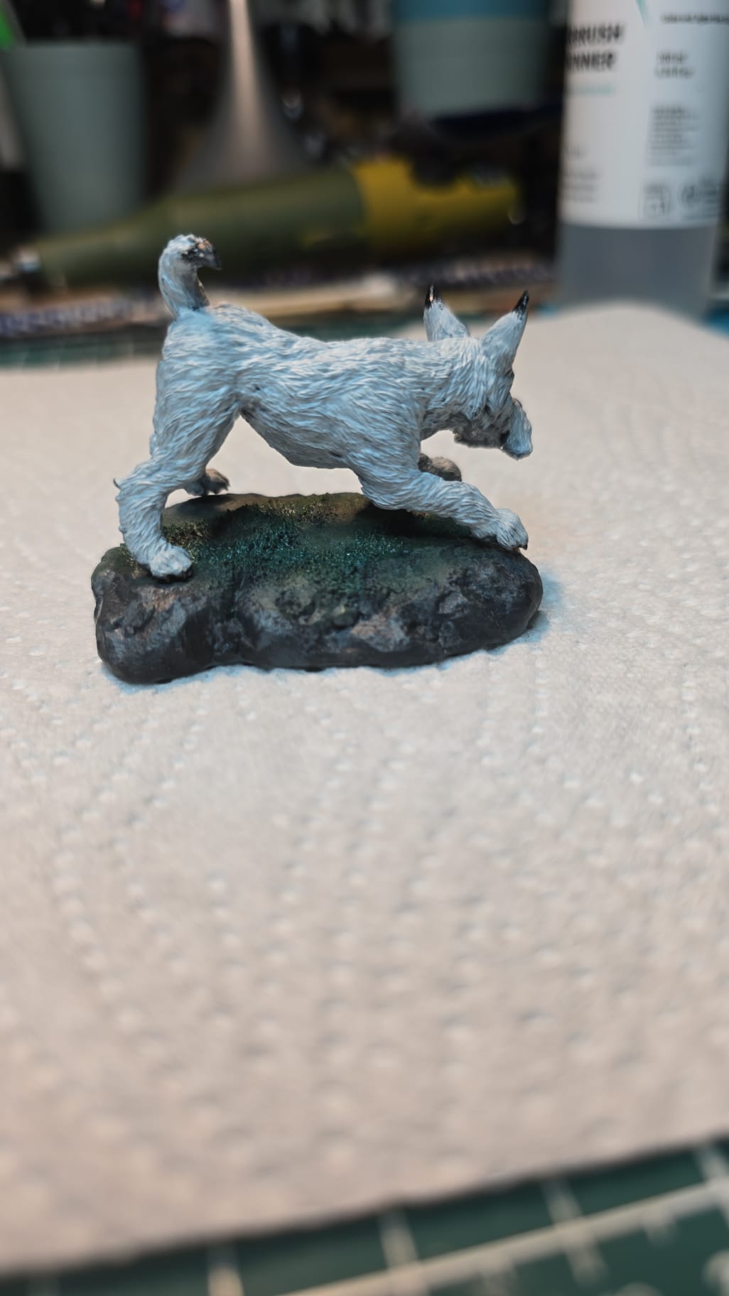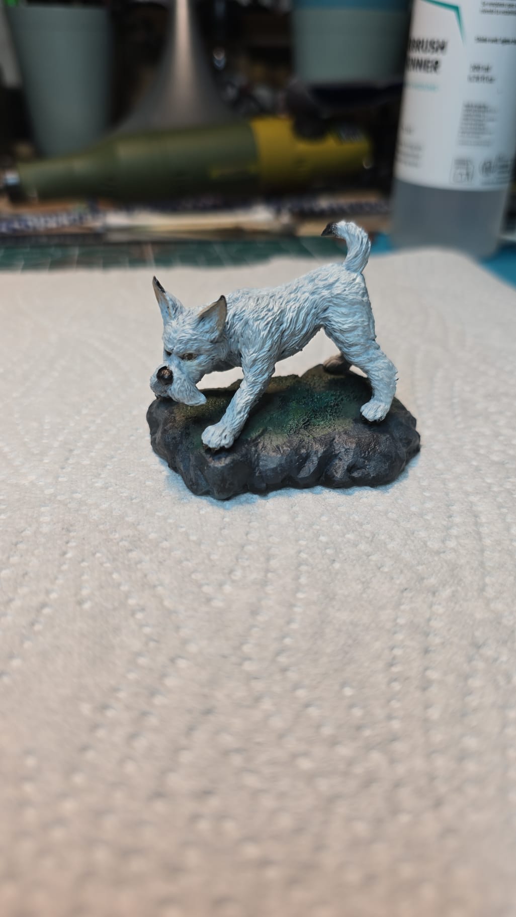 Angefangen habe ich mit Idefix, schwarz grundiert und dann mit cremeweiß Schicht für Schicht trockengebürstet.