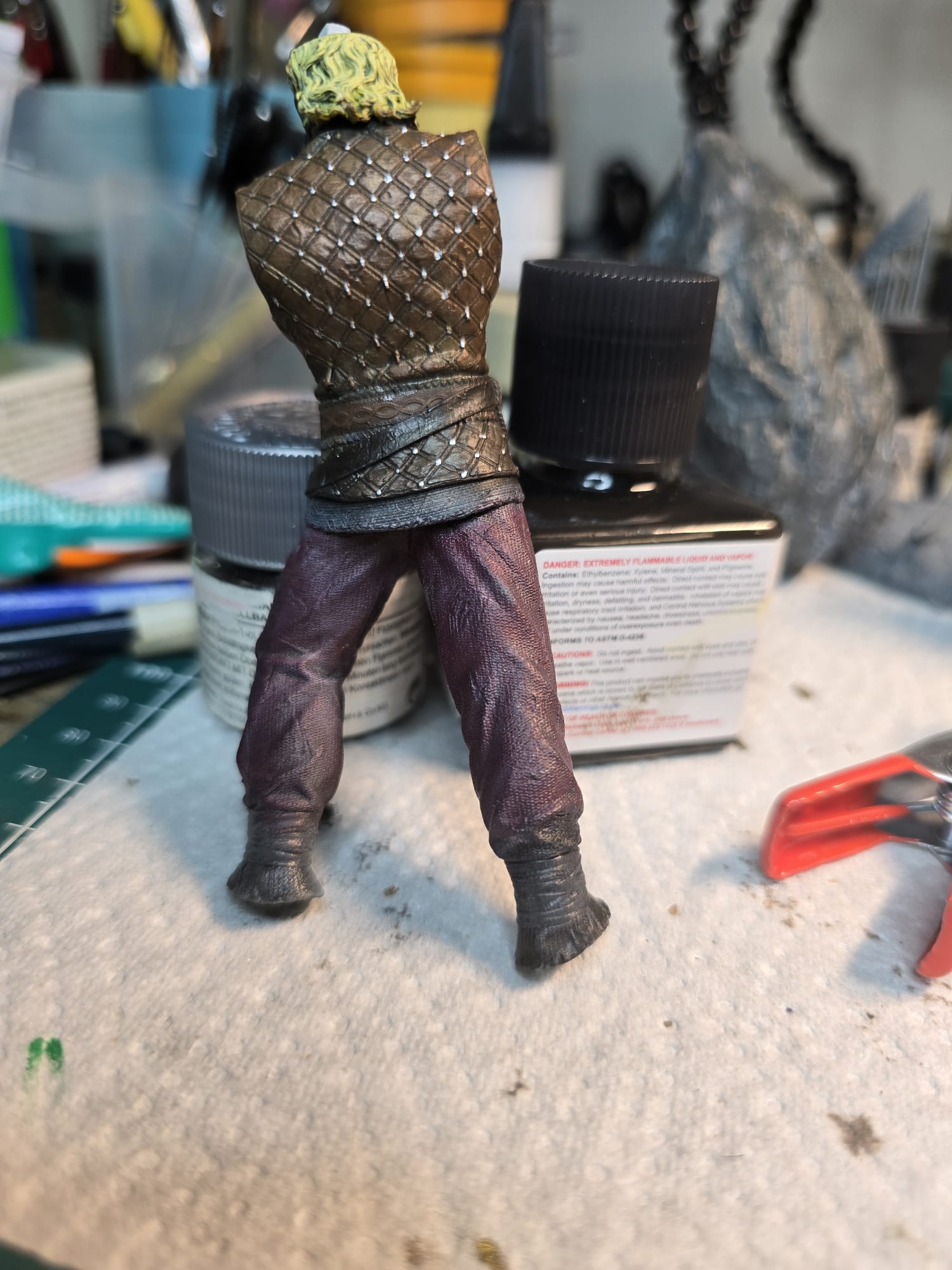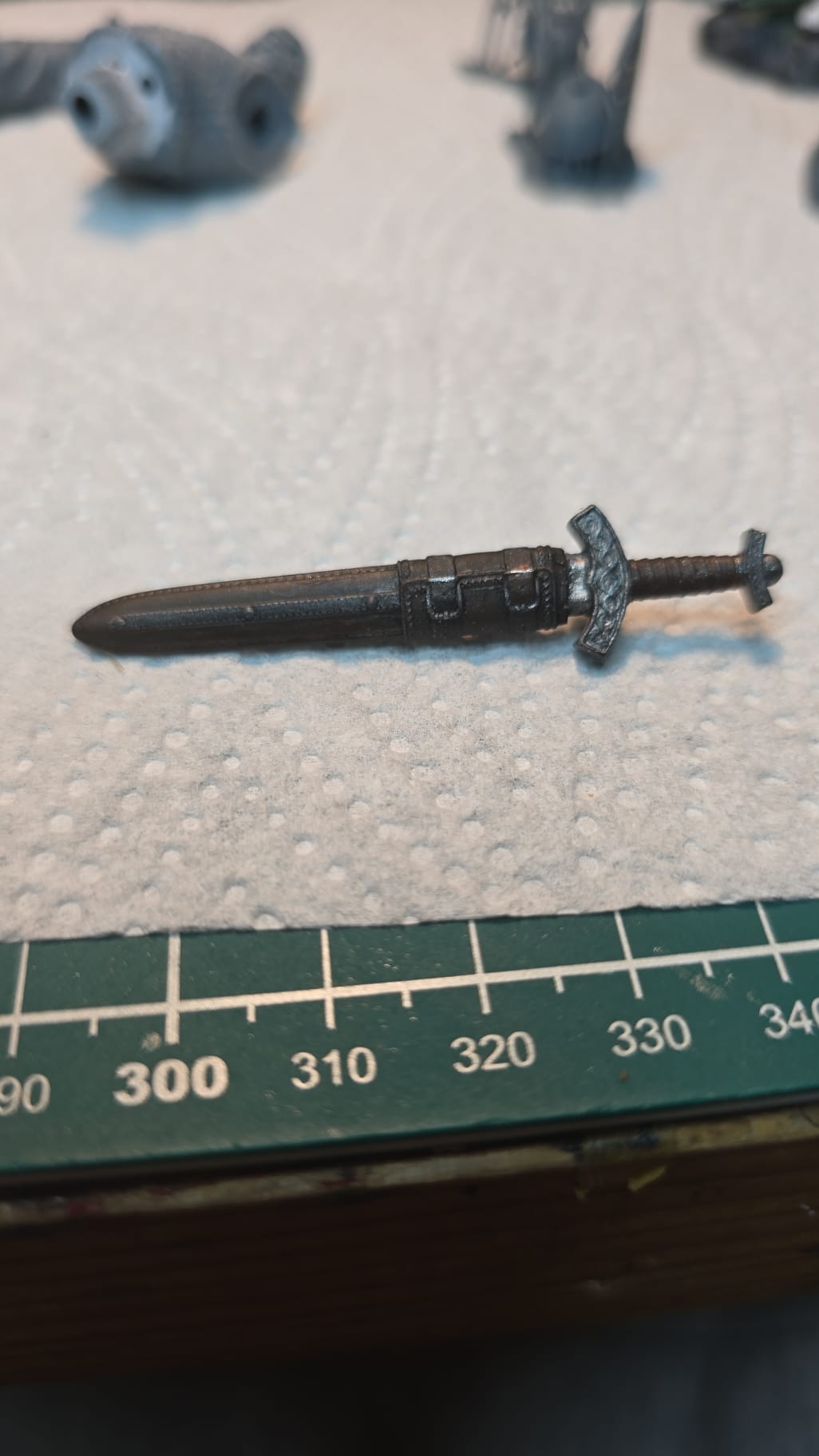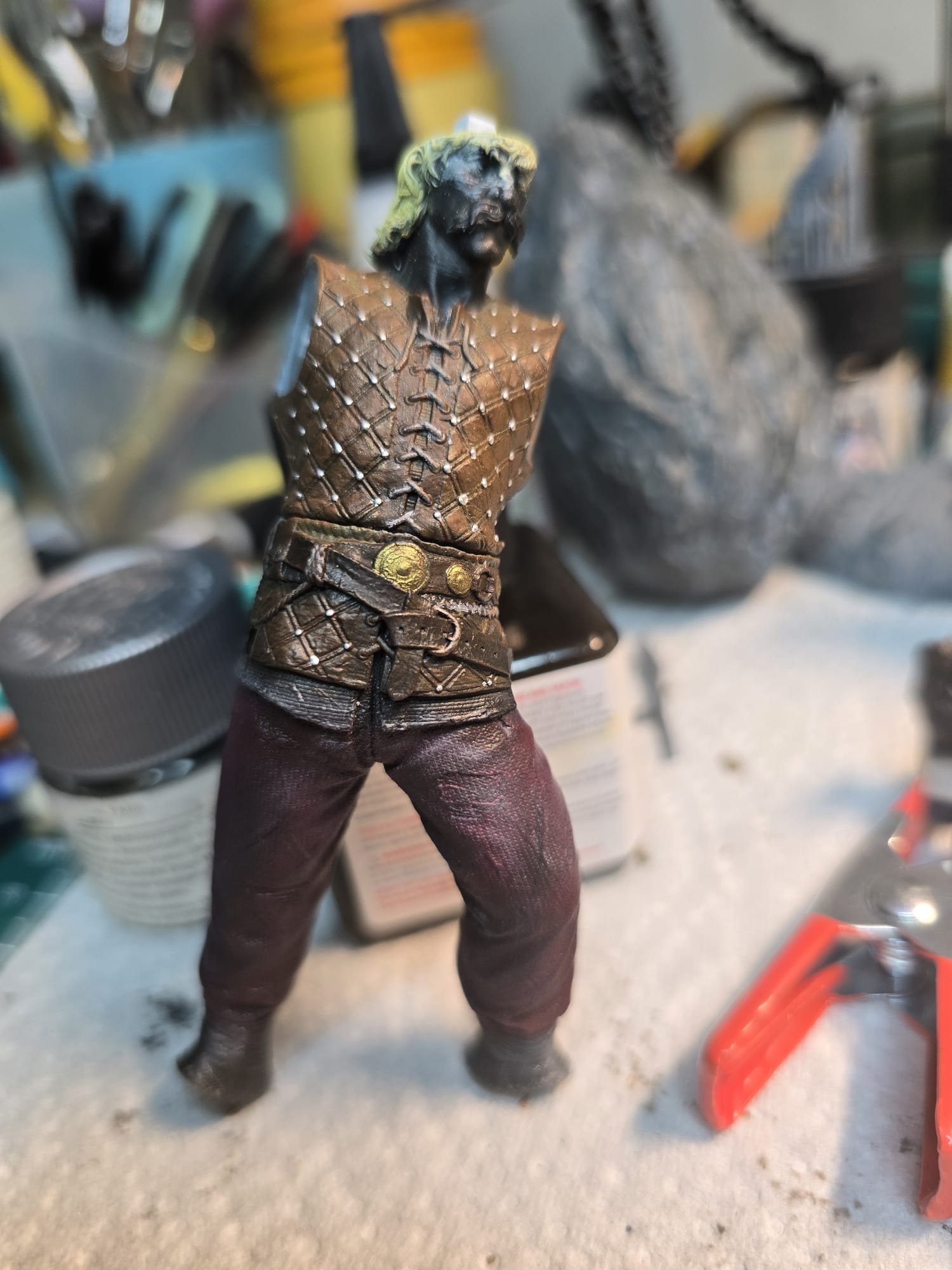 Mal zu Asterix.... wieder schwarz grundiert und mit hellgrau trockengebürstet. Die Hose habe ich dann mit transparentem Rot wieder trocken gebürstet, bis der verschmuddelte Look raus kam. Gürtel, Weste habe ich mit verschiedenen Braun und gelbtönen bepinselt, so dass jedes Teil einen eigenen Braunton hatte. Bei der Weste hat mir Rainers Video geholfen. Die Nieten habe ich mit einem Silberstift gesetzt. Schnüre und so wieder mit grau, und weißen Pigmenten ergrauen lassen. Schnallen und die große Öse im Gürtel habe ich mit Messing und silber gemacht und mit weiß mattiert.