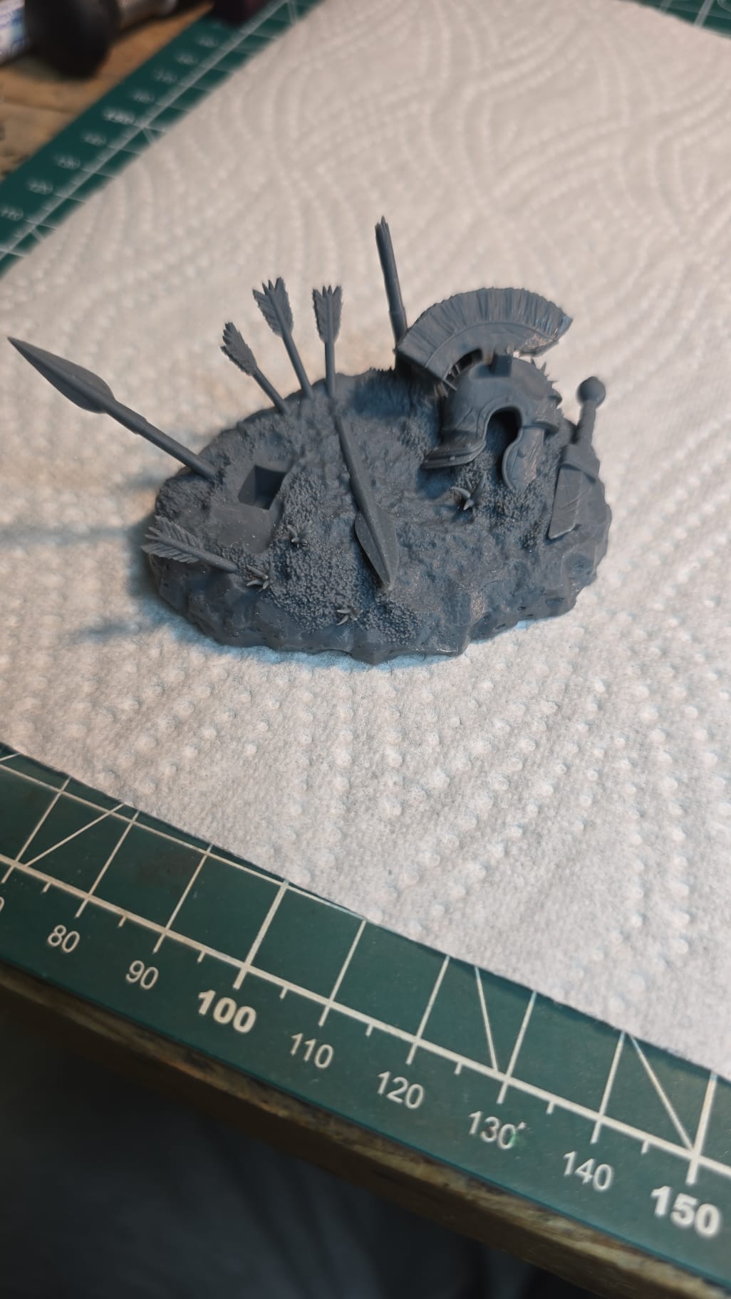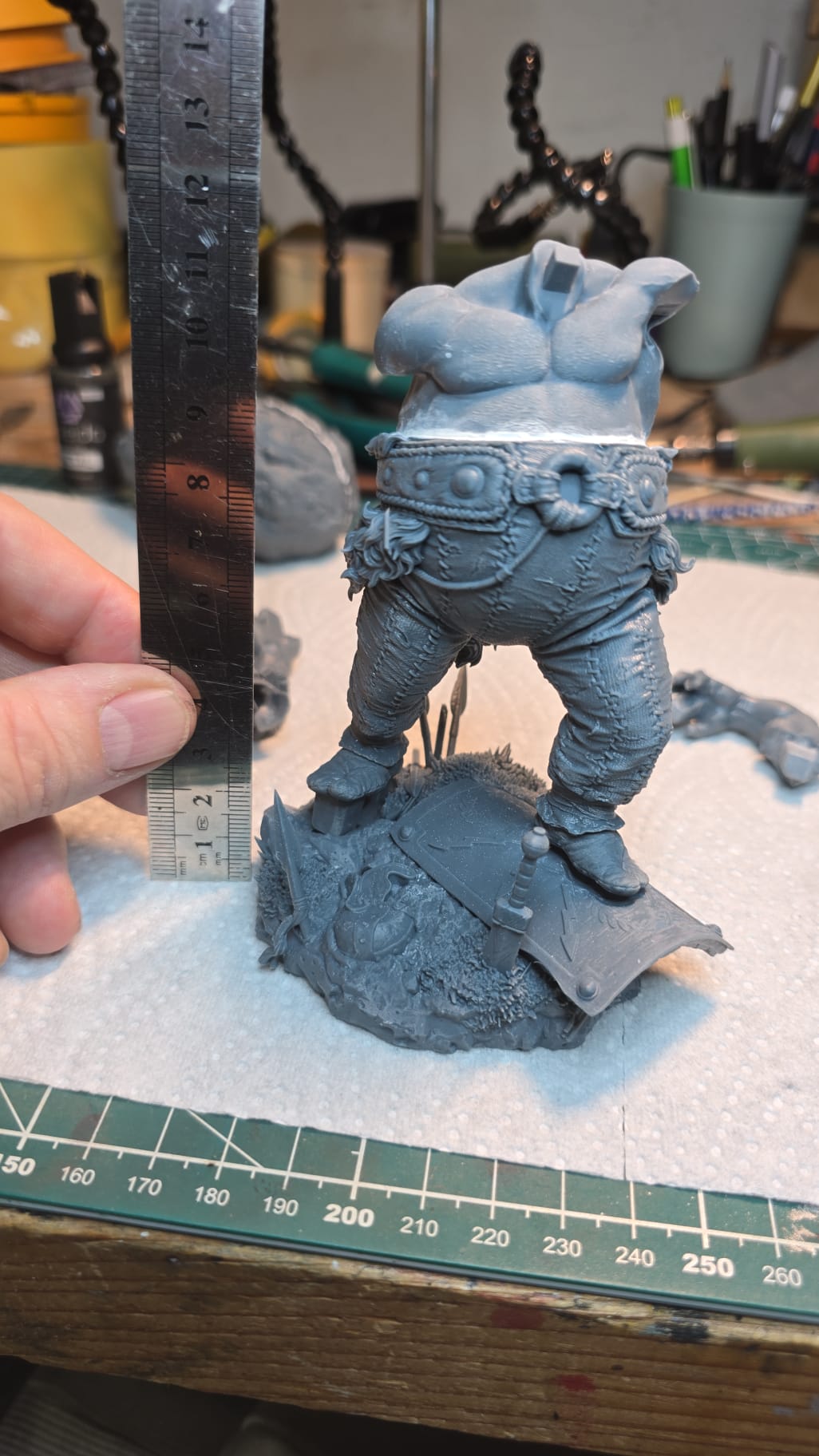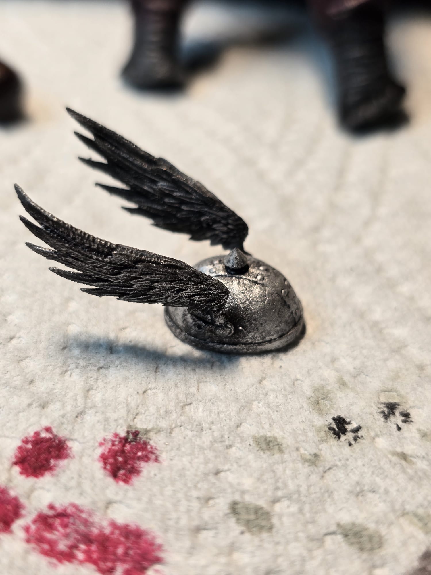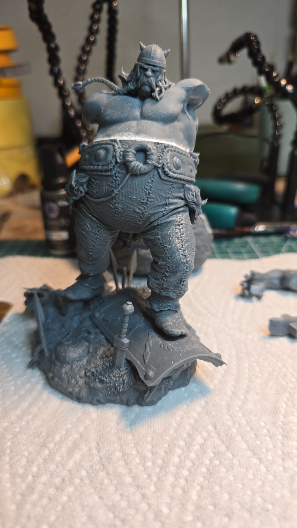 Mal zu Asterix.... wieder schwarz grundiert und mit hellgrau trockengebürstet. Die Hose habe ich dann mit transparentem Rot wieder trocken gebürstet, bis der verschmuddelte Look raus kam. Gürtel, Weste habe ich mit verschiedenen Braun und gelbtönen bepinselt, so dass jedes Teil einen eigenen Braunton hatte. Bei der Weste hat mir Rainers Video geholfen. Die Nieten habe ich mit einem Silberstift gesetzt. Schnüre und so wieder mit grau, und weißen Pigmenten ergrauen lassen. Schnallen und die große Öse im Gürtel habe ich mit Messing und silber gemacht und mit weiß mattiert.