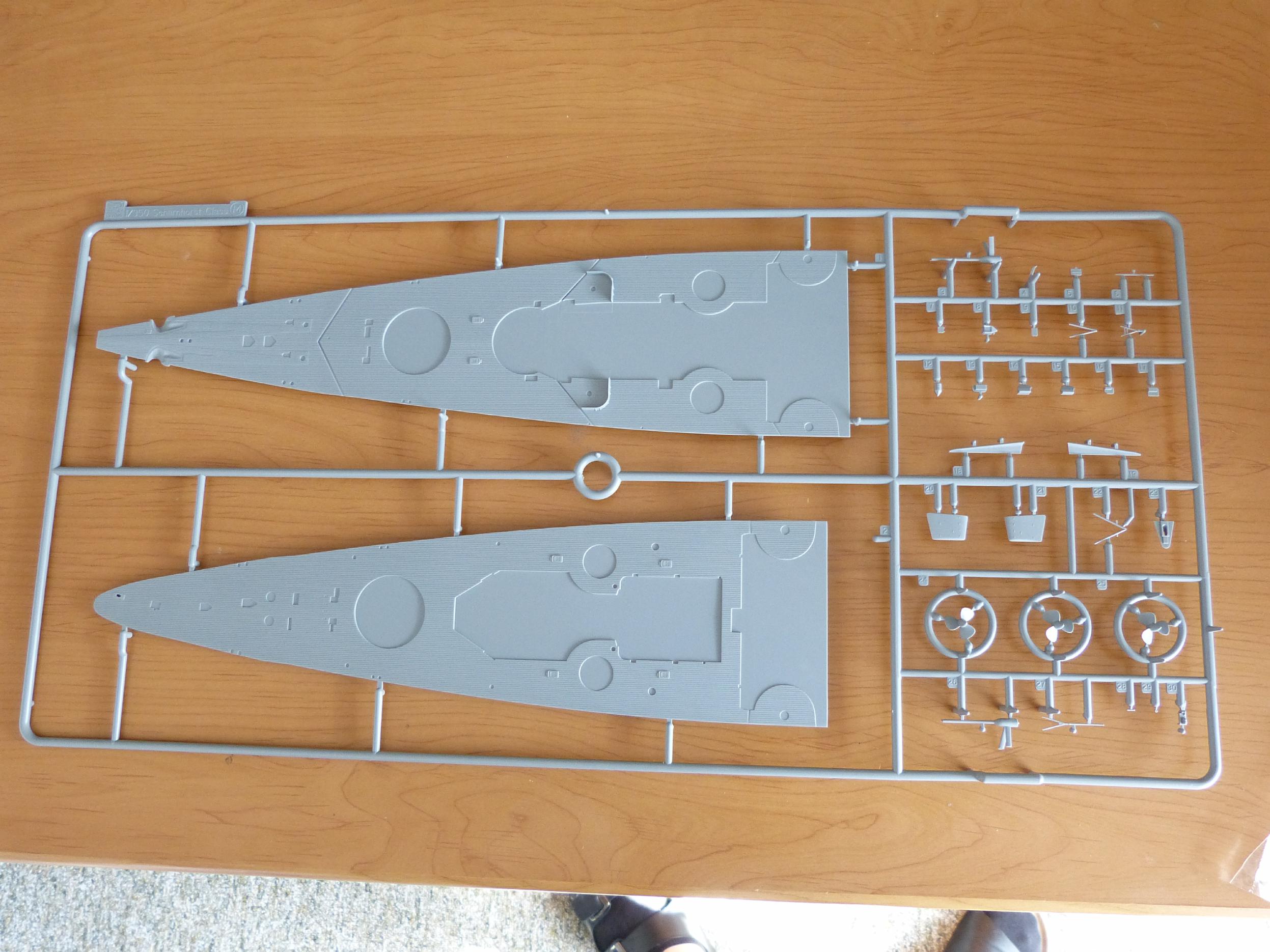 Der Rumpf erscheint sehr robust und besteht aus 2 Teilen, wobei der untere Teil in Sachen Details sehr stiefmütterlich behandelt wurde, er bietet keinerlei Strukturen. Es gibt keine Bugschallanlage (wie bei allen Bausatzherstellern) und kein Horchgerät (bei BS/TP-Revell wenigstens als gutgemeintes Decal). Kann man aber alles improvisieren. Schwieriger wird es mit den Auslässen für die Turbinen, die hat Dragon komplett ignoriert (3 Stück bei SH vorhanden) – bei Revell BS und TP vorbildlich dargestellt, sogar bei beiden Schiffen originalgetreu unterschiedlich. Was auch fehlt ist die MES-Kabel-Schleife am Rumpf (beispielsweise bei PG-Trumpeter mit dargestellt).