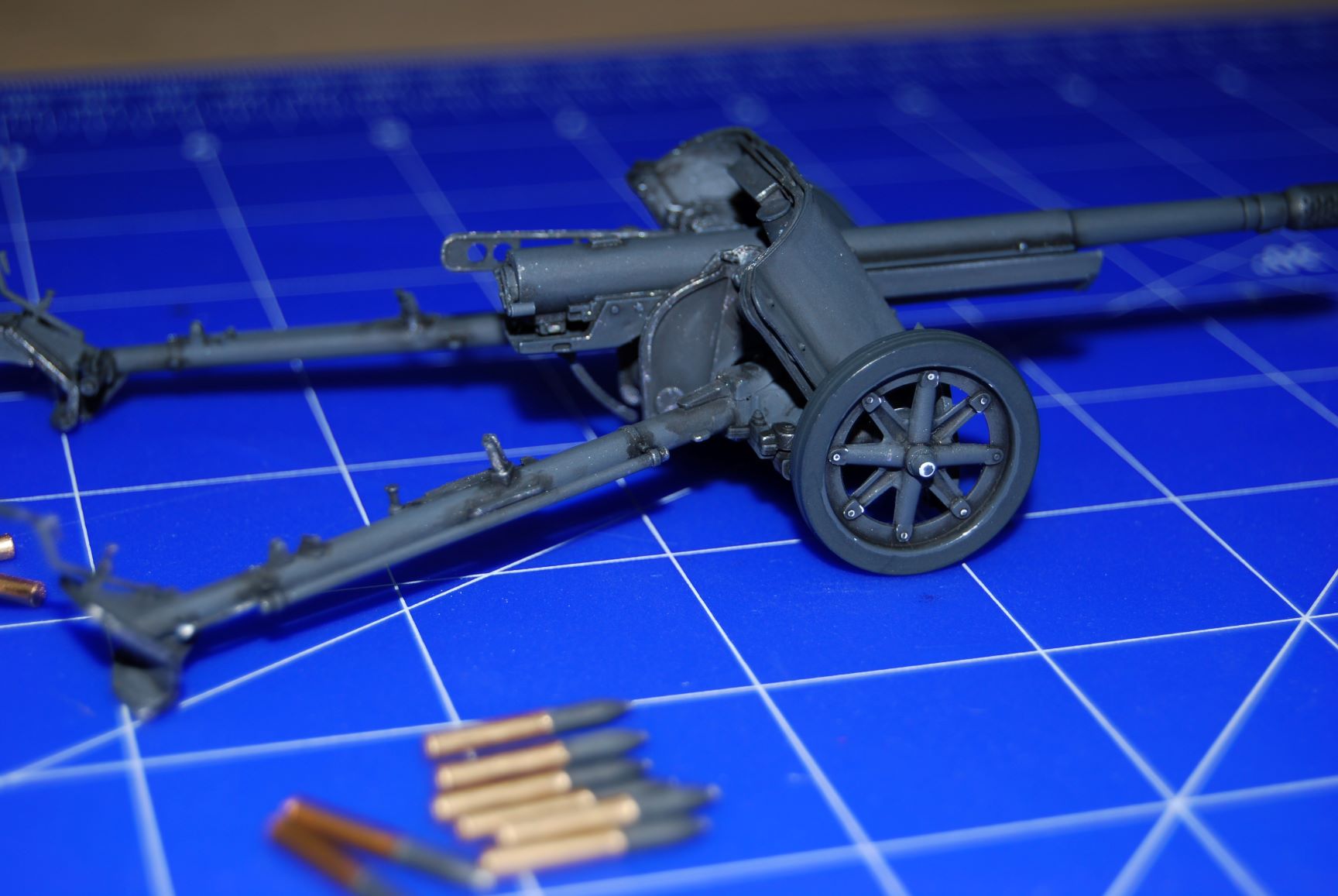Die Geschütz Bedienung aus dem Bausatz habe ich noch nicht bemalt. Die Figuren von ITALERI finde ich so grottenhäßlich. Meinem Sohn gefällt das Teil auch ohne Figuren.