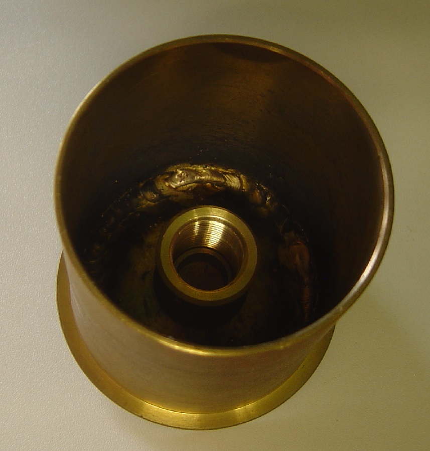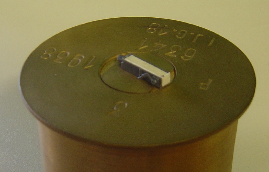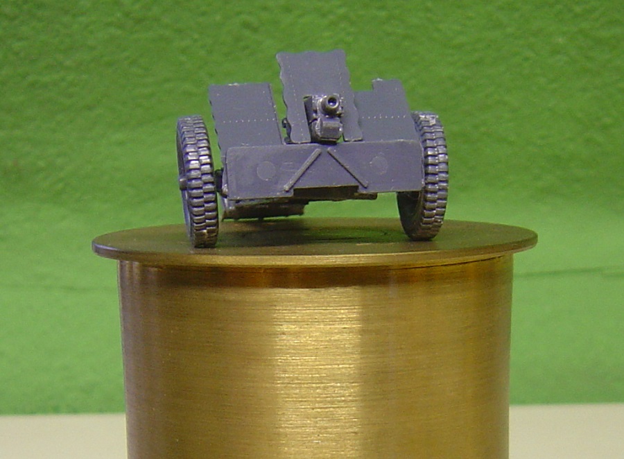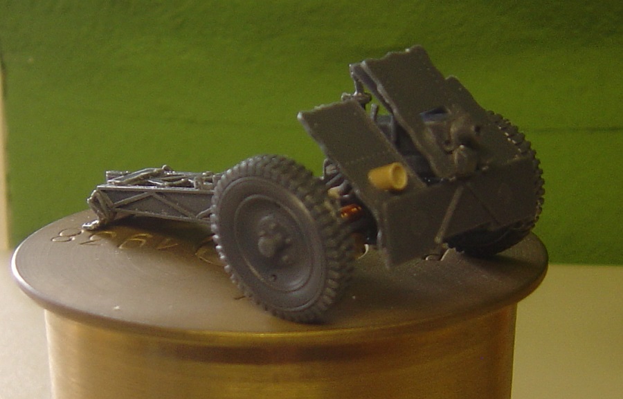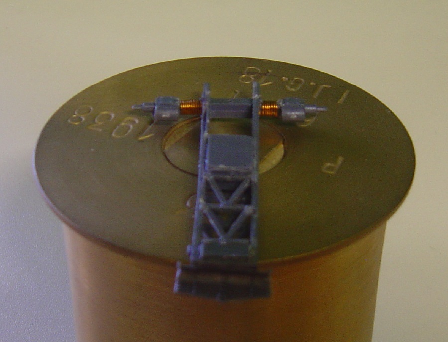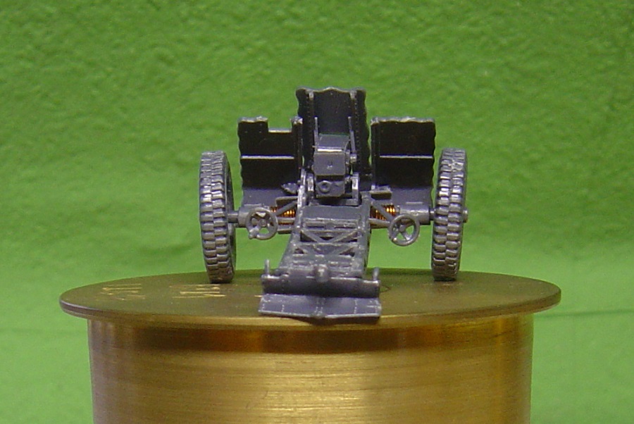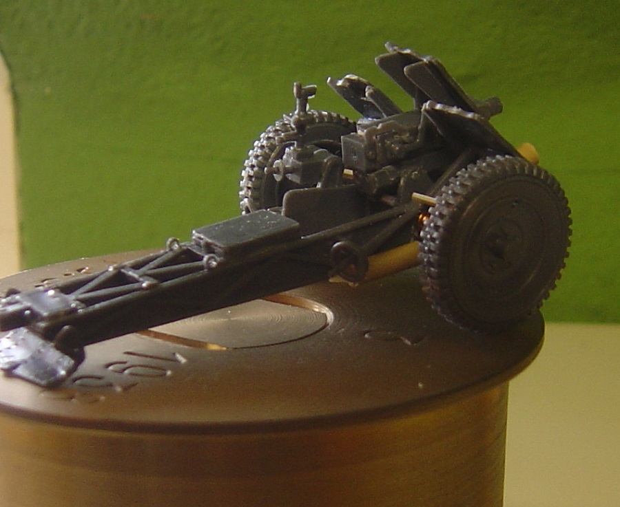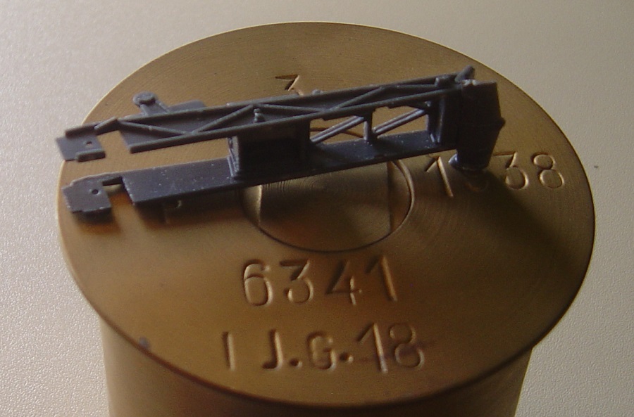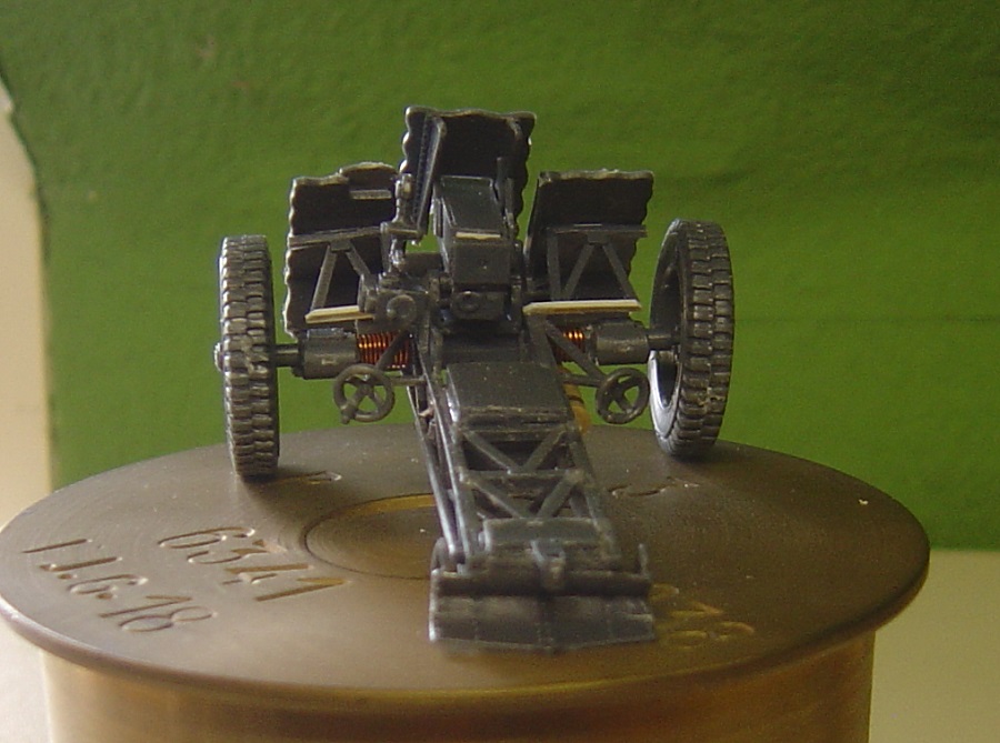 Weil die Munition in dem Bausatz falsch dargestellt ist habe ich aus einer alten Schlauchtülle eine Kartusche in 1 :1 gebaut. Da passt dann das Geschütz hinterher gut drauf.