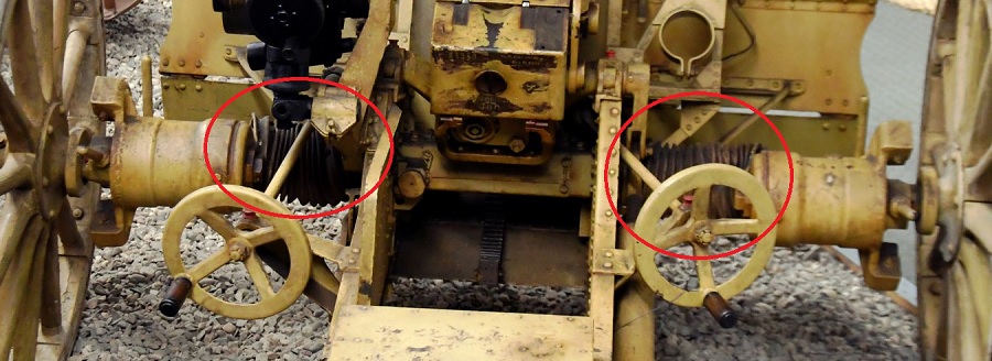 Diese Faltenbälge schützen den Bereich der Achse die zum verstellen des Seitenrichtbereiches ( je 5,5° zu jeder Seite )erforderlich waren. Das heißt das die Lafette nach rechts oder links auf der Achse verschiebbar war, mittels des rechten Handrades,
