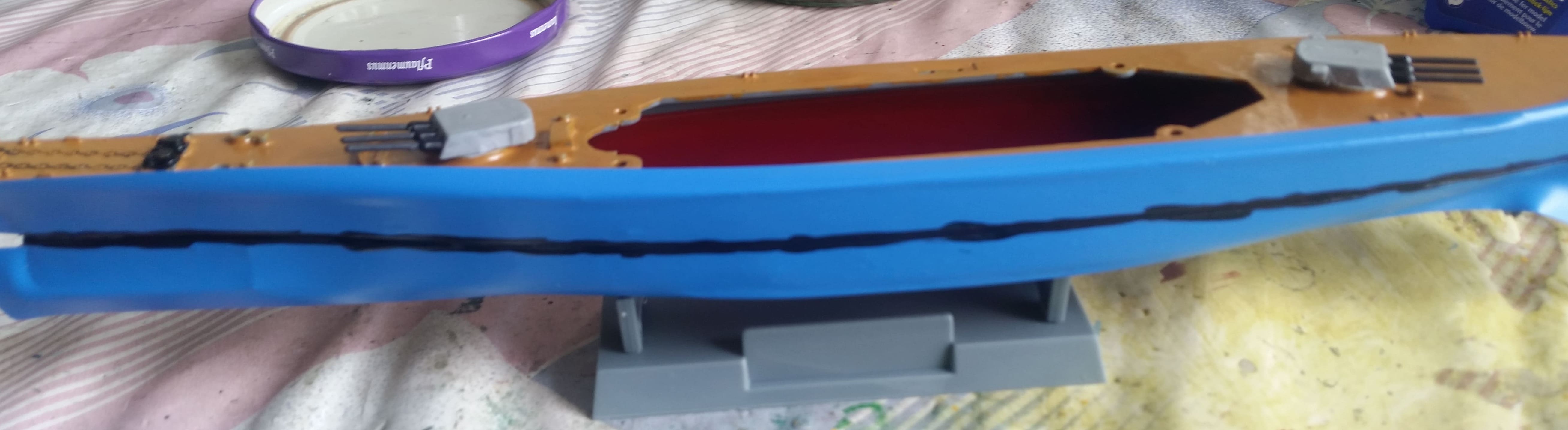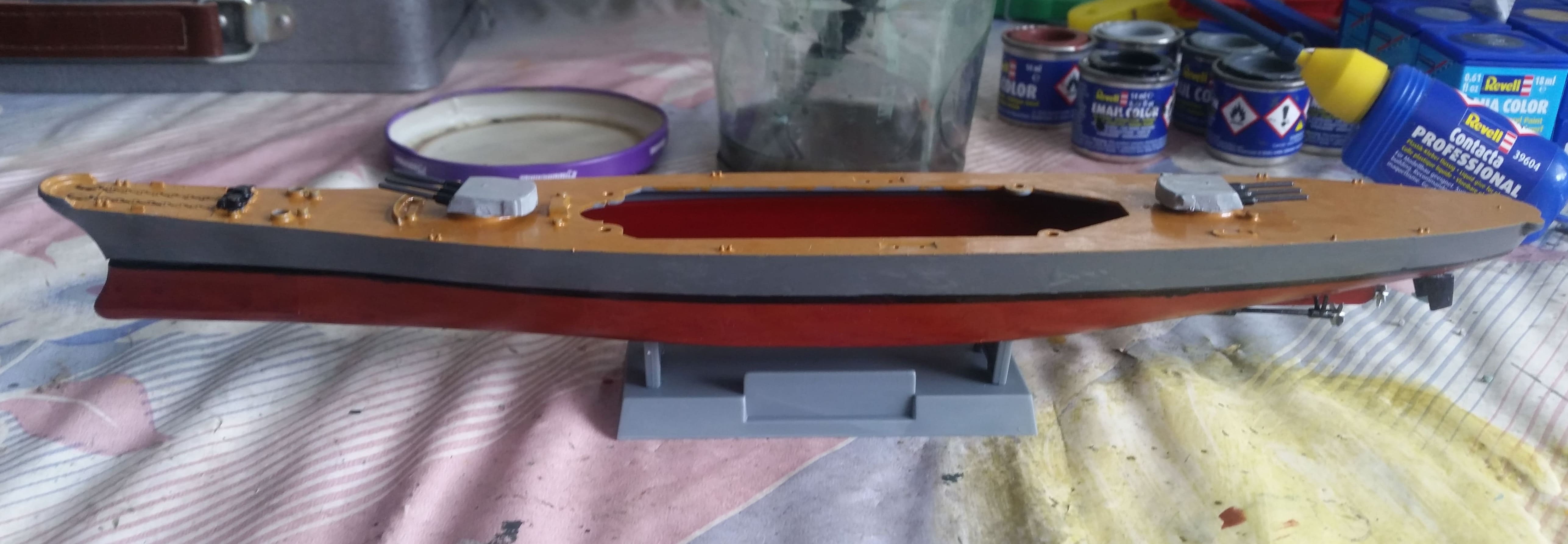 Jetzt wird der Rumpf komplett bemalt und die Wasserlinie (ich glaube, die heißt so) schwarz bemalt. Die Drillingsgeschütze sind schon drehbar montiert und das Deck ist bemalt.