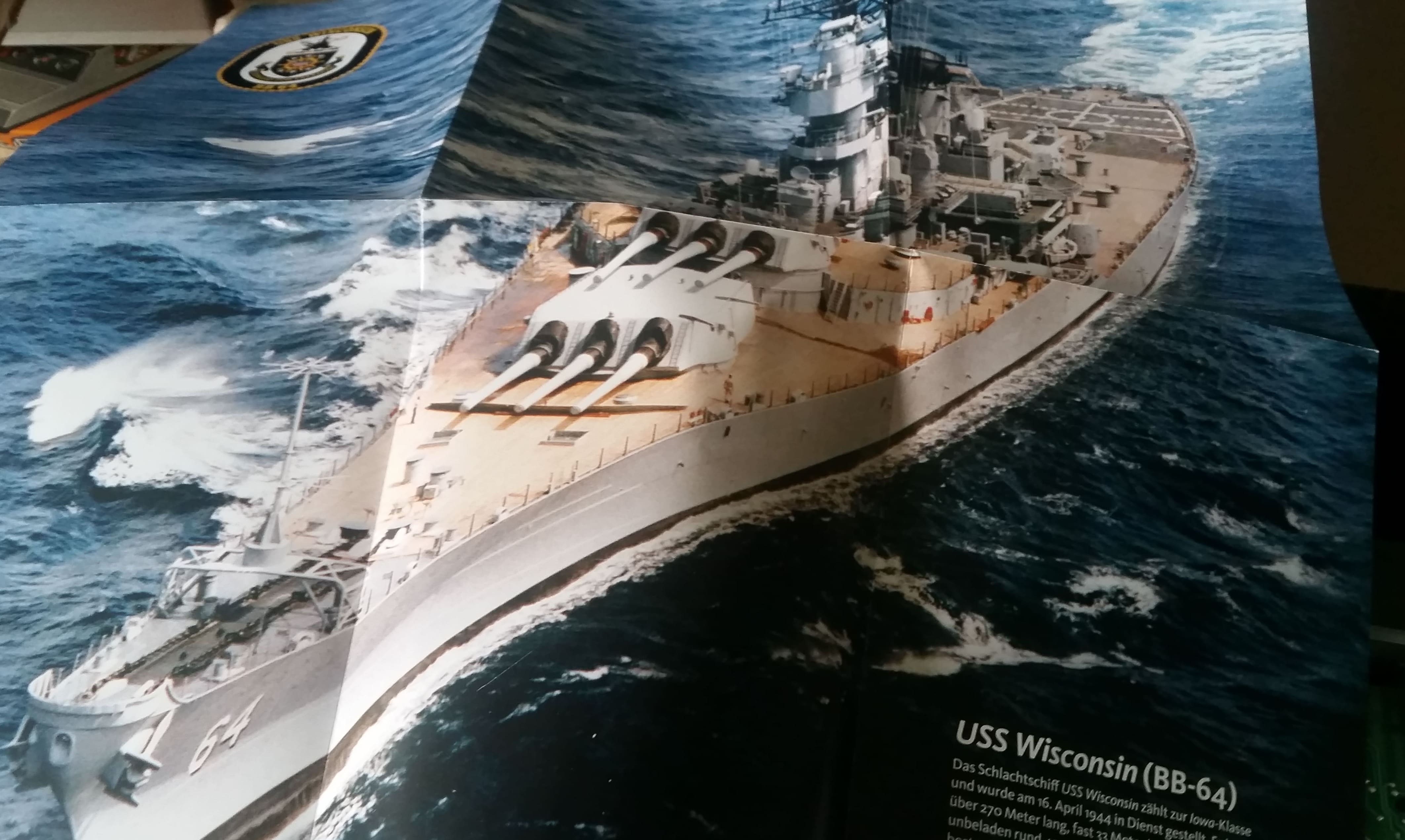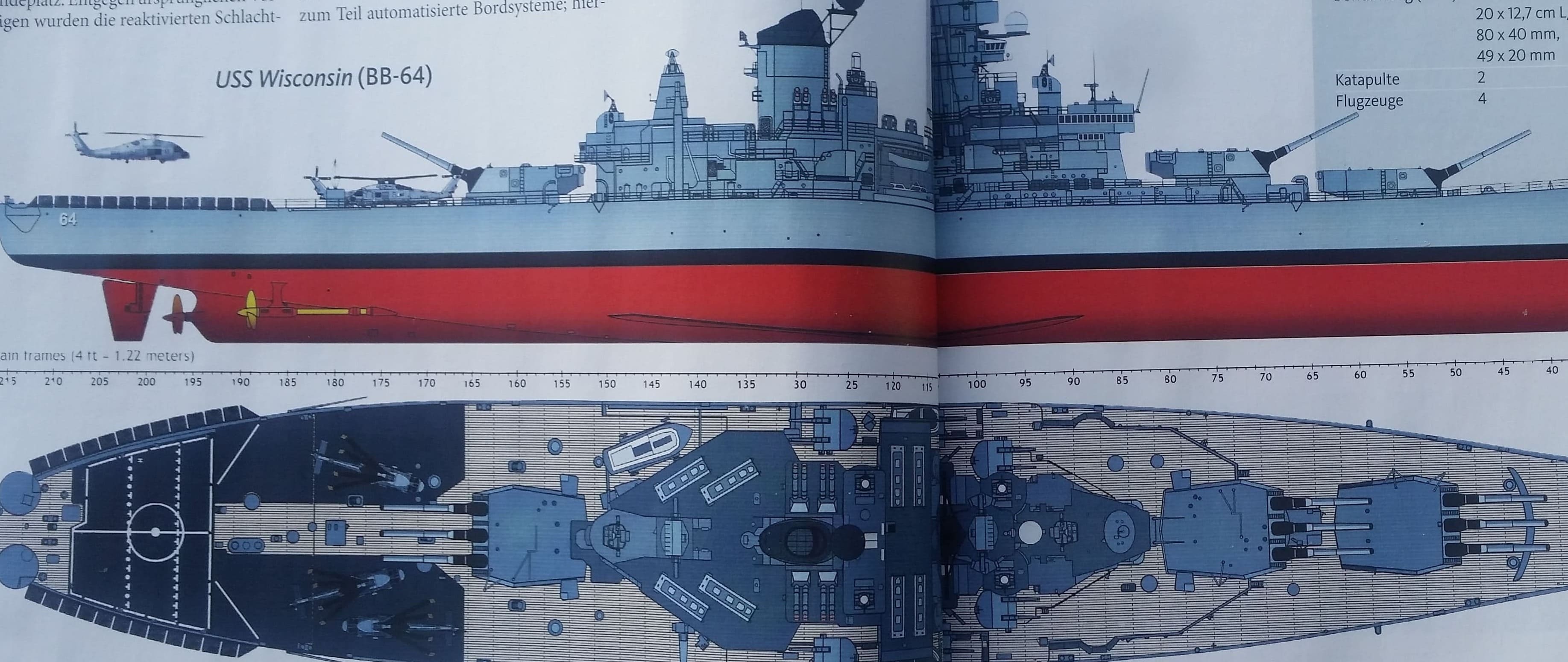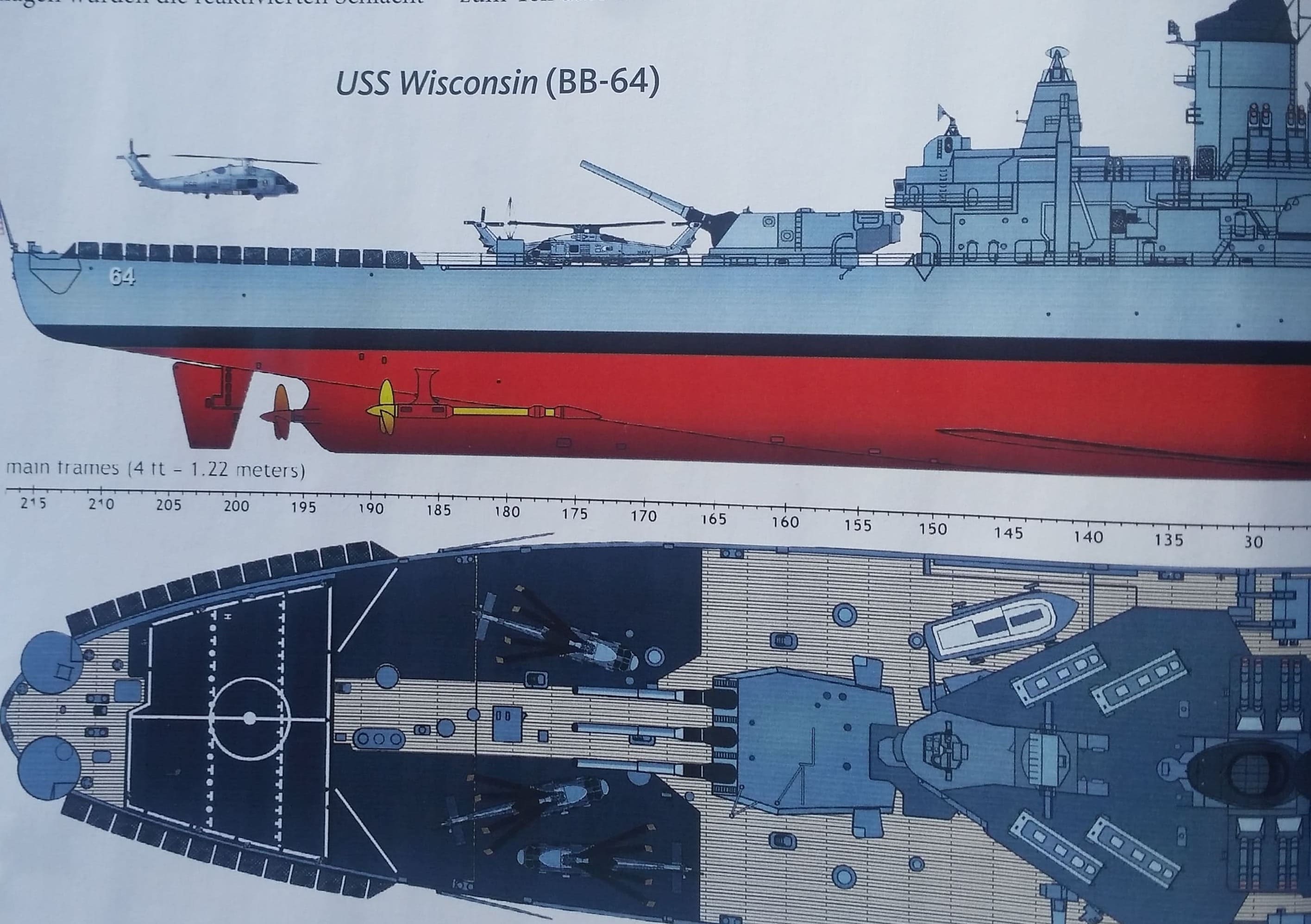 Hab jetzt ein Bild der U.S.S. Wisconsin bekommen. Eines der Schwesternschiffe der U.S.S. New Jersey aus der IOWA-Flotte. Das Deck ist heller, vorne unter den Ankerketten ist der Boden grau und ganz hinten ist ein Hubschrauberlandeplatz vorhanden. Mal sehen, was ich da noch machen kann. Gruß Ingo