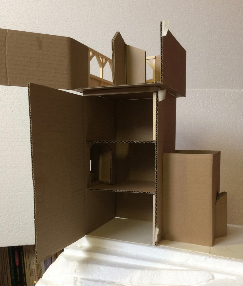Um mit dem Bau schnell voranzukommen, entschloss ich mich, mehrschichtigen Karton zu verwenden. Den kann man gut mit einem Messer schneiden. Fenster und Tore sind rasch ausgeschnitten und wenn etwas nicht passt, kann man es ohne grossen Verlust auswechseln.