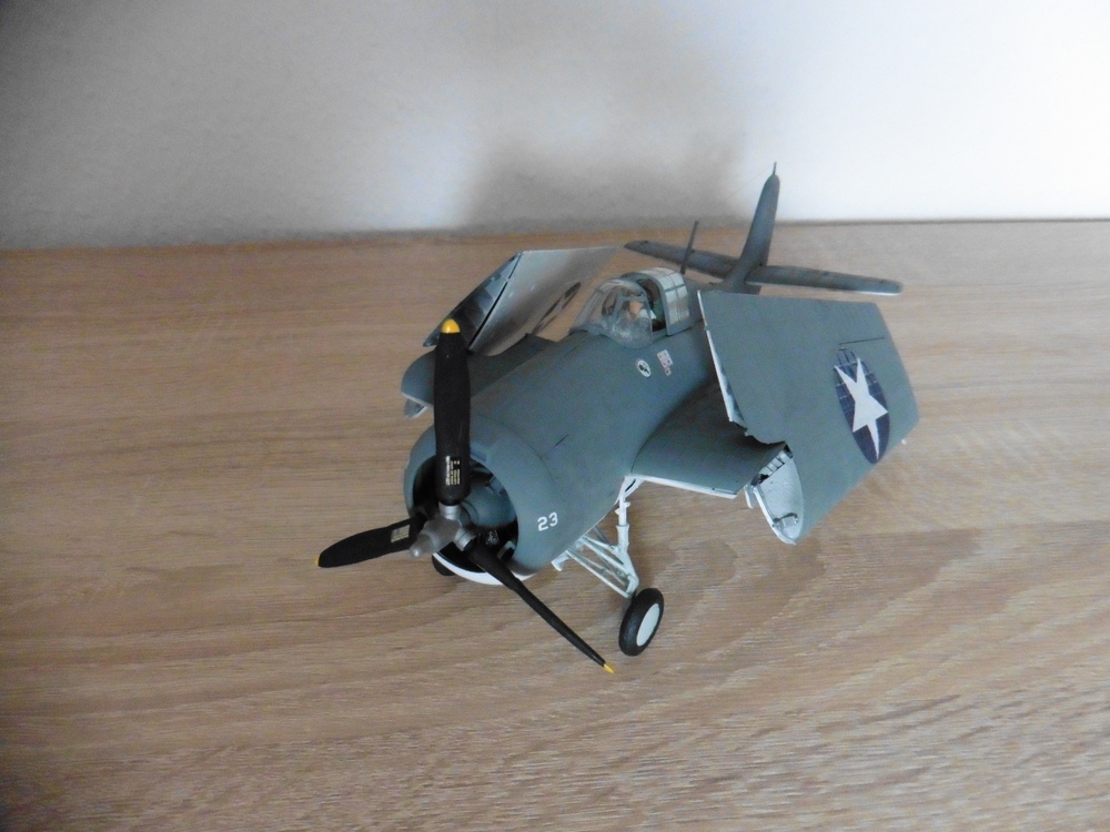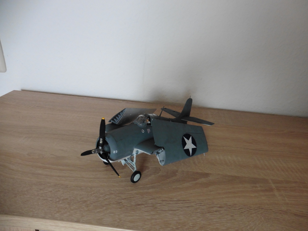 Als besonderheit kann man bei der Wildcat die beiden Flügel anklappen . Da die Maschine optisch kein Hingucker ist habe ich sie mit angewinkelten Flügel hier stehen . Die Klappmechanick ist zwar nett gedacht aber leider nicht ganz ausgereift. Sobald man die Flügel in Flugposition stellt klappen diese an den Enden leicht nach unten und somit hat man eine fiese offene Nahtstelle auf dem Flügel , was nicht so gut aussieht . Angewinkelt wirkt die Masschine doch viel interessanter.