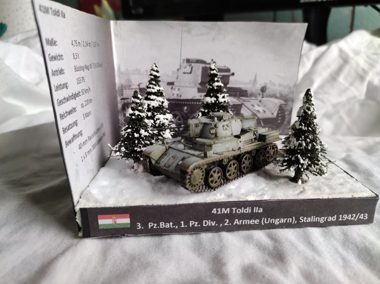 Das Diorama bildet eine kleine Styrodurplatte. Hier wurden die "Klobürsten" Wintertannen eingeklebt, wobei man sagen muss das die in dem Maßstab noch überzeugen. Anschließend kam eine Schicht Gips und Schneepulver auf die Platte. Mit verdünnter Erdfarbe habe ich dqann die Fahrspuren nach gemacht.
