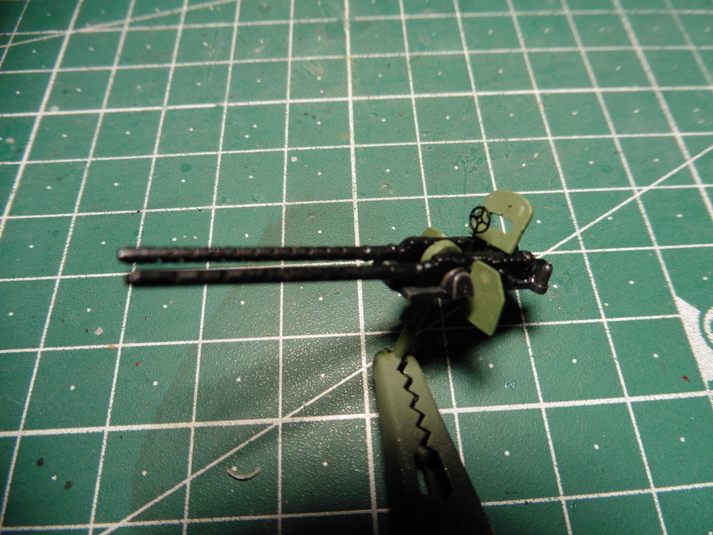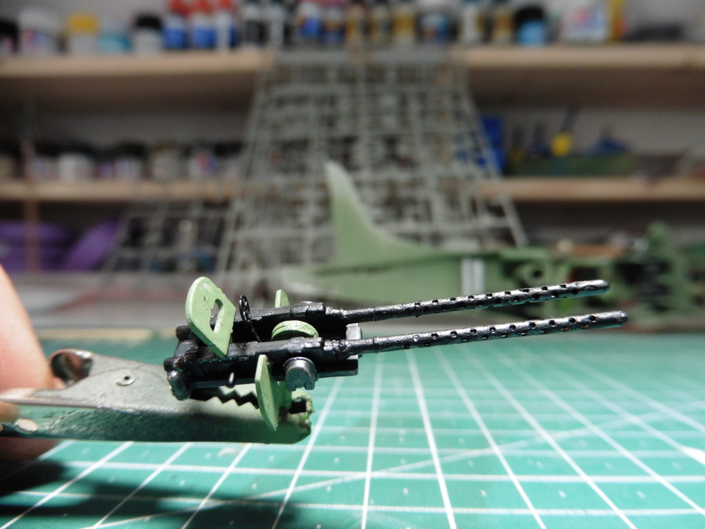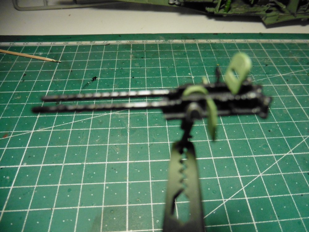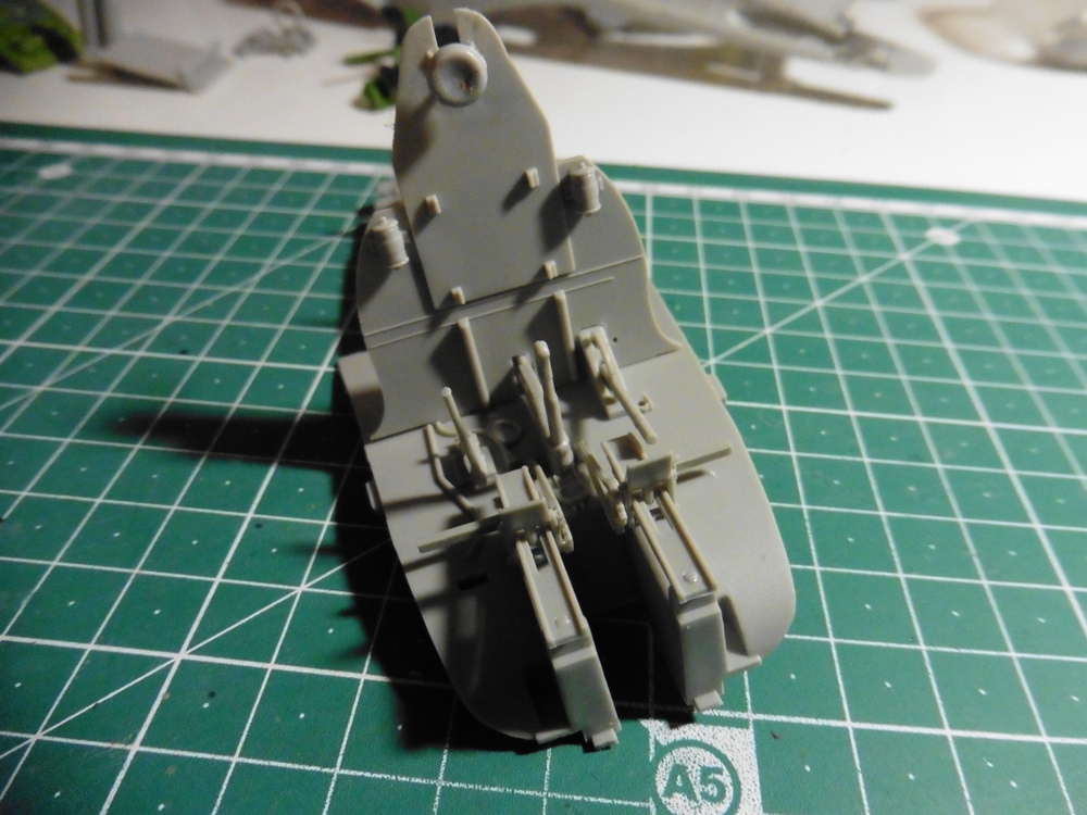 Die Sitz- Steh-Gondel war einfach . Die Halterung des Doppel 7,62 Geschützes war nur angedeutet gelocht . Ich habe dann mit einem Handbohrer die Löcher nachgearbeitet war ziemliche Fummelei war .