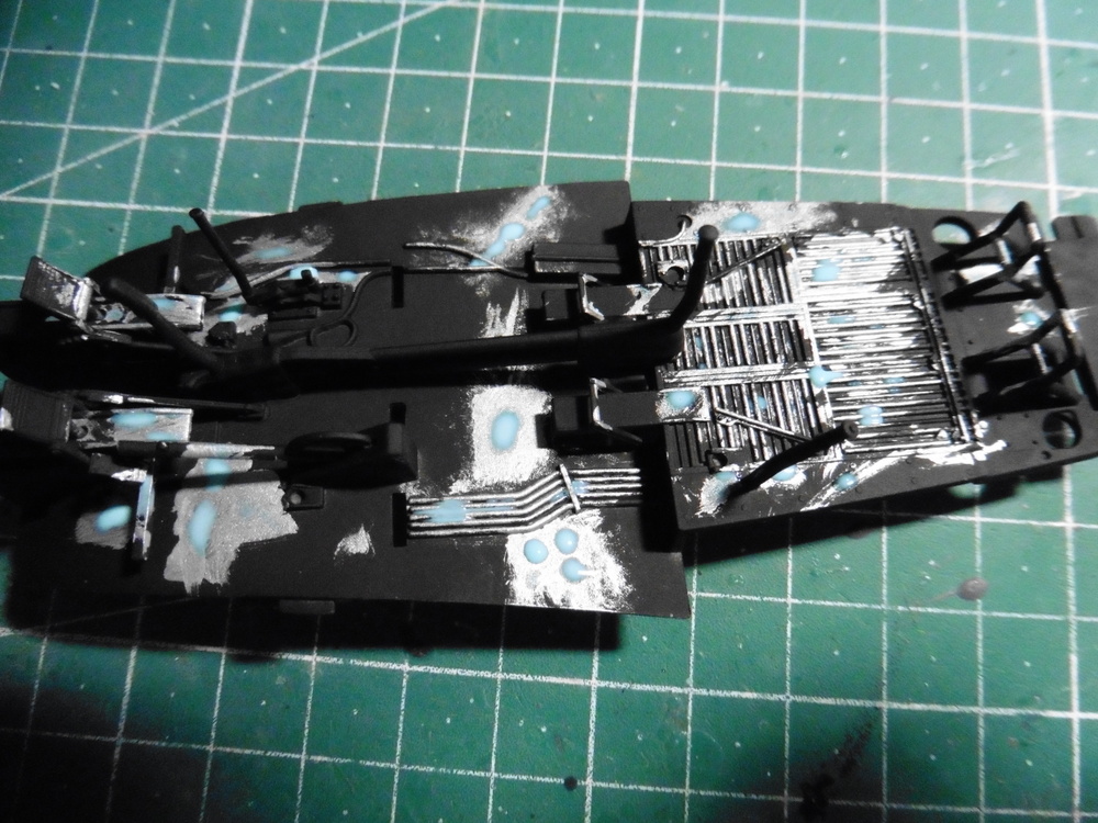 Als nächstes geht es darum , Abnutzungsspuren im Cockpit zu realisieren . Meine Vorgehensweise , die Bereiche , die sichtbare Abnutzungen haben sollen , werden mit Aluminiumfarbe gestrichen. Das ganze kann grob / großflächig gemacht werden .