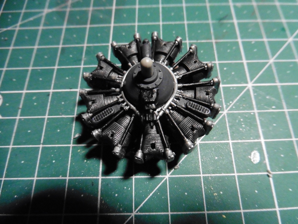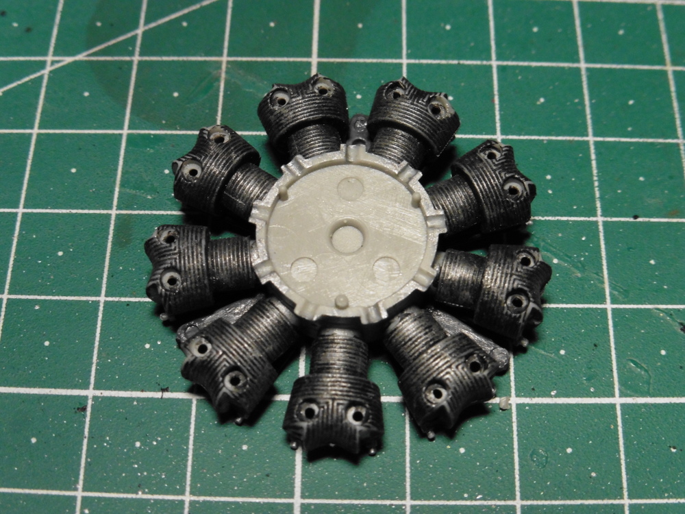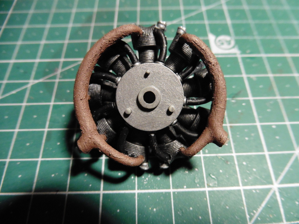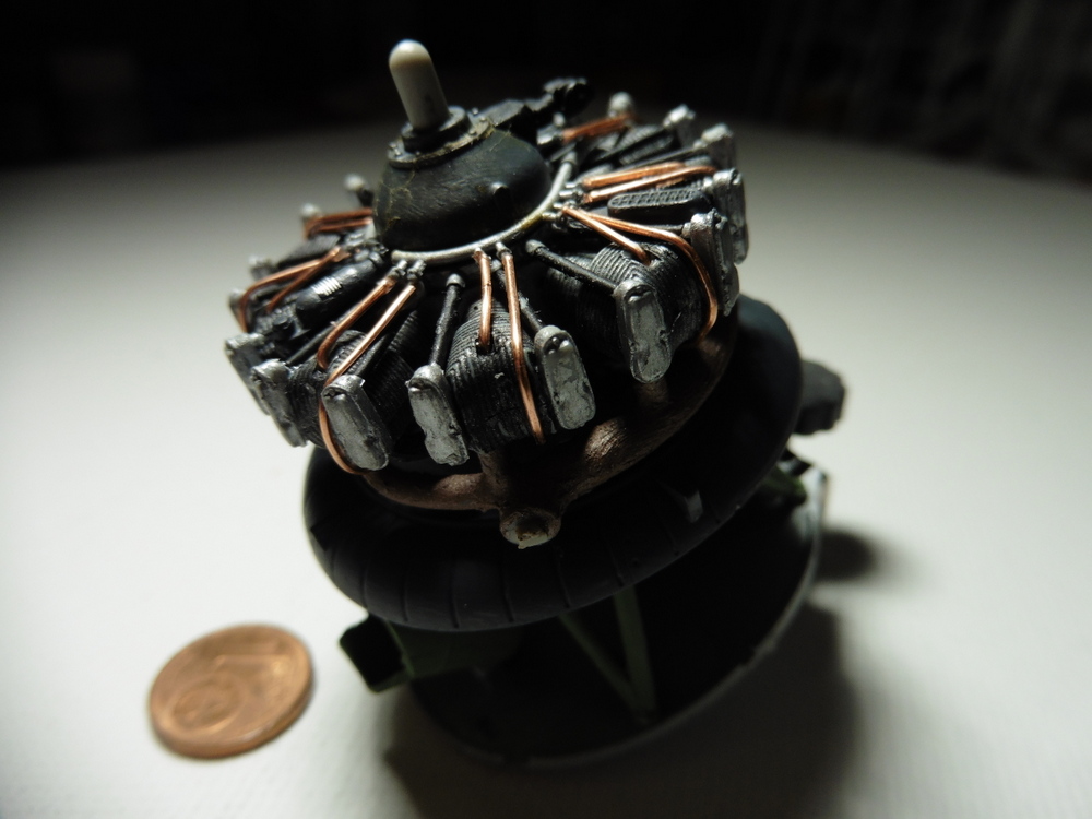 Der Motor wurde erst einmal schwarz gemacht . Dann habe ich mit Silber im Trockenmalverfahren die Lamellen hervorgehoben. Dann kamen alle anderen Bauteile drangeklebt. Hinter dem Motor wurde die Abgasrohre ausgeglüht bemalt (rostig ) und angebaut . Somit wäre der Motor eigendlich fertig gewesen . Leider oder zum Glück waren vorne in den Zylindern jeweils ein Loch für die Glühkerzen. Weder Kerzen noch kabel lagen dem Modell bei bzw gab es im Bauplan einen Hinweis wie zu verfahren wäre.