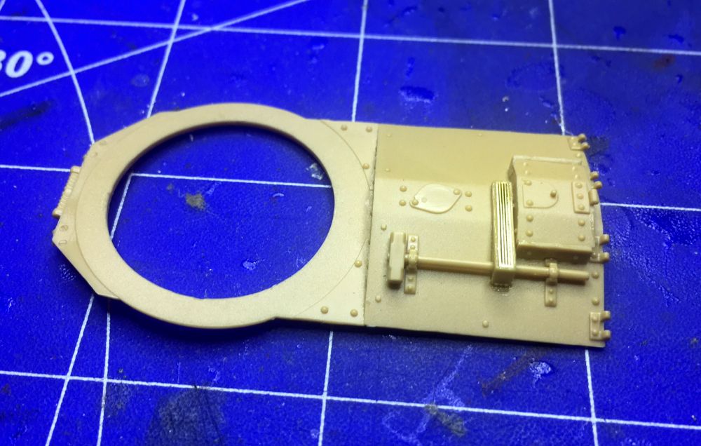 Die Turmteile sind nun alle verklebt. Beide Türen sind mit Abdeckband fixiert, damit die Innenseite mit der Airbrush grundiert werden kann. Auch der "Deckel in fertig. Die Waffe ist montiert, bleibt jedoch beweglich.
