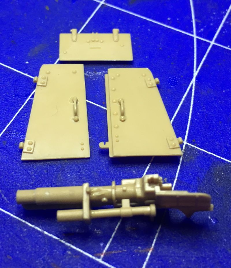 Die Klappen für den Fahrerplatz wurden mit Griffen versehen und mit dem Pinsel dünn grundiert. Danach kam dann Innenraumweiß und Alterung drauf. Alle erhabenen Stellen wurden natürlich wieder trocken gebürstet.. Die Waffe besteht bis hier aus 5 Teilen.